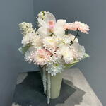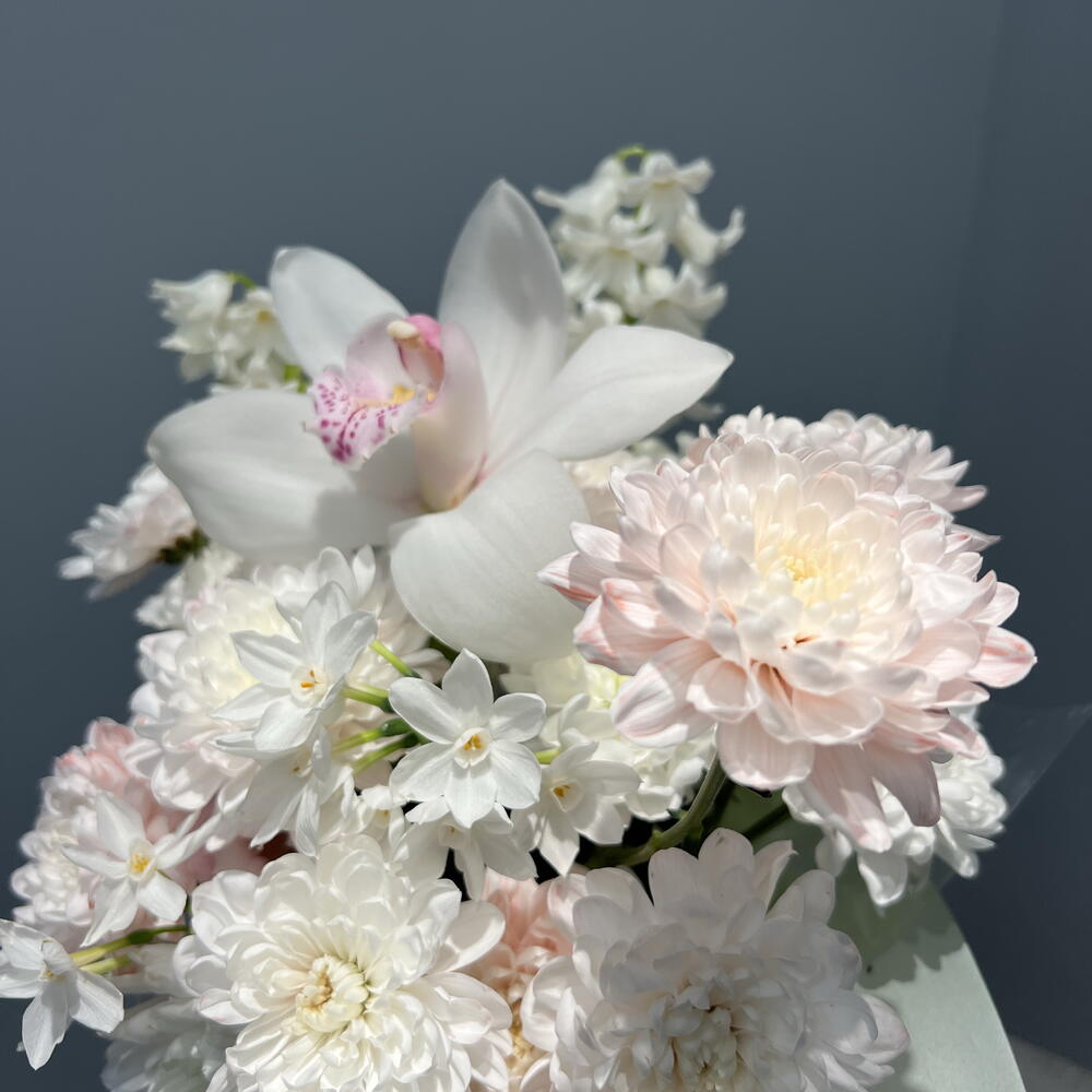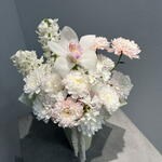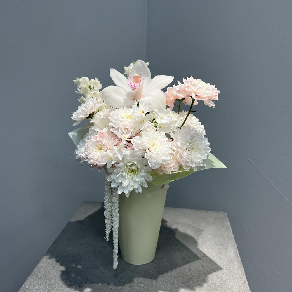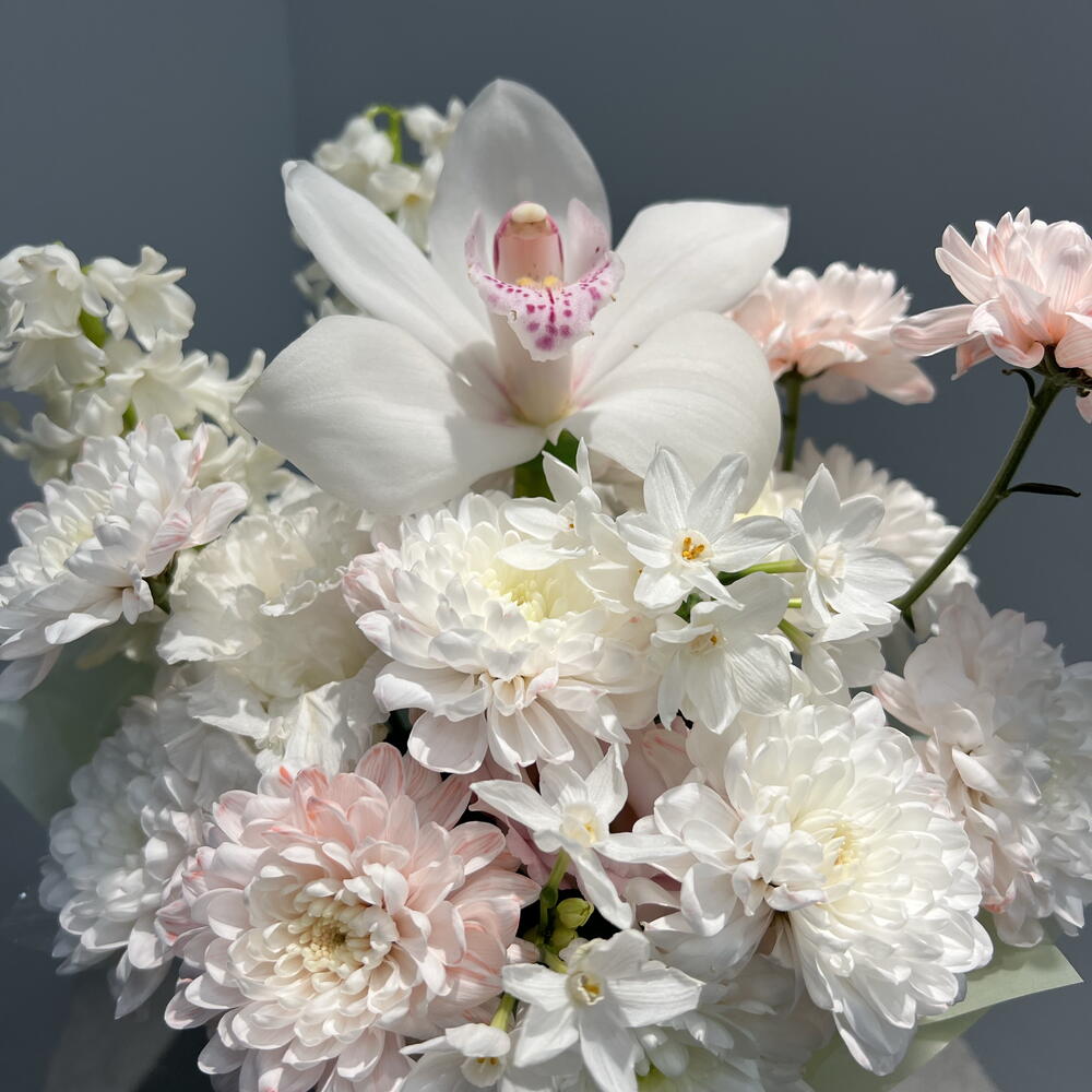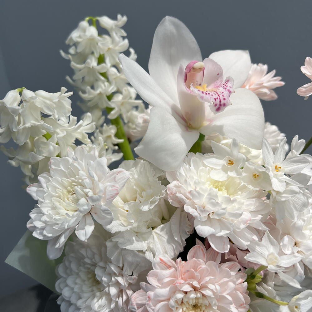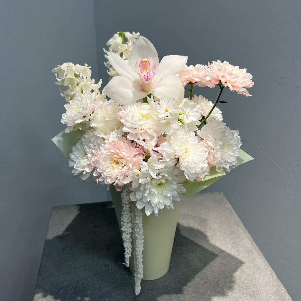 Хризантема кустовая - 2 шт. орхидея - 1 шт. Амарант - 1 шт. Оазис флористический - 1 шт. Гиацинты - 2 шт. коробка Стакан - 1 шт.