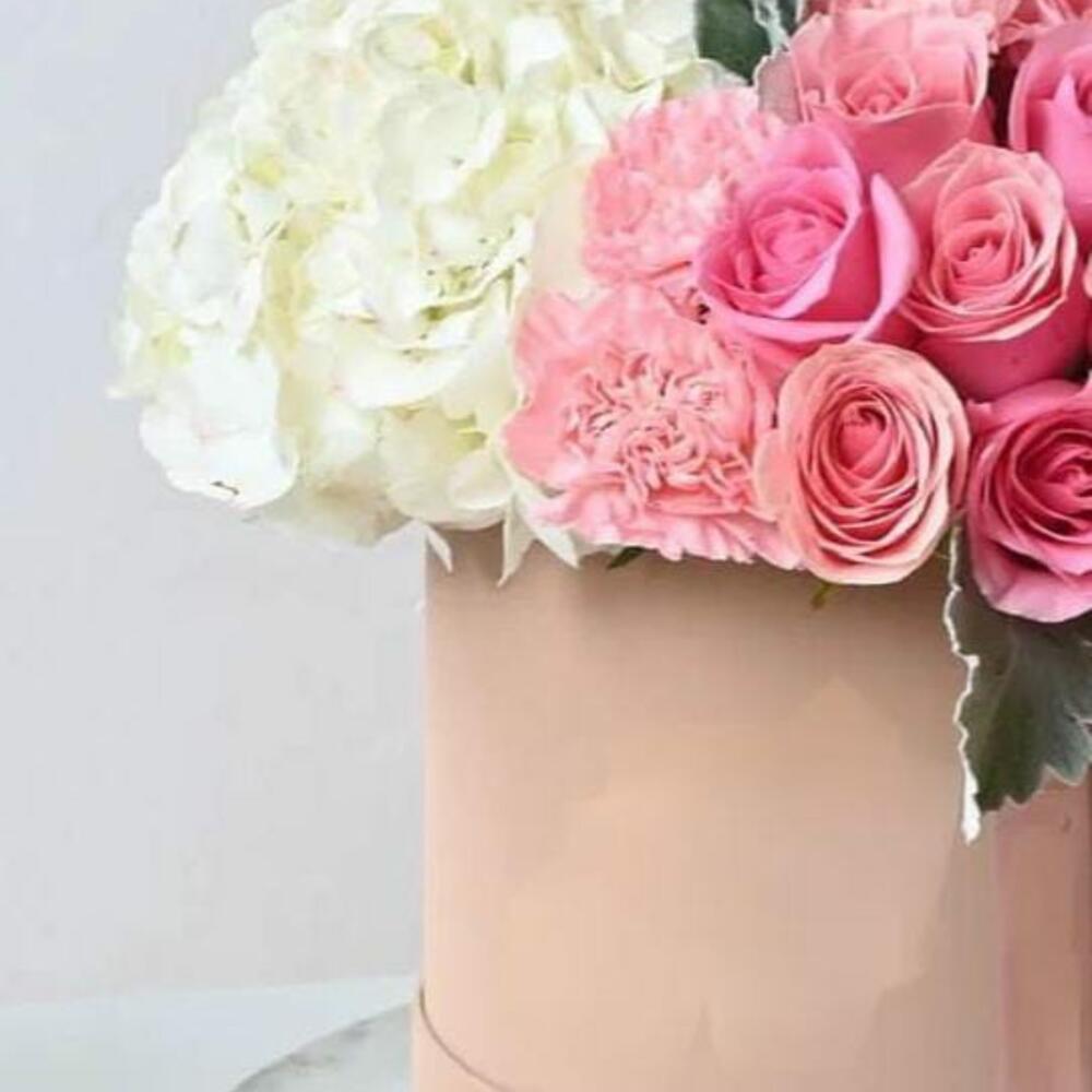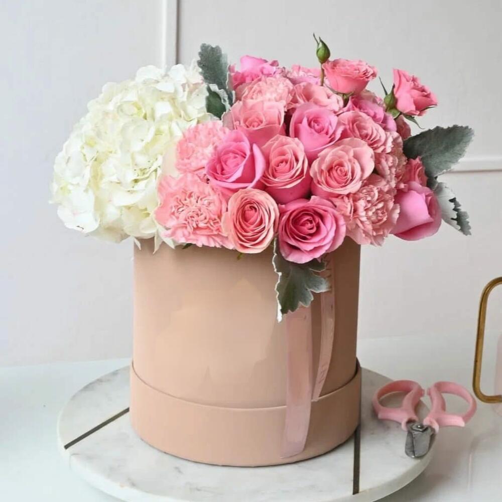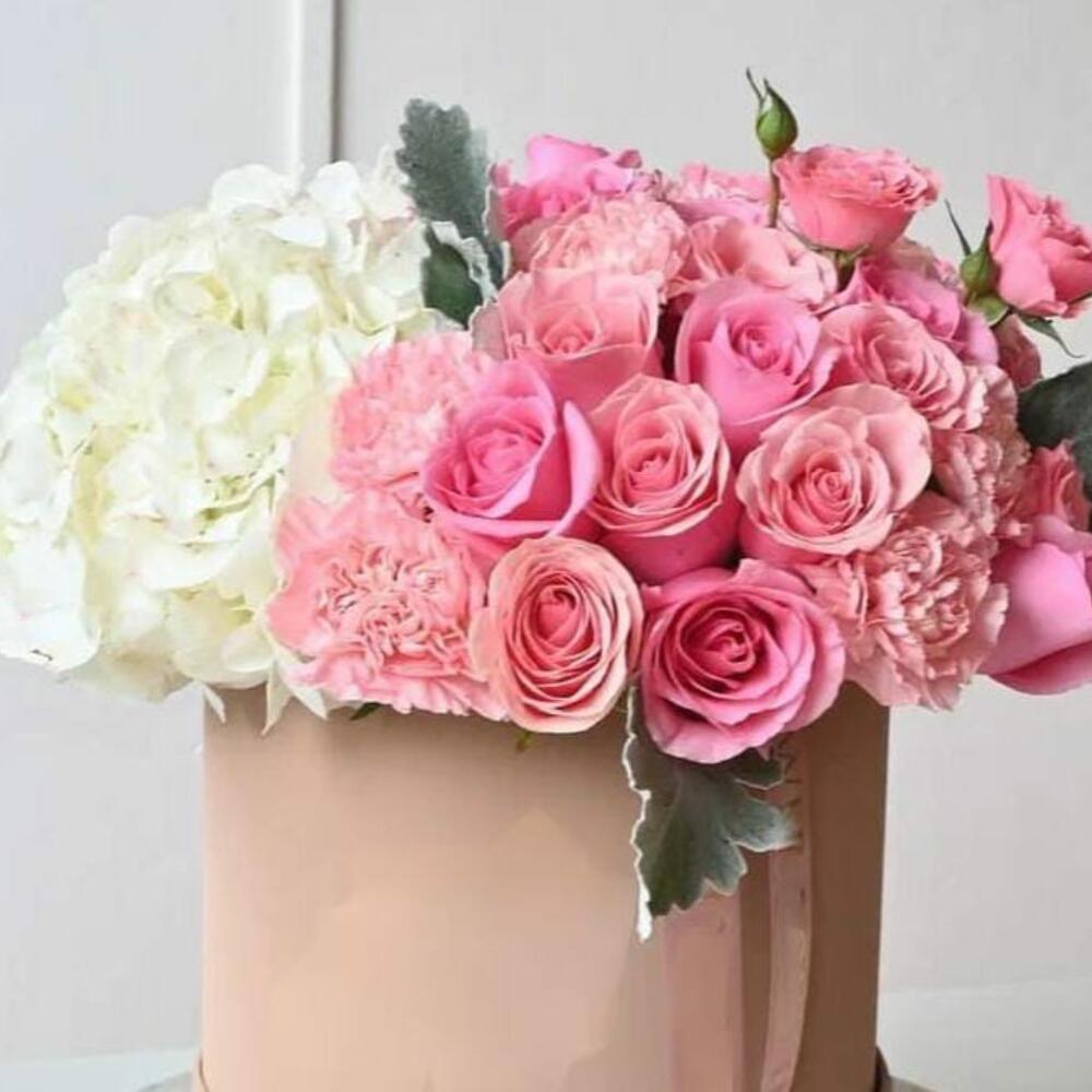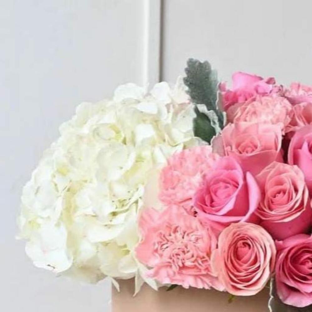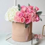 Гортензия - 1 шт. Роза кустовая - 1 шт. Гвоздика - 10 шт. Лента атласная - 1 шт. Коробка - 1 шт. Открытка - 1 шт. Роза одноголовая Микс - 20 шт. зелень декоративная - 4 шт. губка флористическая с водой - 1 шт. отличное настроение - 1000 шт.