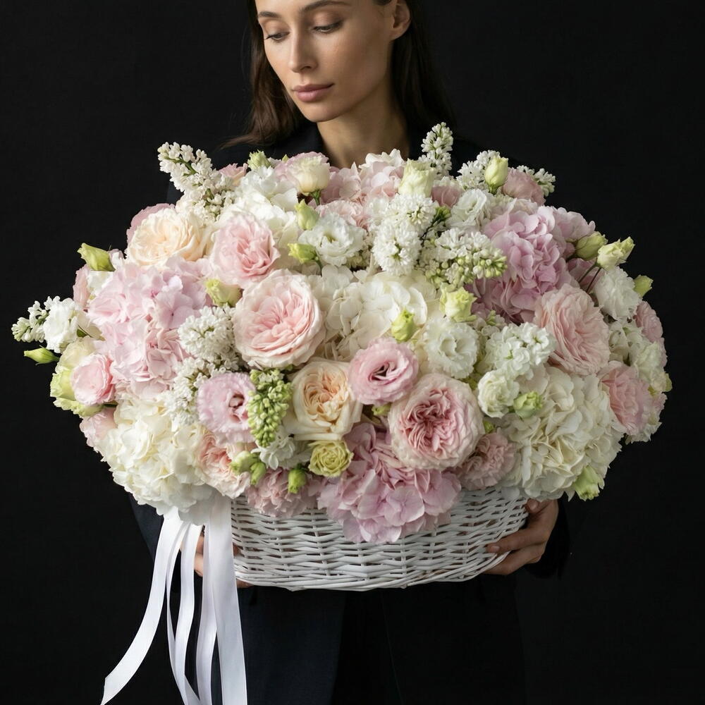 Нежная корзина с сиренью и пионовидными розами PREMIUM