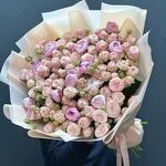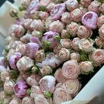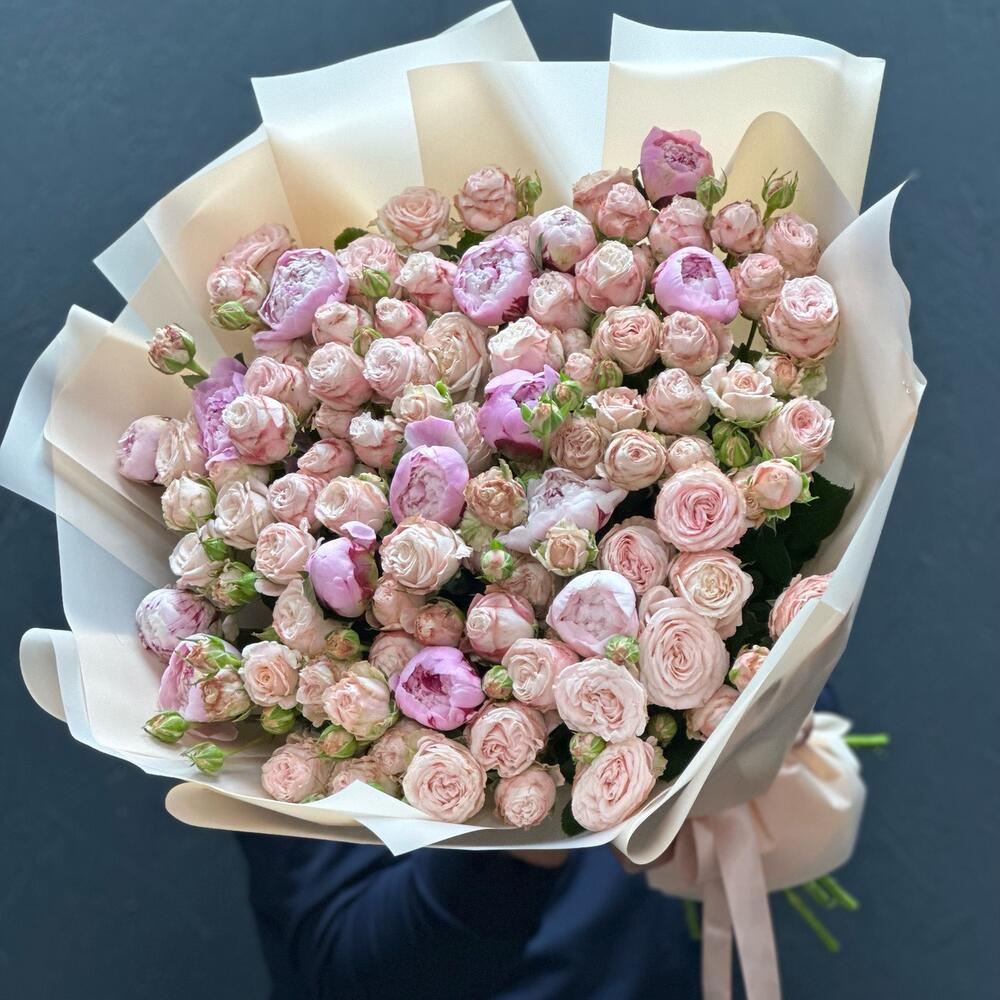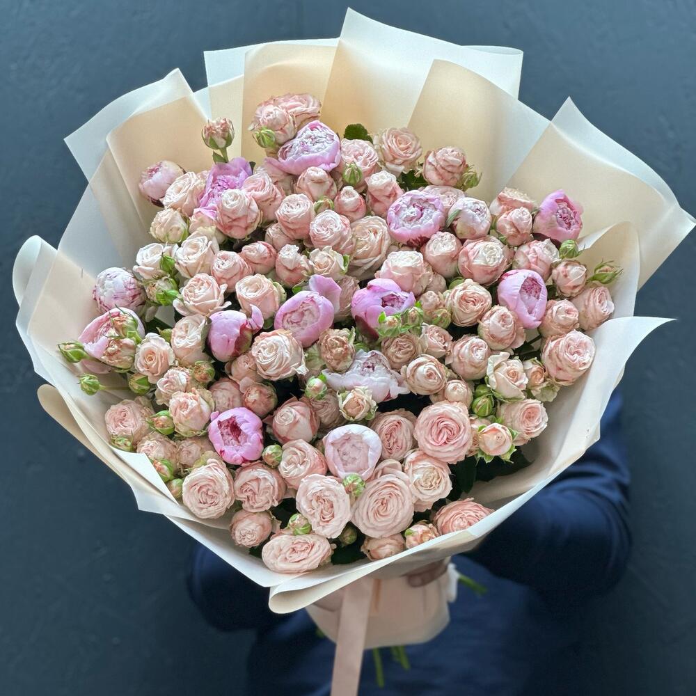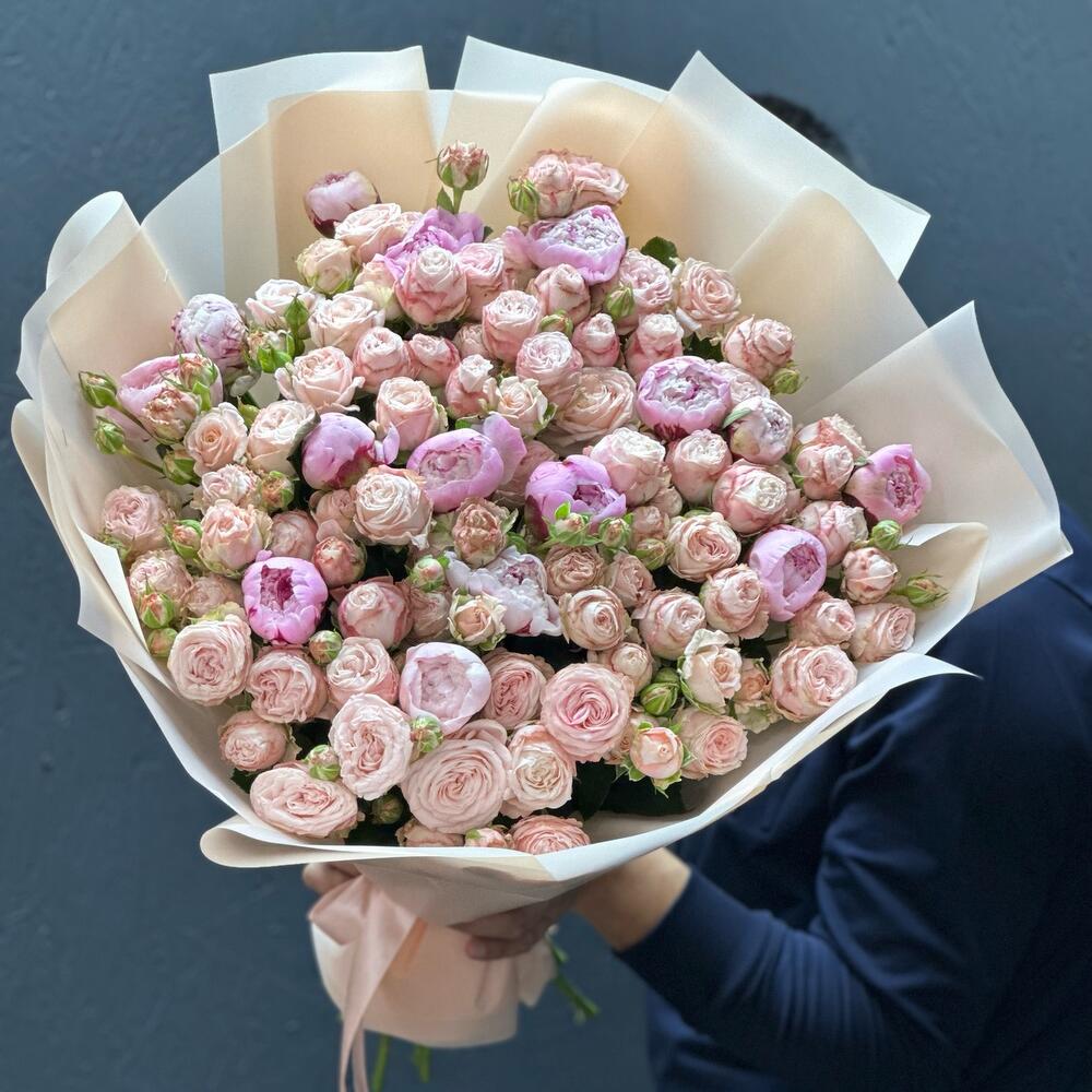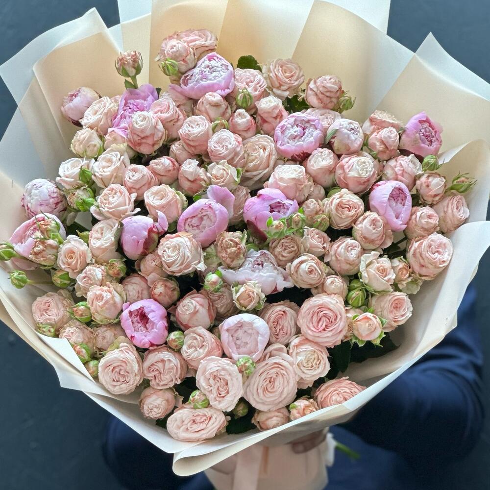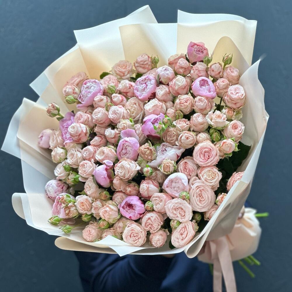 Лента атласная - 1 шт. Пион Сара Бернар - 20 шт. Пионовидная кустовая роза - 15 шт. Дизайнерская упаковка - 8 шт.