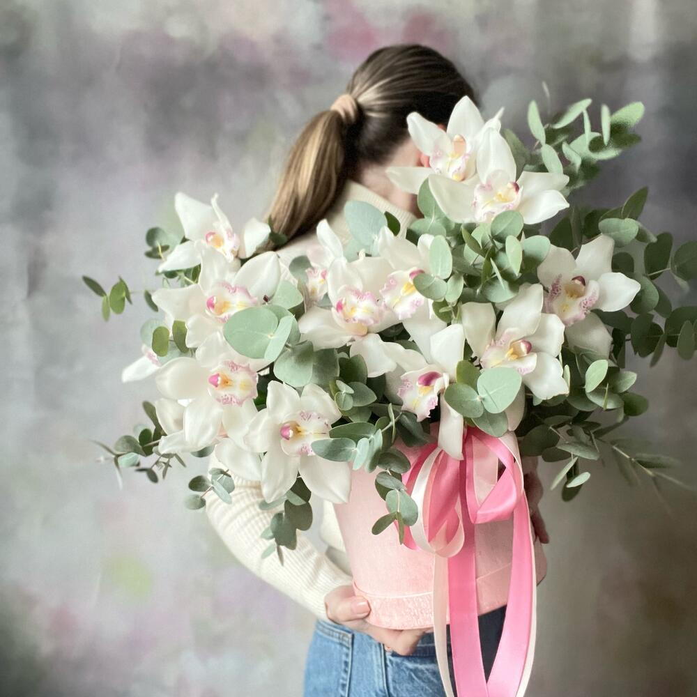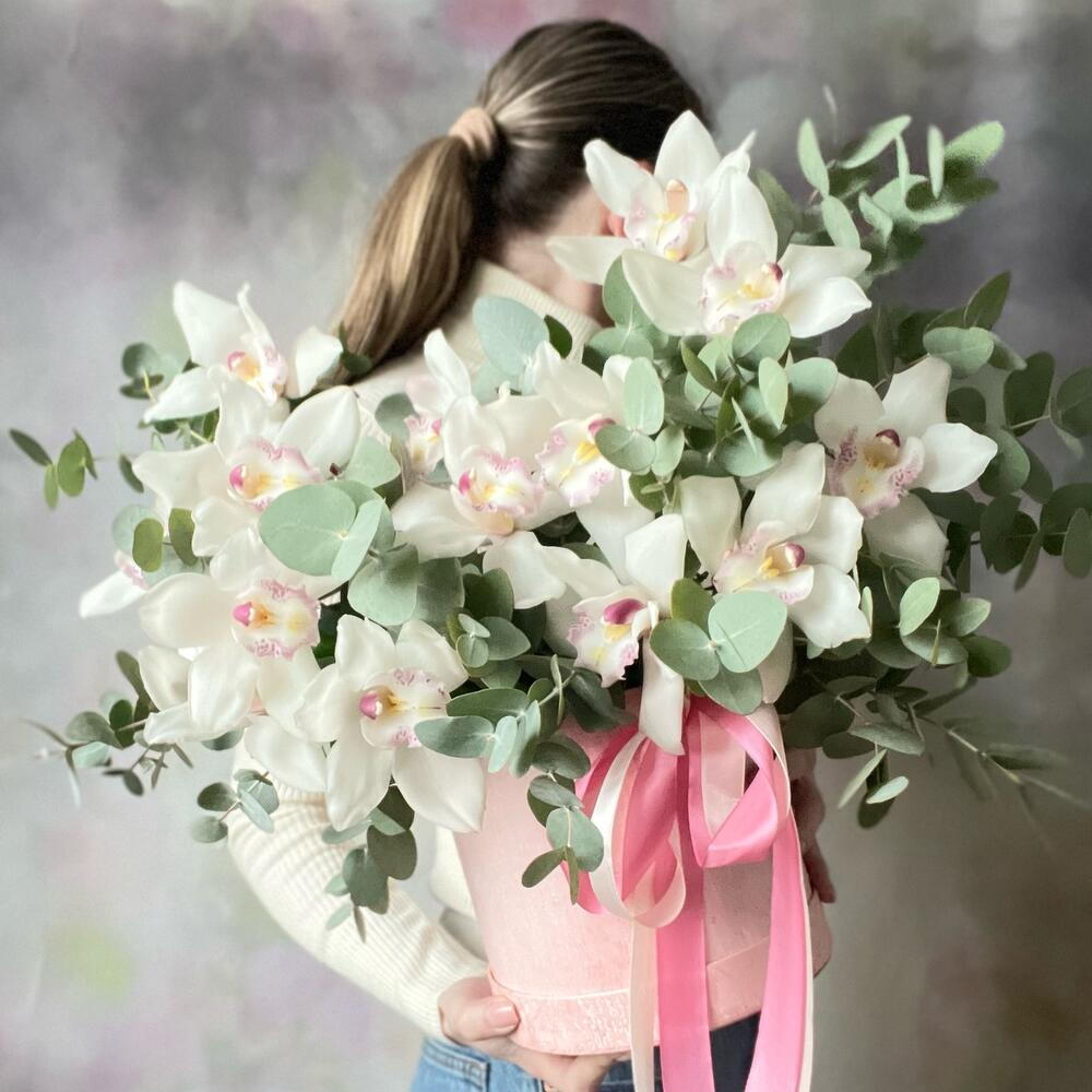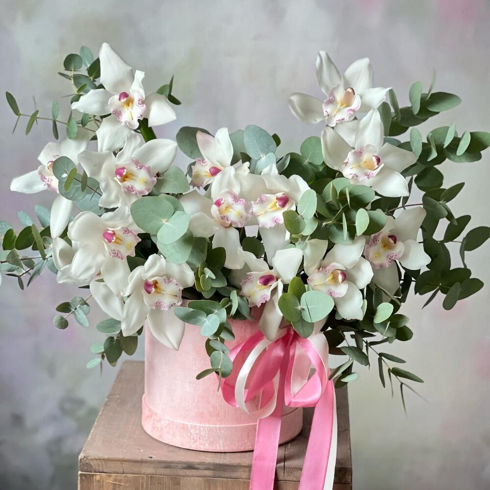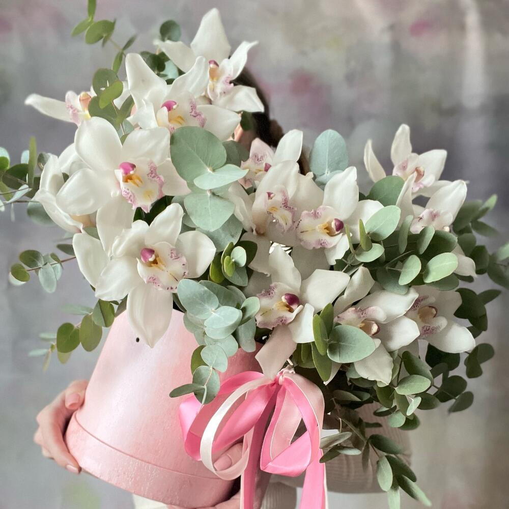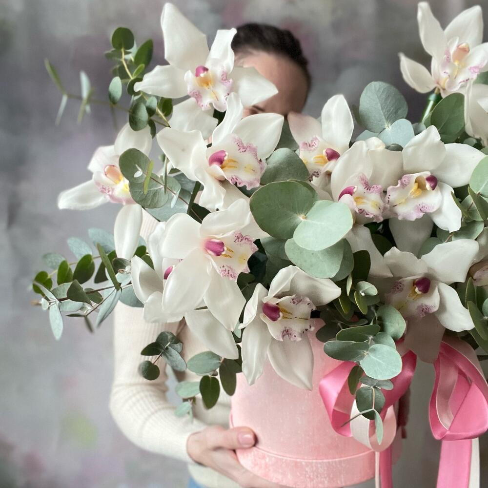 Орхидея Цимбидиум - 1 шт. Эвкалипт - 15 шт. Коробка шляпная - 1 шт. Губка флористическая - 1 шт.