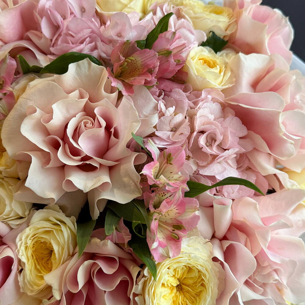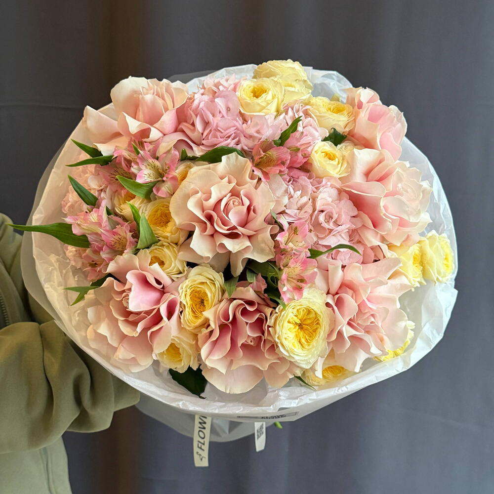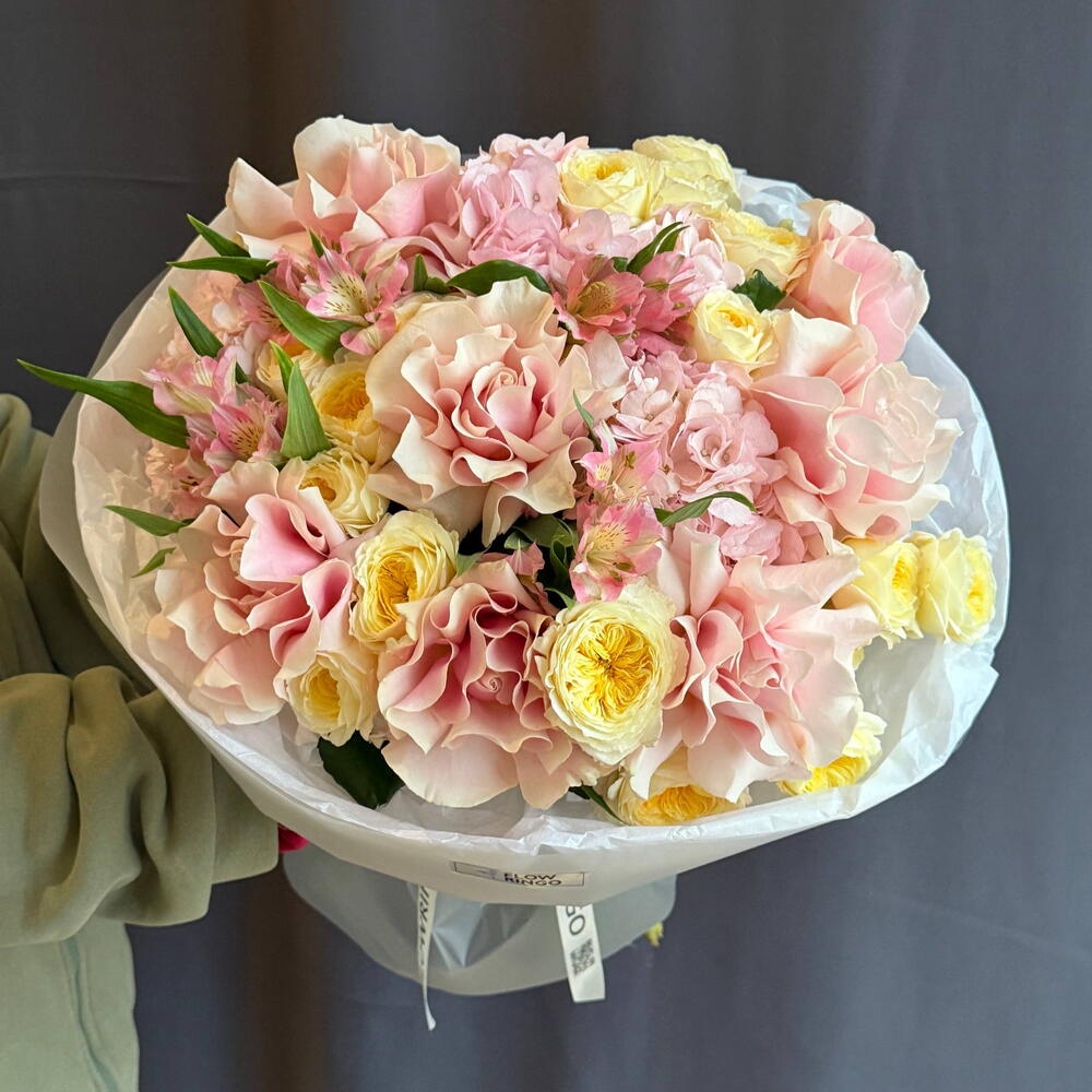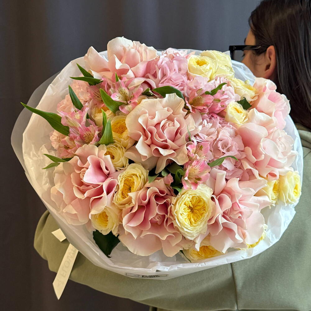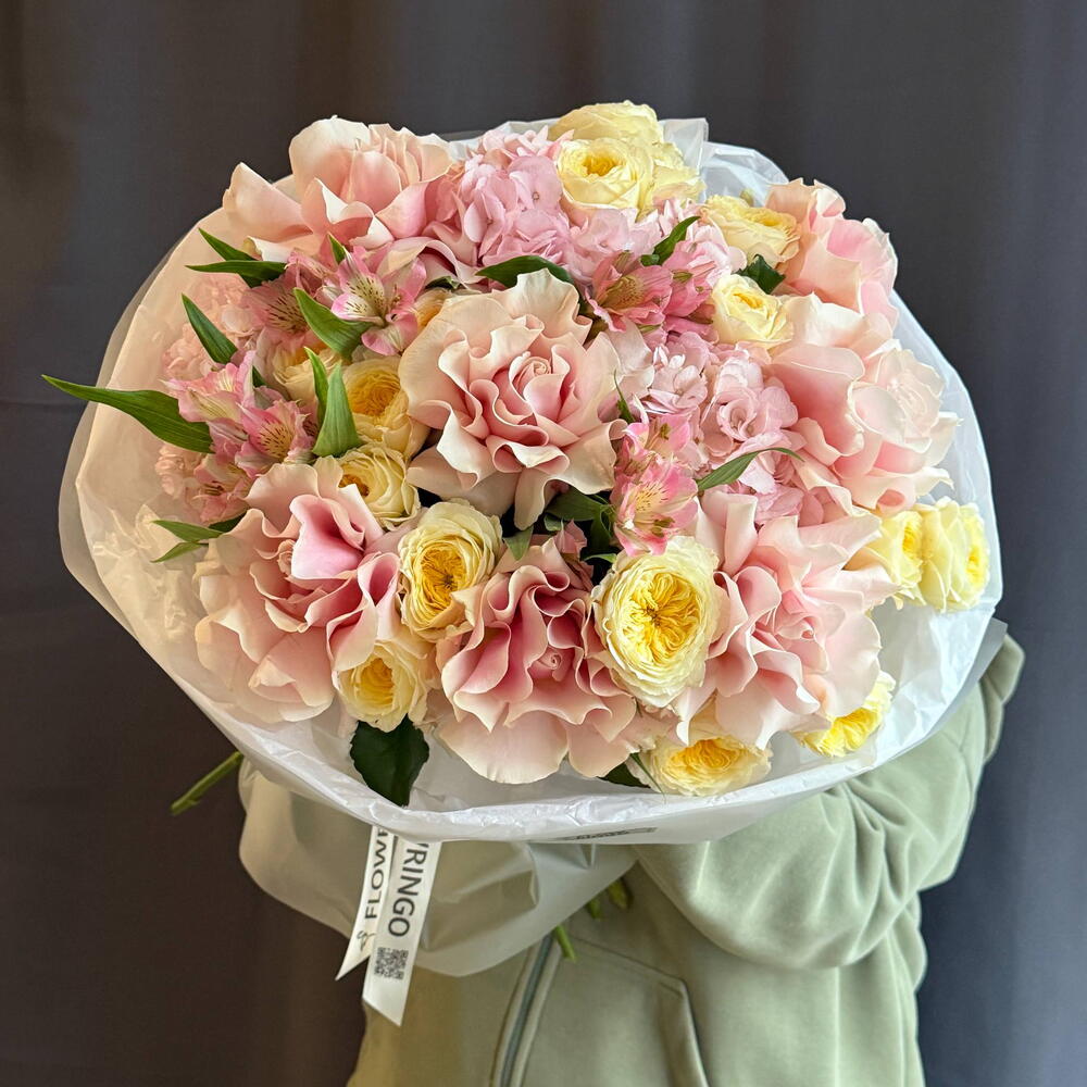 Альстромерия - 7 шт. Гортензия - 3 шт. Кустовая роза - 7 шт. Упаковка дизайнерская - 1 шт. Роза французская - 7 шт.