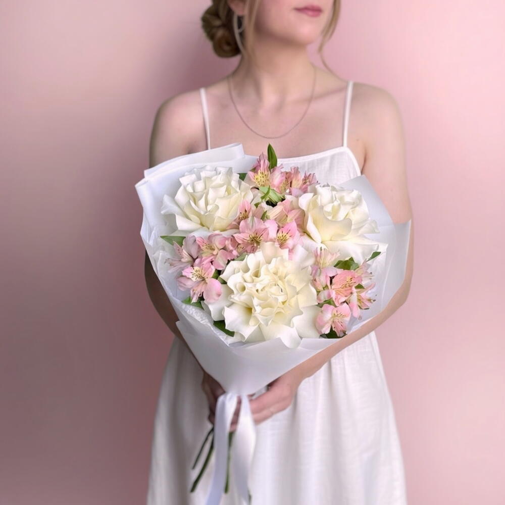 Нежный и изысканный дуэт. Белоснежные французские розы, символ чистоты и совершенства, дополнены лёгкими звёздами розовой альстромерии. Сочетание бархатной роскоши и хрупкой нежности создаёт воздушную, светлую и трогательную композицию, полную изящества и трепетной гармонии.