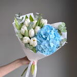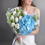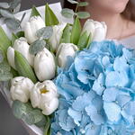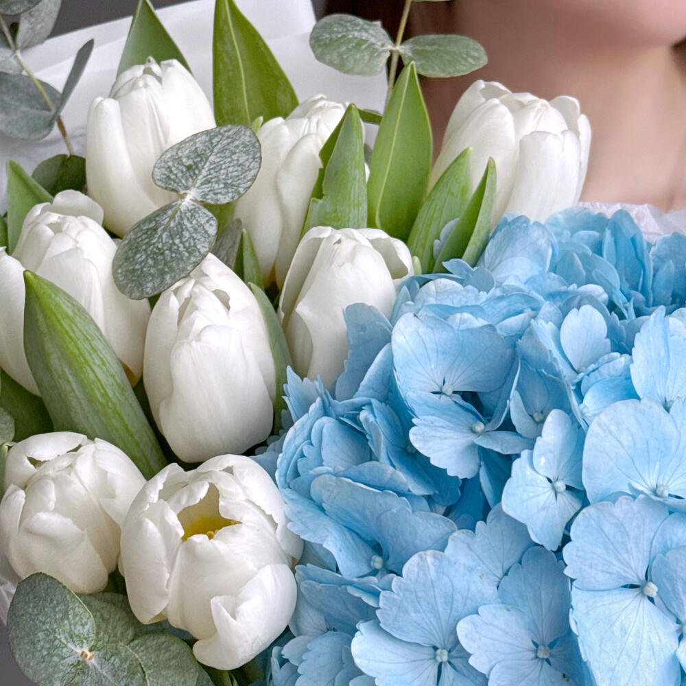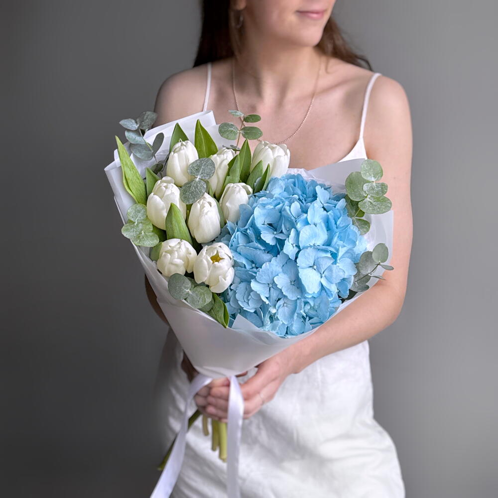 Нежный букет белые тюльпаны, голубая гортензия и эвкалипт