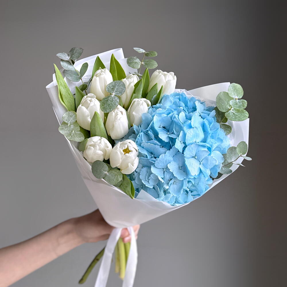 Эвкалипт - 4 шт. Гортензия голубая - 1 шт. Тюльпан белый - 8 шт.