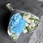 Нежный букет в пастельных тонах из белых тюльпанов, голубой гортензии и эвкалипта. Букет точно вызовет эффект Вау! Не забудьте подрезать цветы перед тем как ставить в вазу. Не храните букет на прямых солнечных лучах и возле отопительных приборов, чтобы сохранить цветы свежими как можно дольше. Обратите внимание на фото в полный рост и написанные размеры товара.