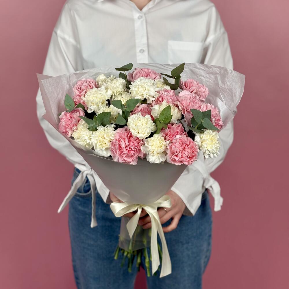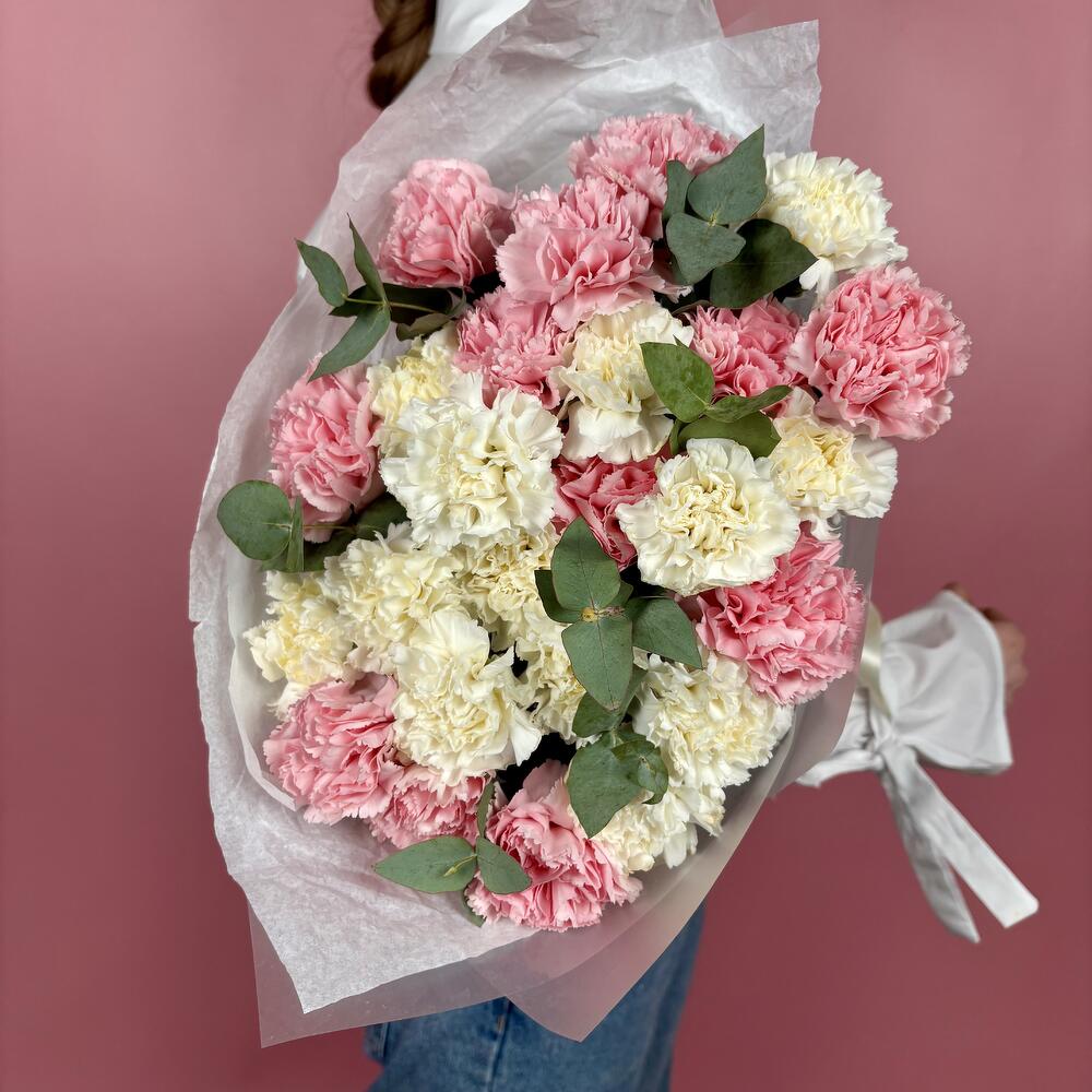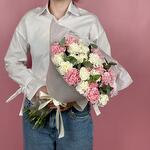 Нежный букет из белых и розовых диантусов наполнен очарованием и утонченностью. Пушистые цветы, отличающиеся своей изысканной текстурой, располагаются на изящных стеблях, создавая эффект нежности и грации. Белые диантусы символизируют чистоту, а розовые добавляют романтики и теплоты композиции. Упаковка подчеркивает элегантность букета, придавая ему стильный и завершенный вид, который гармонично отражает всю его красоту. Букет, который отлично подойдет в подарок на 8 марта, день рождения, для мамы, бабушки, девушки или сестры 💕 Как сохранить свежесть букета дольше: ✅Подрежьте стебли цветов секатором или острым ножом ✅Поставьте их в вазу с большим количеством холодной воды, в которую добавлено средство для цветов ✅Подрезайте цветы и меняйте воду каждый день ✅Не ставьте цветы около отопительных приборов или на сквозняке Также в дополнение к букету Вы можете приобрести у нас открытку.