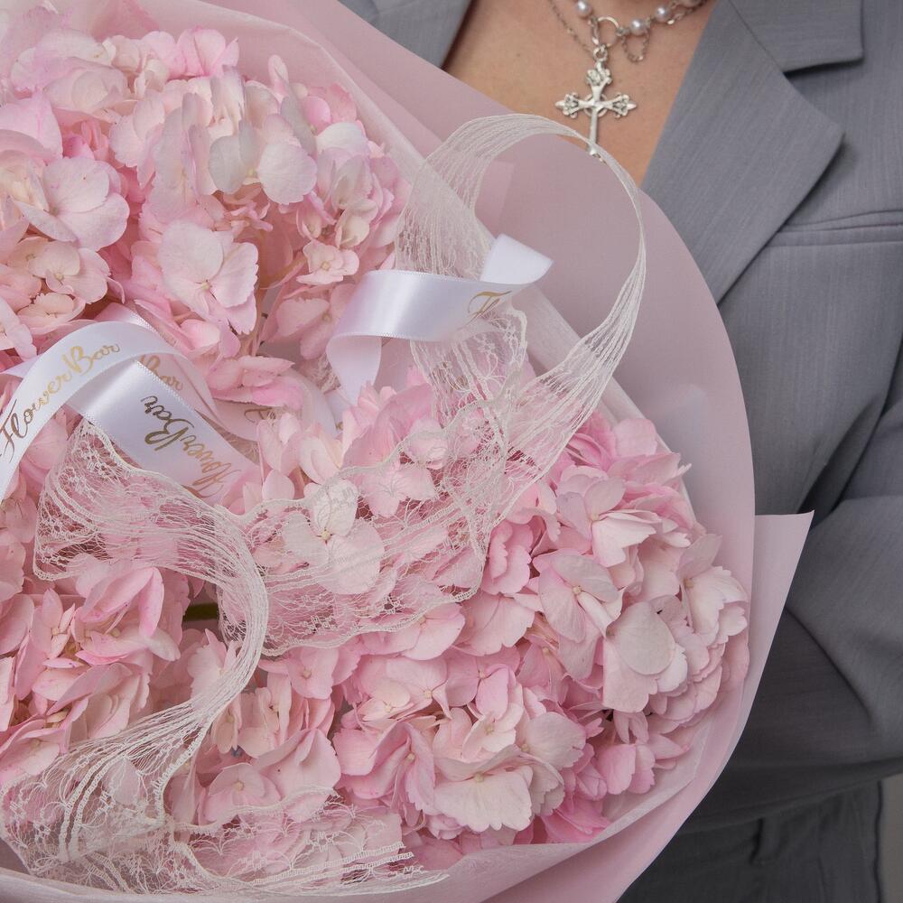 Лента атласная - 4 шт. Фирменная упаковка - 1 шт. Гортензия розовая - 3 шт. подкормка для срезанных цветов - 1 шт. инструкция по уходу за цветами - 1 шт. транспортировочный бокс с водой - 1 шт.