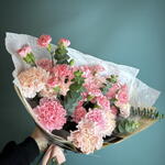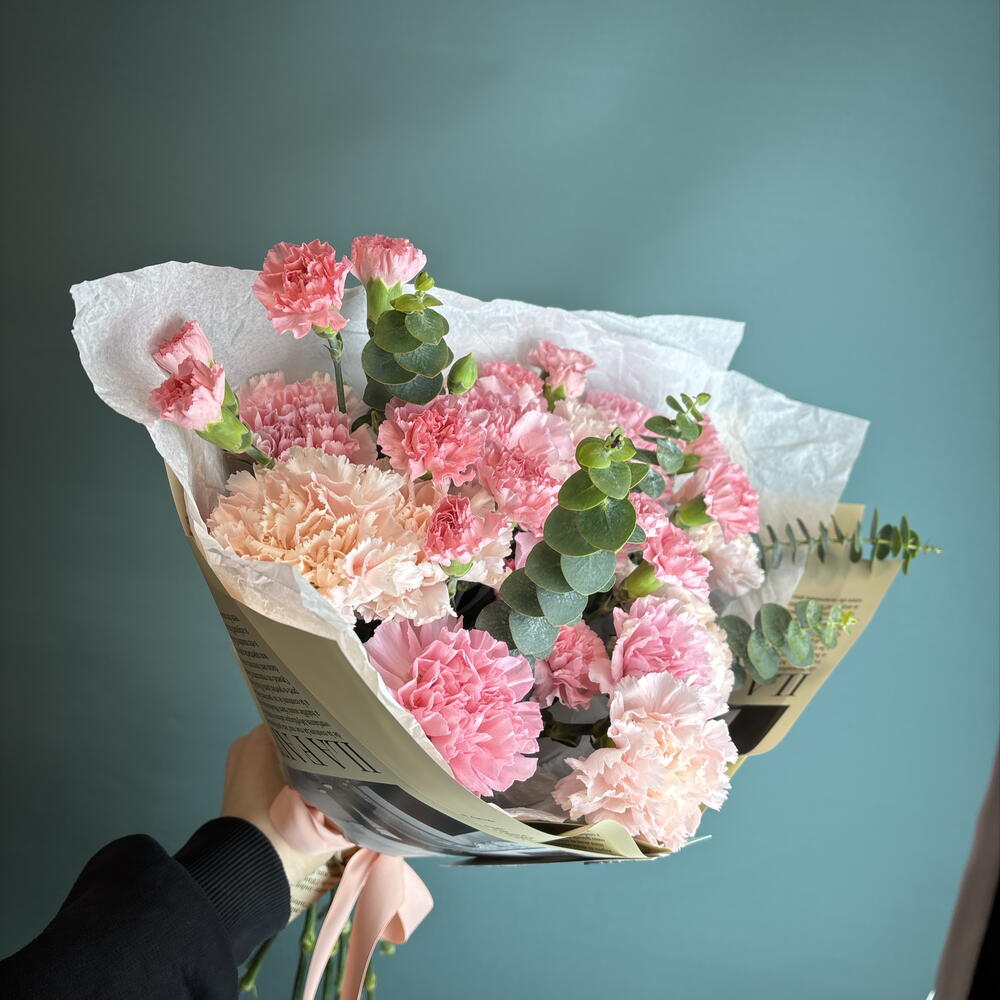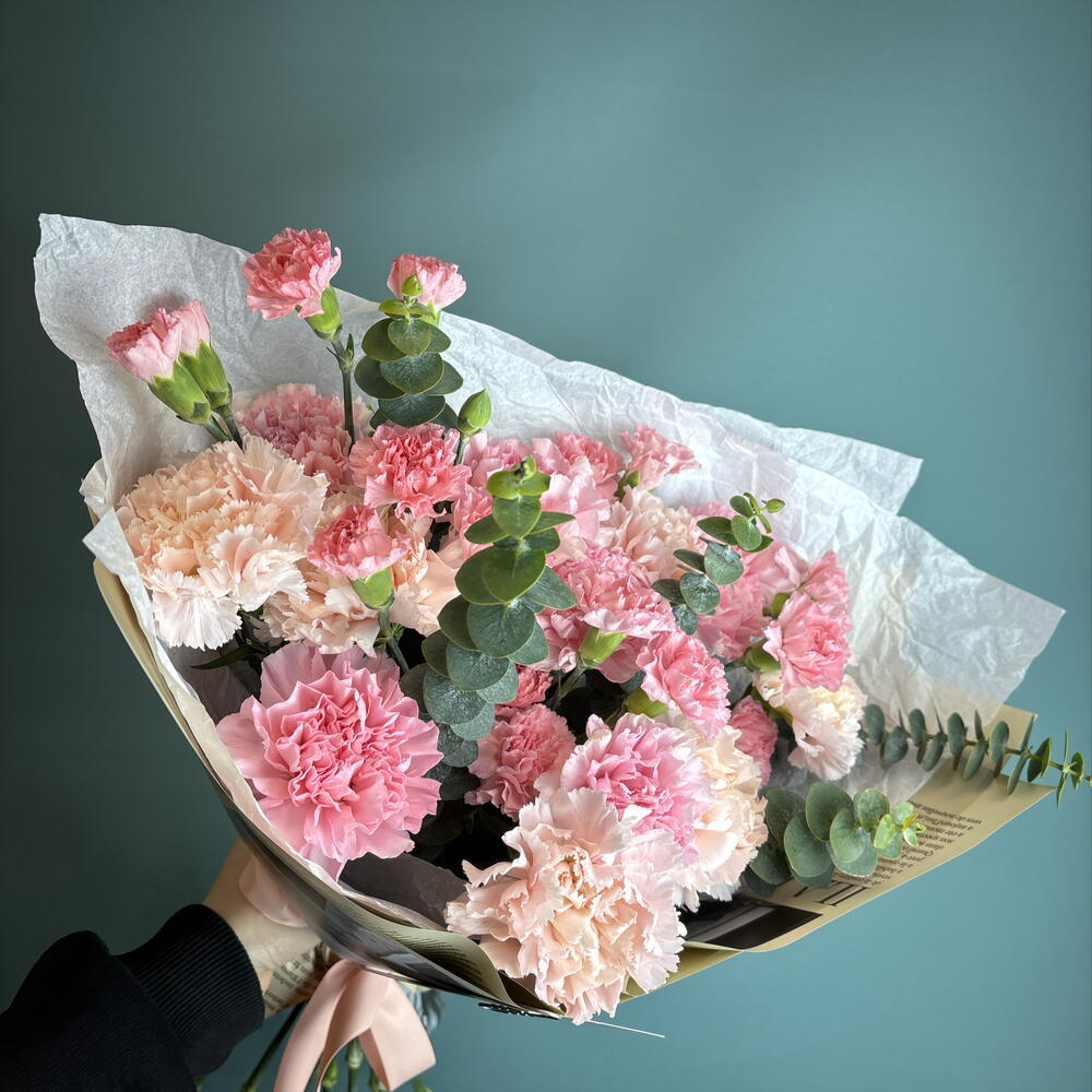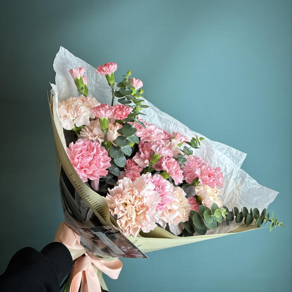 Эвкалипт - 1 шт. Упаковка дизайнерская - 1 шт. Диантус кустовой - 6 шт. Диантус сортовой - 13 шт. аквабокс с водой - 1 шт.