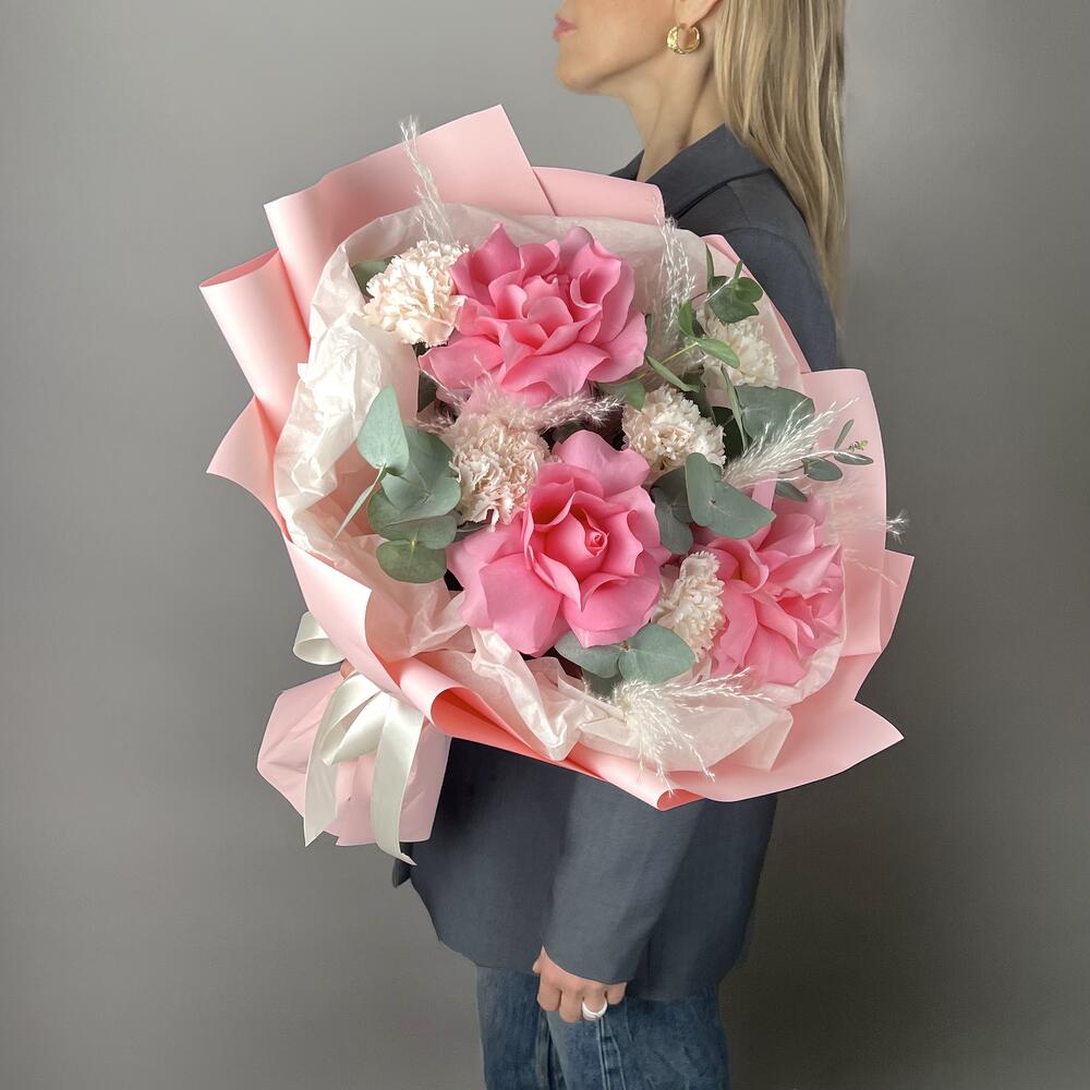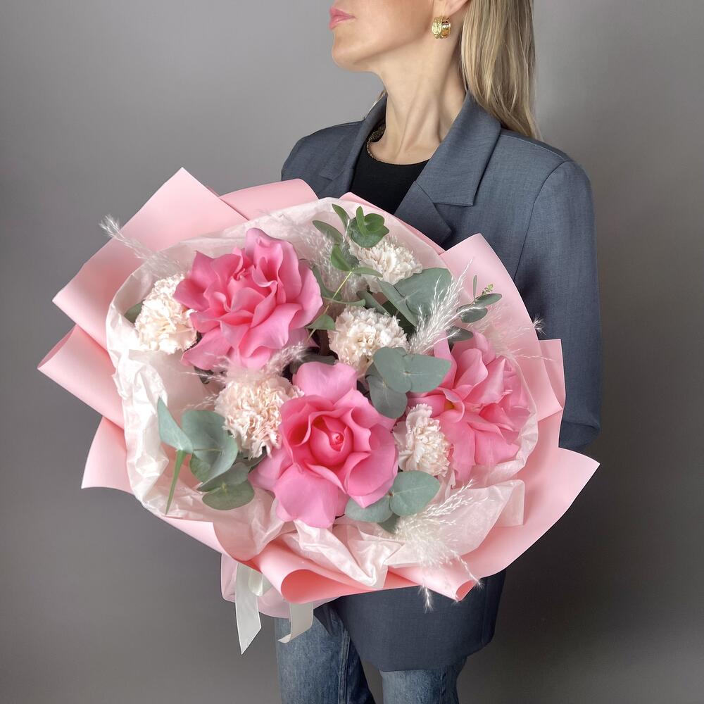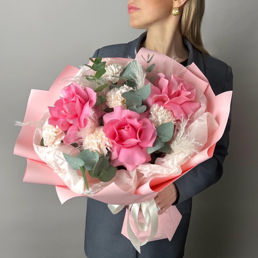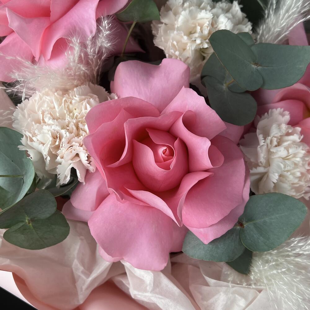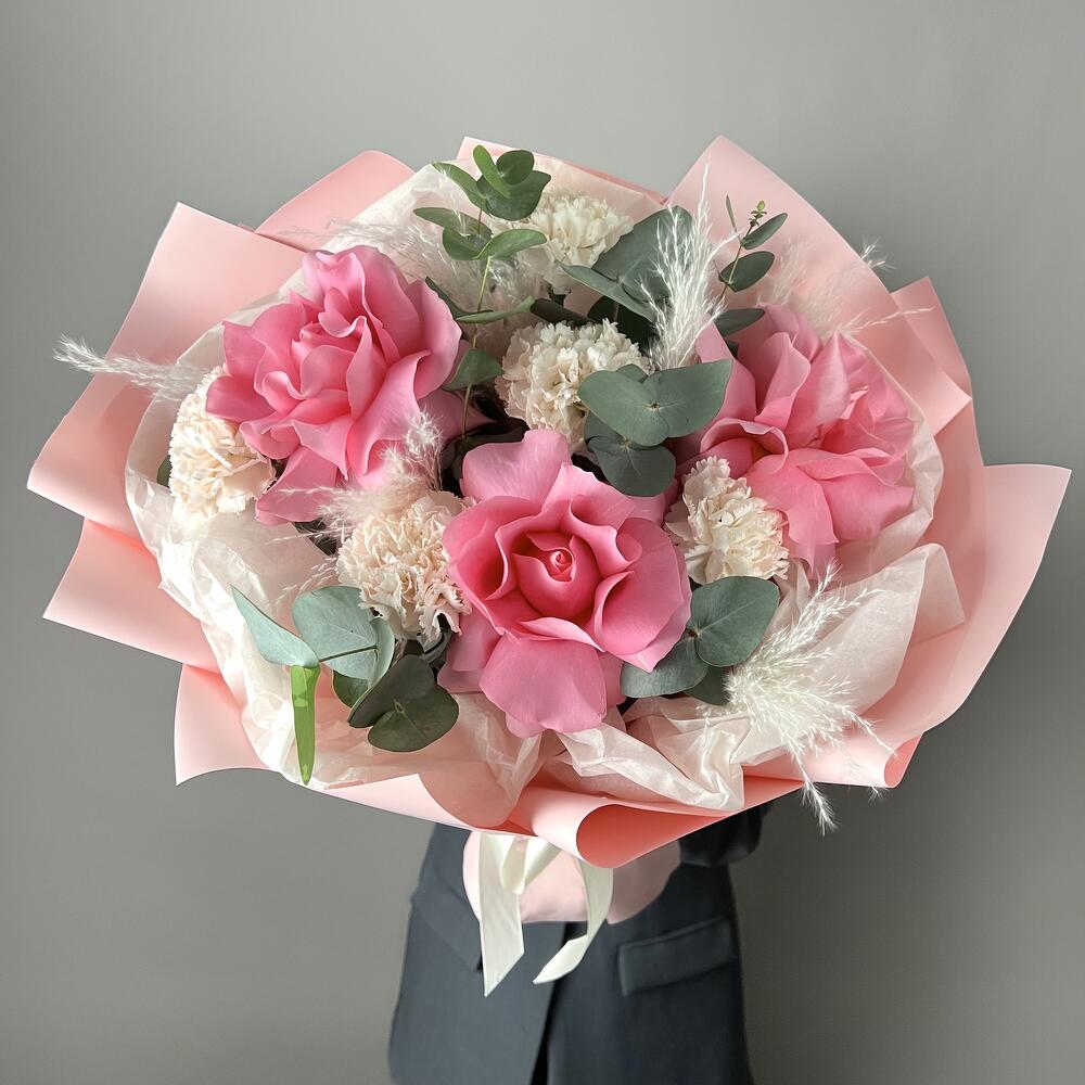 Красивый нежный букет из французской Розы сорта Лучано и кремовых диантусов брют, в сочетании с ароматным эвкалиптом! Замечательный подарок для любимой жены, подруге, маме, коллеге! ❤️