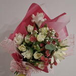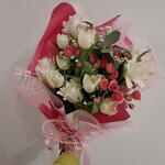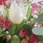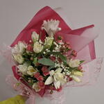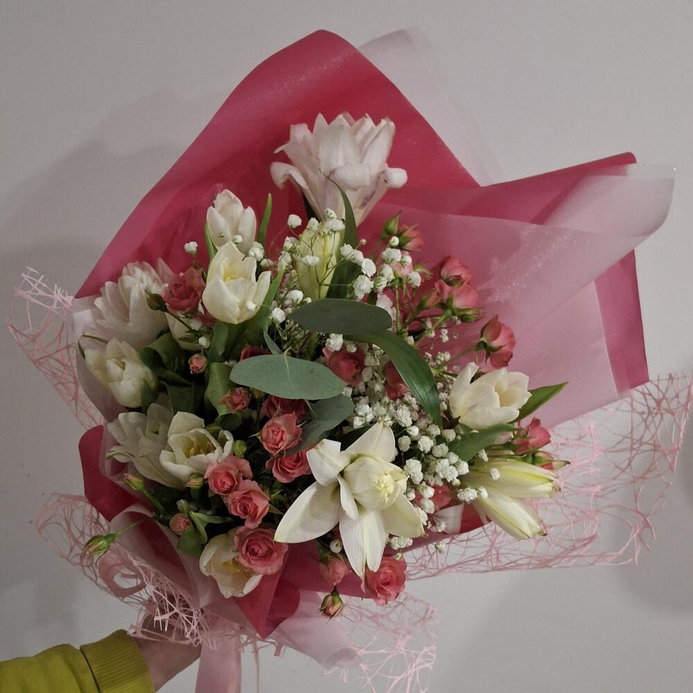Роза кустовая розовая - 3 шт. Лилия Белая - 2 шт. Тюльпан белый - 7 шт. упаковка дизайнерская с лентами - 1 шт. гипсофила цветная микс - 3 шт.