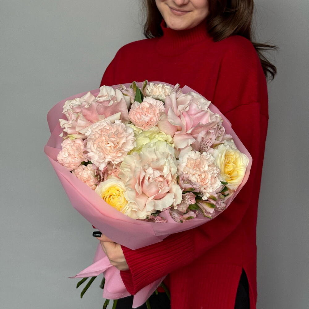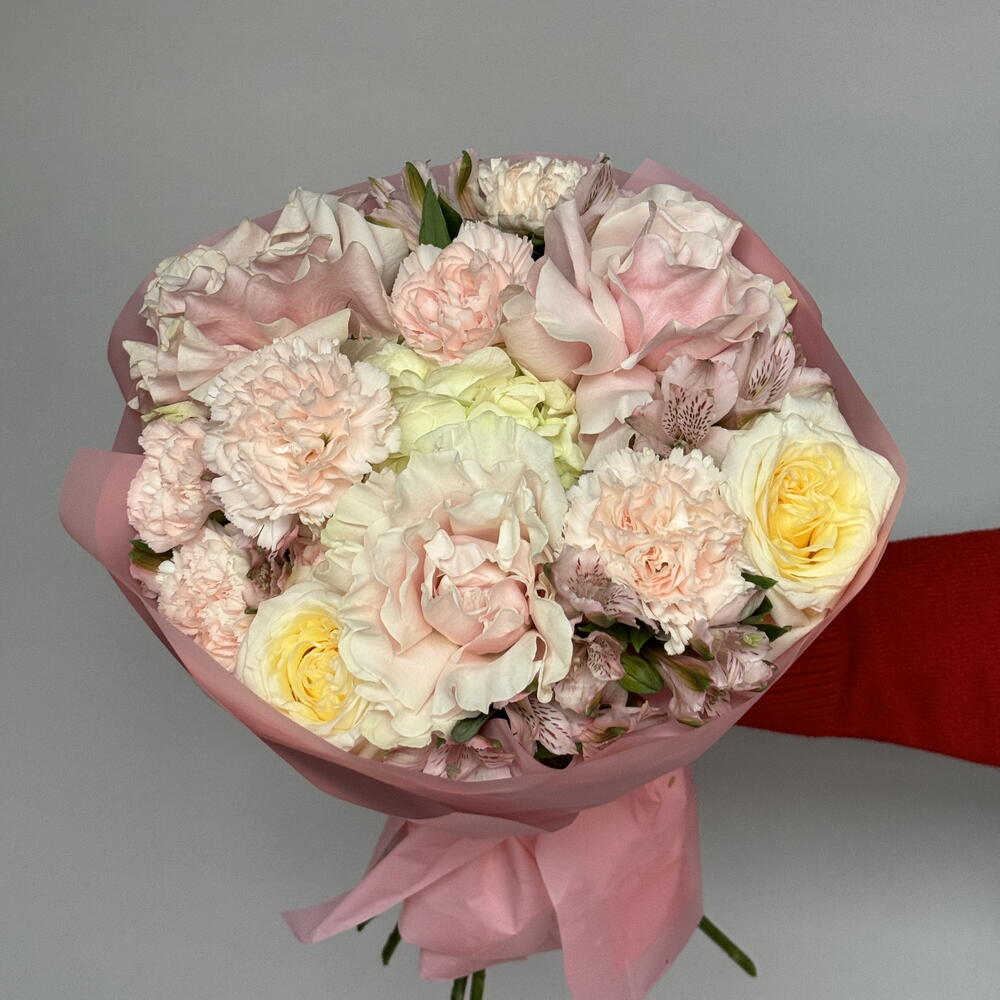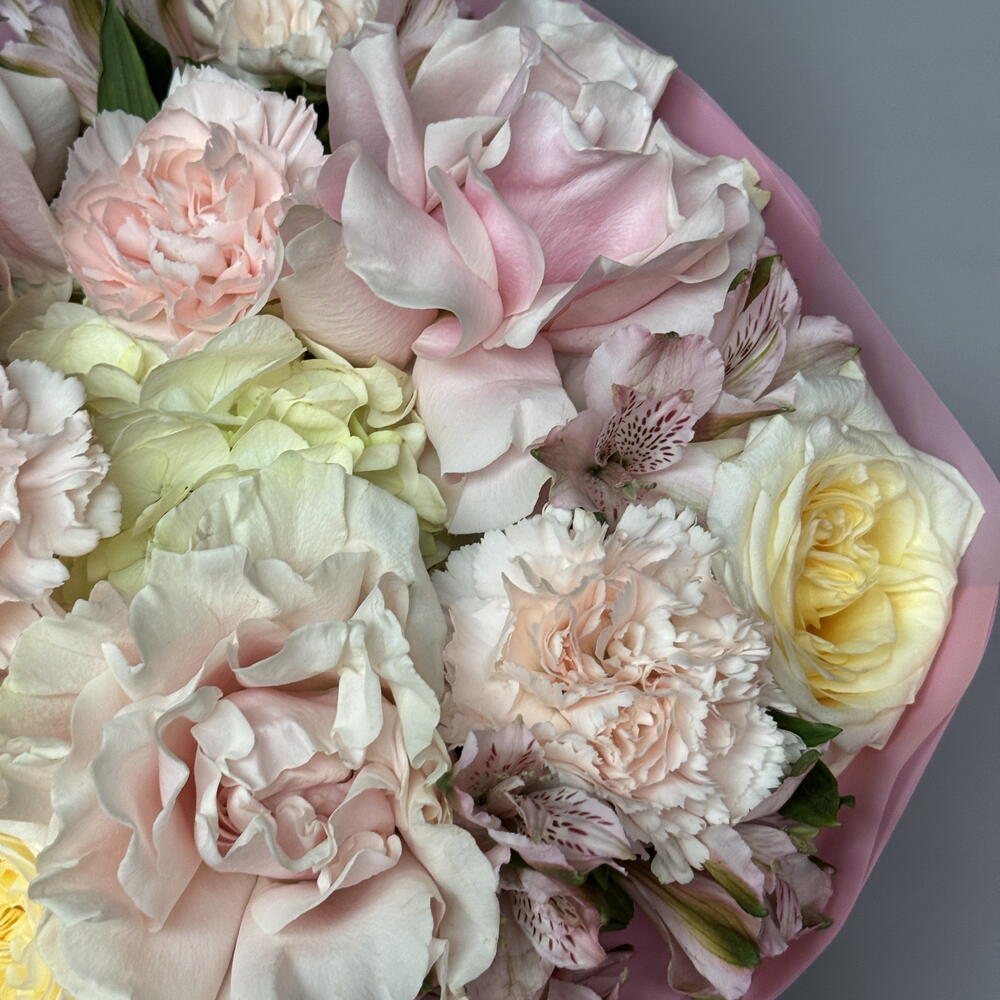 Нежный букет с французской розой, пионовидной розой, гортензией, альстромерией