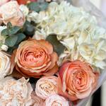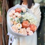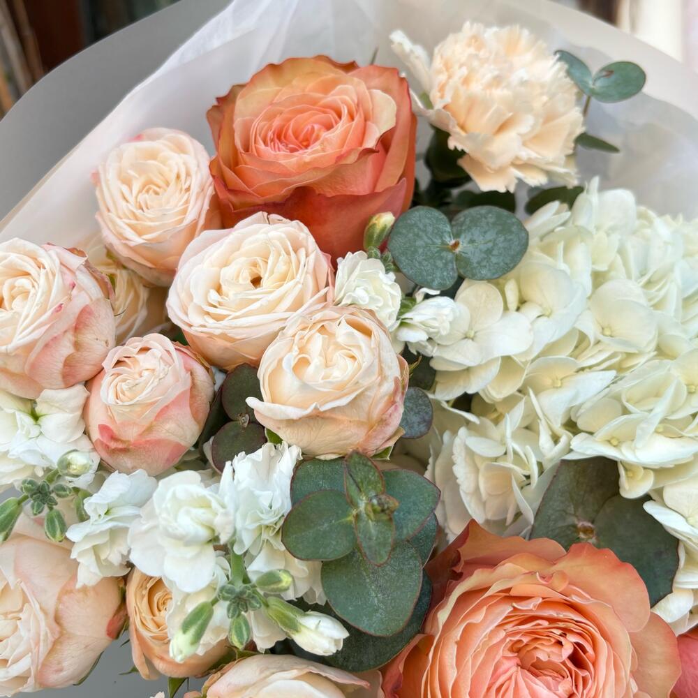Гортензия - 1 шт. Маттиола - 1 шт. Эвкалипт - 3 шт. Лента атласная - 1 шт. Тишью - 2 шт. Диантус - 3 шт. Роза пионовидная - 3 шт. Роза кустовая пионовидная - 3 шт. Пленка матовая - 4 шт. зелень декоративная - 3 шт.