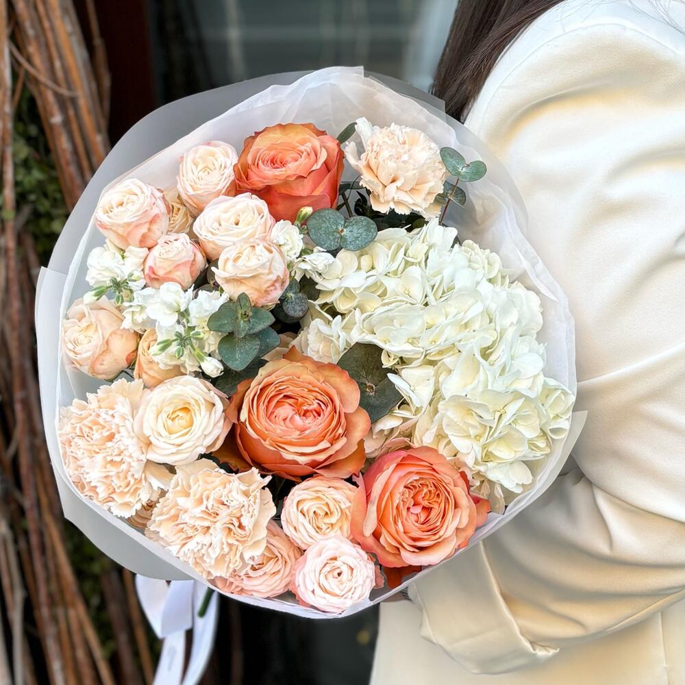 Этот букет — утонченное сочетание лаконичности и элегантности. Белая гортензия трепетно раскрывается в сердце композиции, а кремовые диантусы и кустовые розы окружают ее теплотой и нежностью. Белая маттиола вносит ароматный акцент. А оранжевые розы Кахала — словно яркое горячее солнце, придают букету изысканные ноты и современные штрихи. Идеально для тех, кто ценит стиль, утонченную красоту и немного романтики без лишней сладости. Этот букет прекрасно подойдет для любого особого случая — будь то романтический ужин, важная встреча или просто желание порадовать близкого человека. Его сдержанная элегантность и нежная романтика подчеркнут ваше внимание и глубину чувств. Отличный выбор для того, чтобы сделать любой день особенным, будь то 14 февраля, 8 марта, 1 сентября, День учителя, день рождения, свидание или свадьба. Уважаемые клиенты! Пожалуйста, не пытайтесь определить размеры композиции по фото. Фотографии предназначены исключительно для того, чтобы вы могли лучше рассмотреть состав букета. Реальные размеры каждой позиции мы обязательно указываем в карточке товара. Благодарим за понимание! Как ухаживать за букетом? 1. Обновите срез букета (секатором или ножом срежьте стебли на 1 см под углом 45 градусов). 2. Поставьте цветы в вазу с холодной водой, вдали от источников тепла. 3. Меняйте воду в вазе каждый день, а срез обновляйте раз в 1-2 дня. К букету прилагается памятка по уходу за цветами и транспортировочная упаковка.