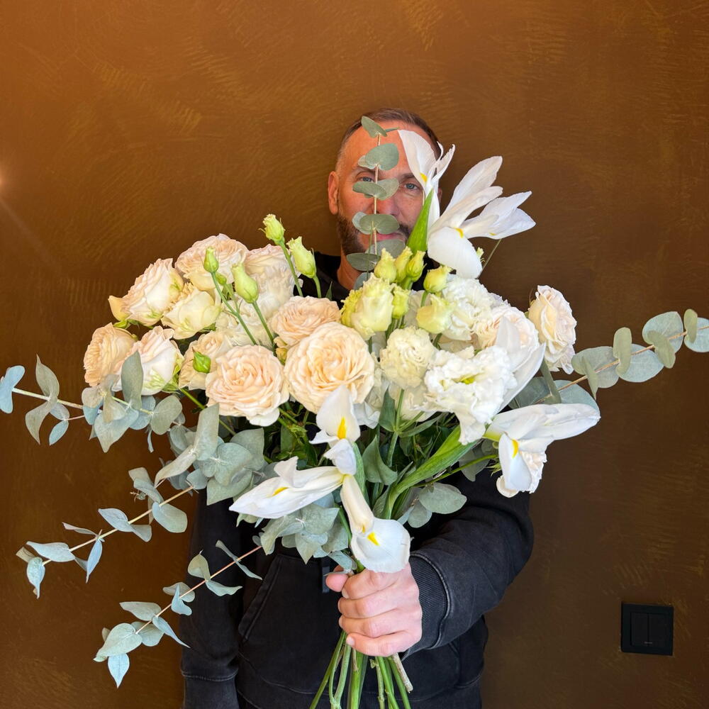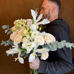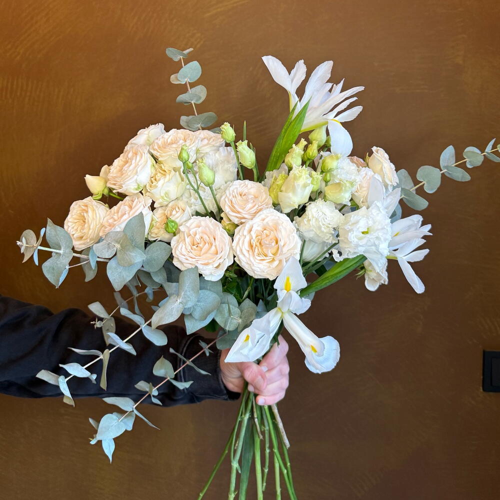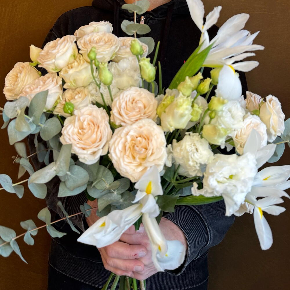 Нежный весенний букет с хрустящими ирисами, нежными кустовыми розами цвета жемчужин и кудрявой эустомой
