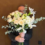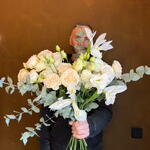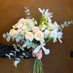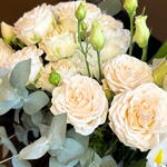 Нежный букет с кустовыми розами, лизиантусом, ирисом