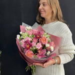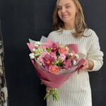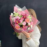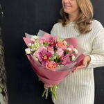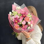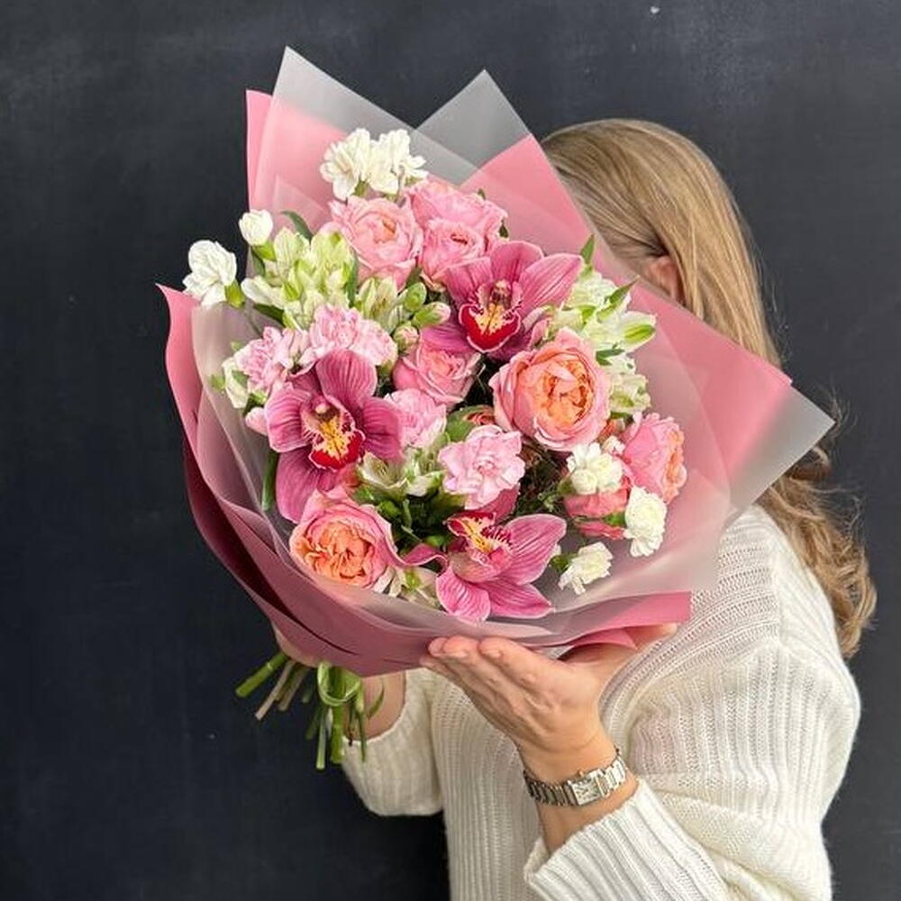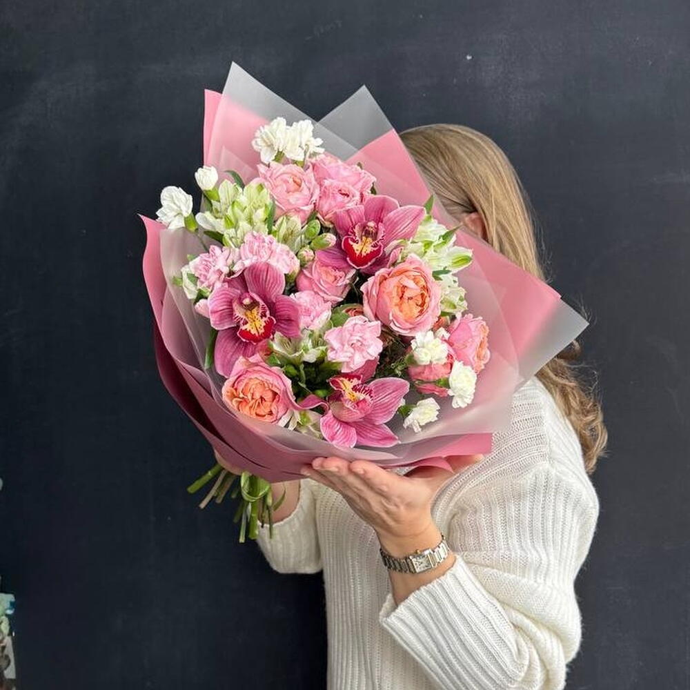 Розовый букет из стойких сортов - кустовая розовая роза, орхидея цимбидиум, гвоздика (диантус) и альстромерия. Все цветы в букете подобраны с заботой, чтобы создать гармоничное сочетание оттенков и текстур, элегантная пленка подчеркивает красоту и свежесть букета. Композиция фактурных цветов может стать прекрасным подарком на любой праздник. К букету прилагается:: ⁃ Бесплатная открытка с вашим текстом (по желанию) ⁃ Аквапакет с водой для бережной доставки букета - Транспортировочная коробка