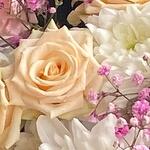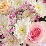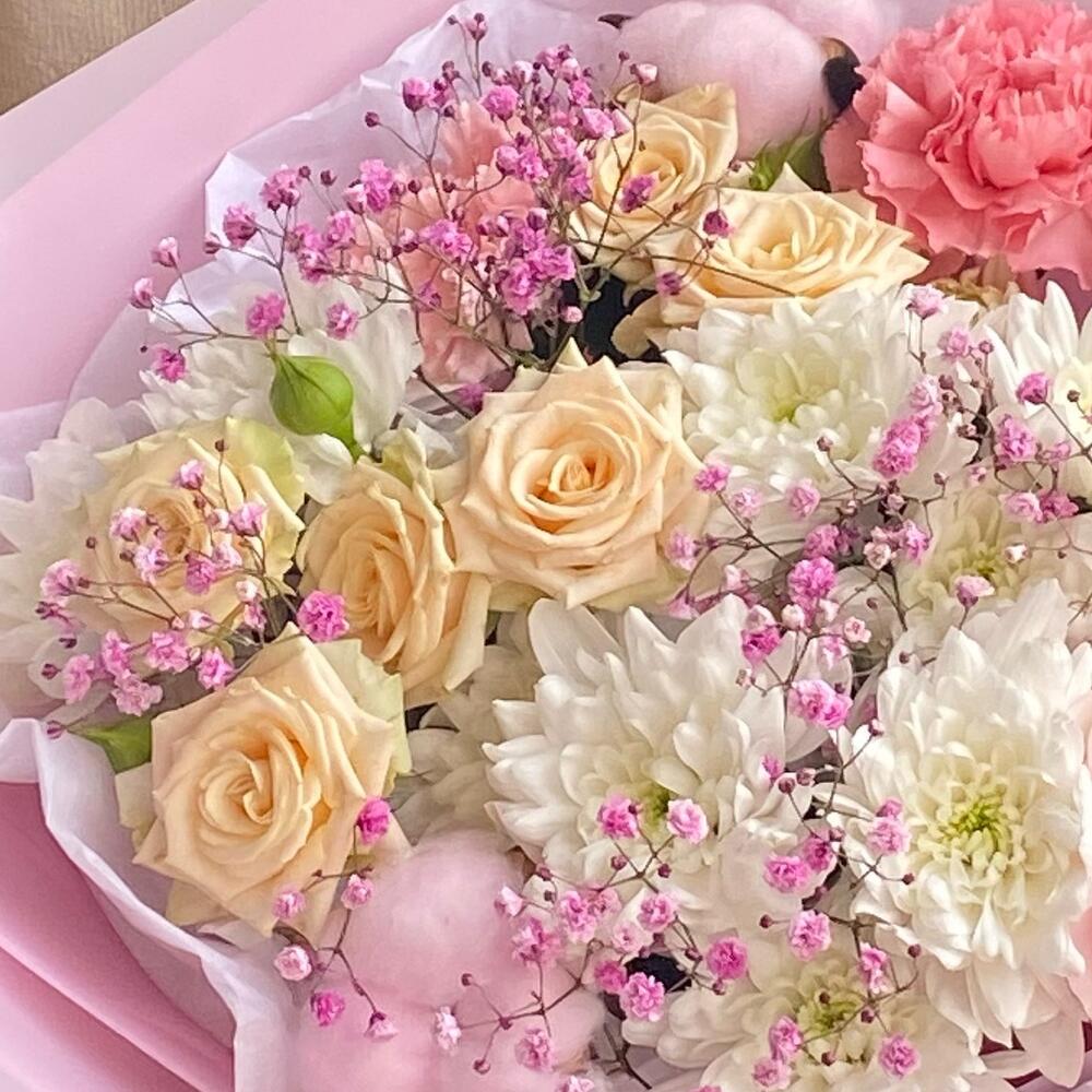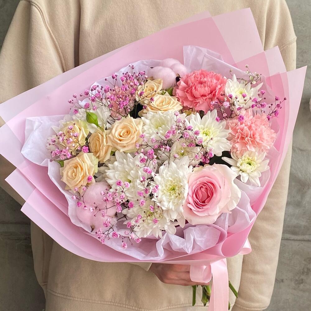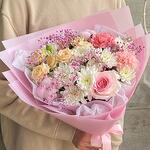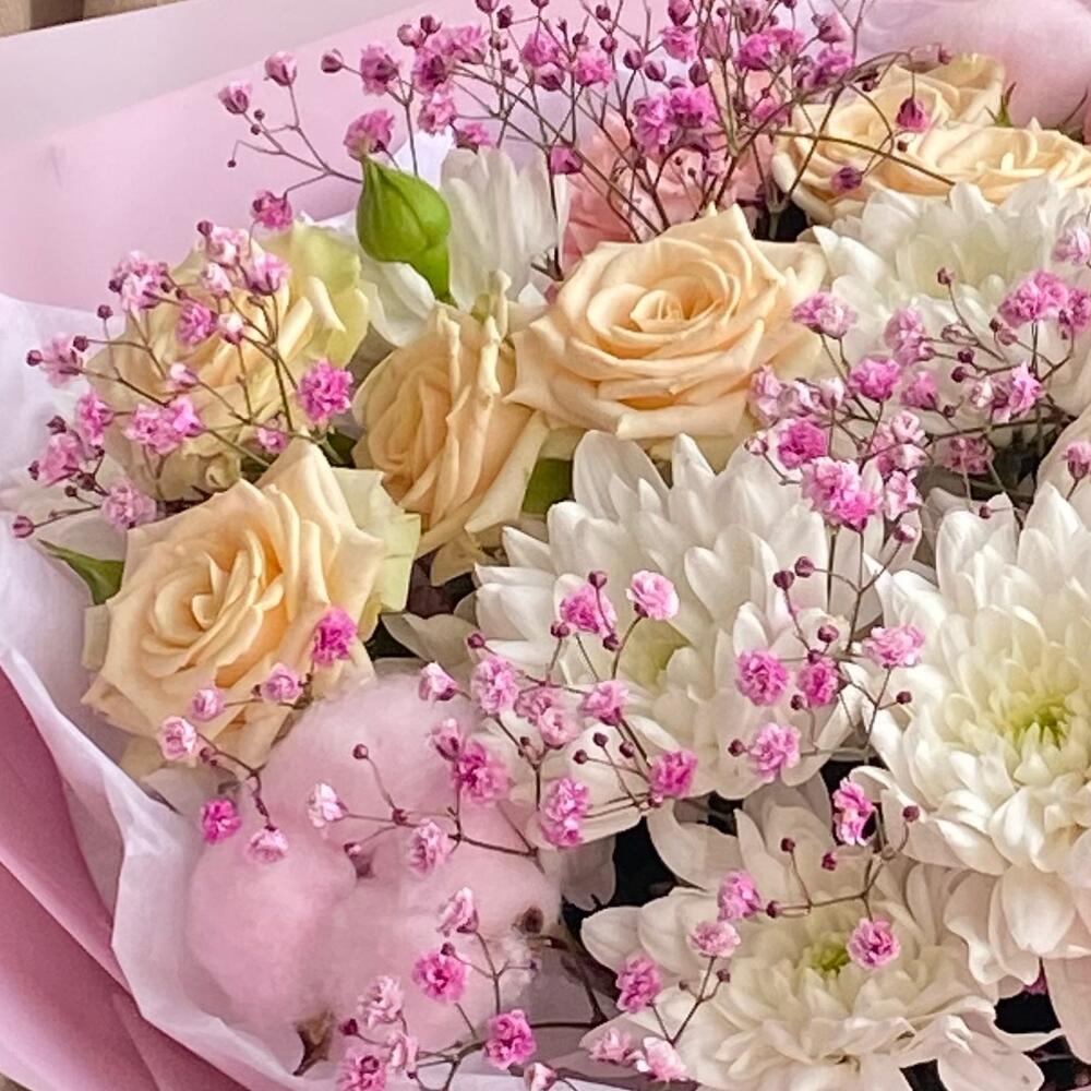 Роза кустовая - 2 шт. Диантус - 2 шт. Роза пионовидная - 1 шт. Фетр - 3 шт. Атласная лента - 2 шт. Фетр белый - 5 шт. Хлопок (сухоцвет) - 3 шт. гипсофила радужная - 2 шт. Хризантема кустовая Алтай - 2 шт.