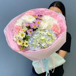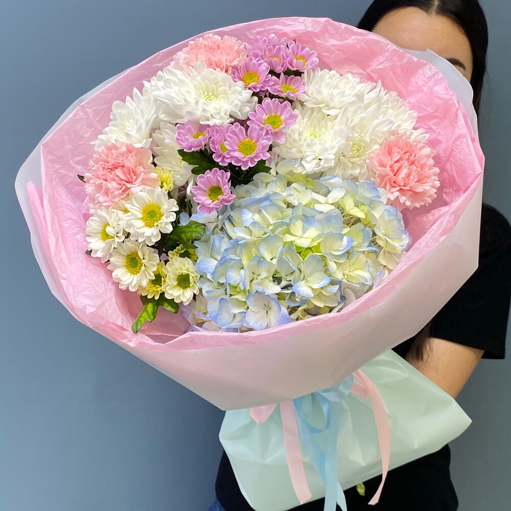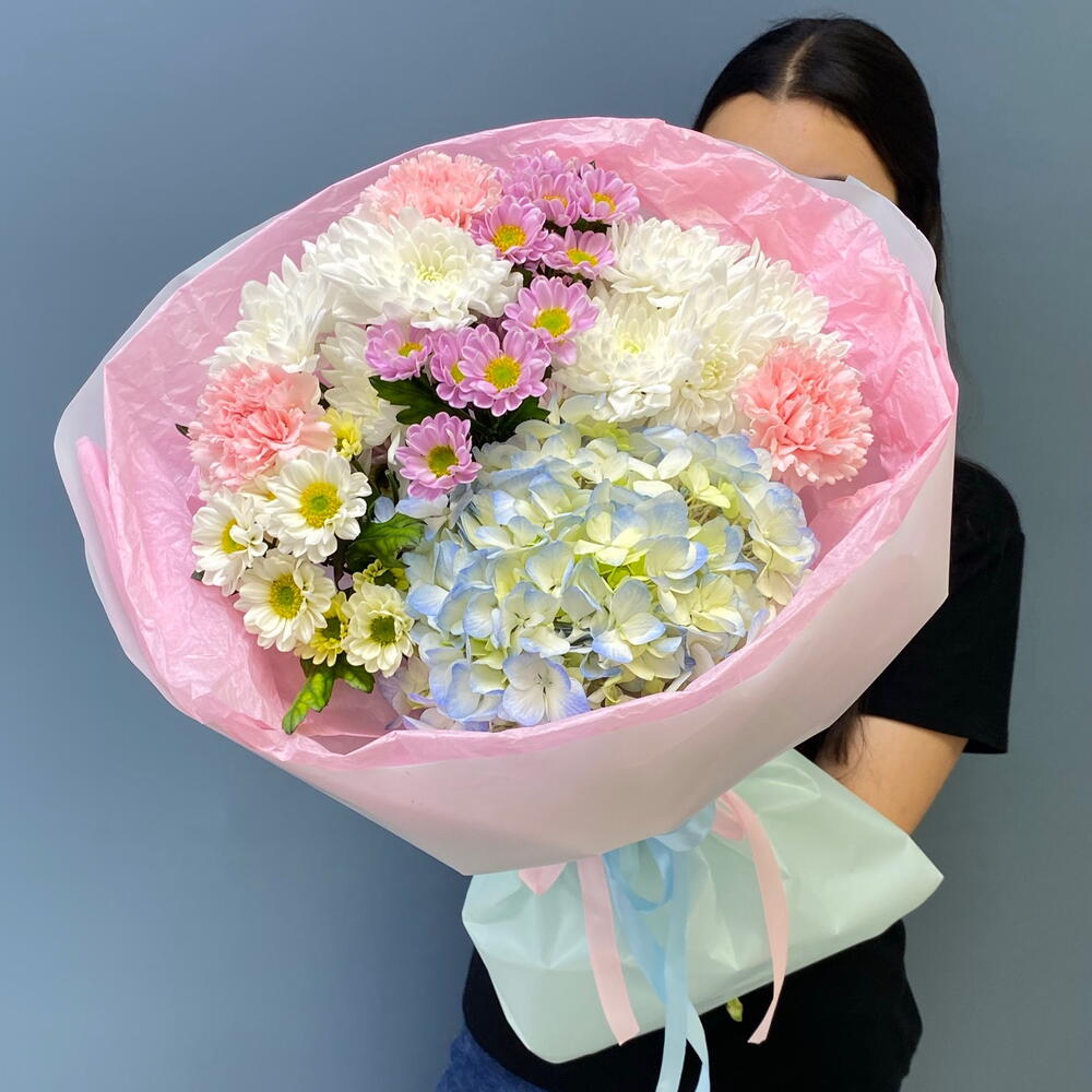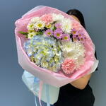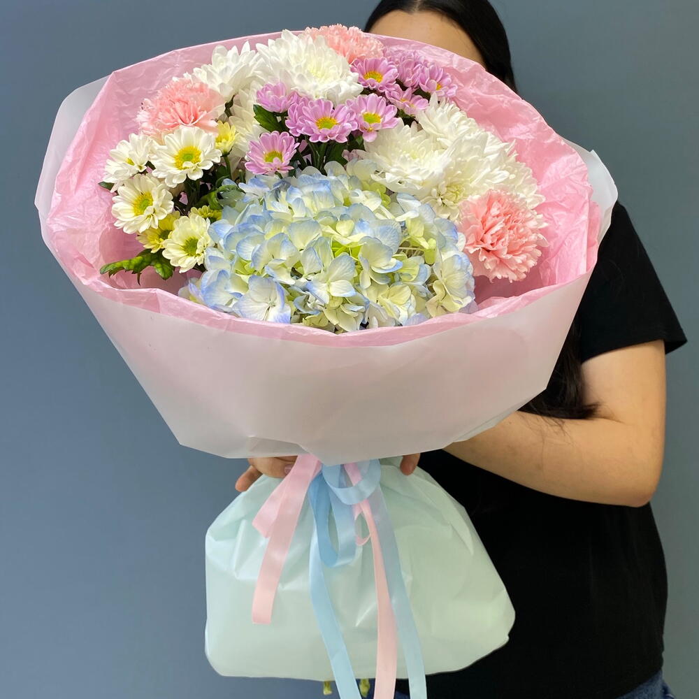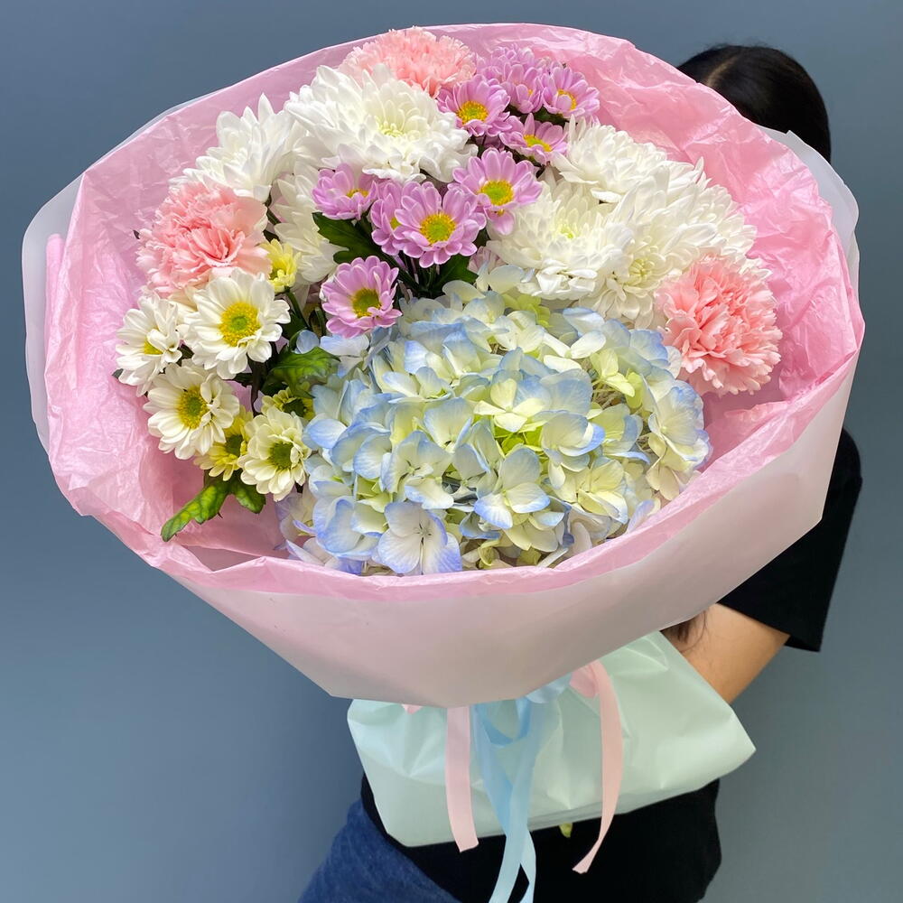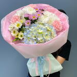 Гортензия - 1 шт. Хризантема кустовая - 2 шт. Лента атласная - 2 шт. Диантус - 3 шт. Сантини - 3 шт. Упаковка дизайнерская - 2 шт.