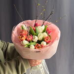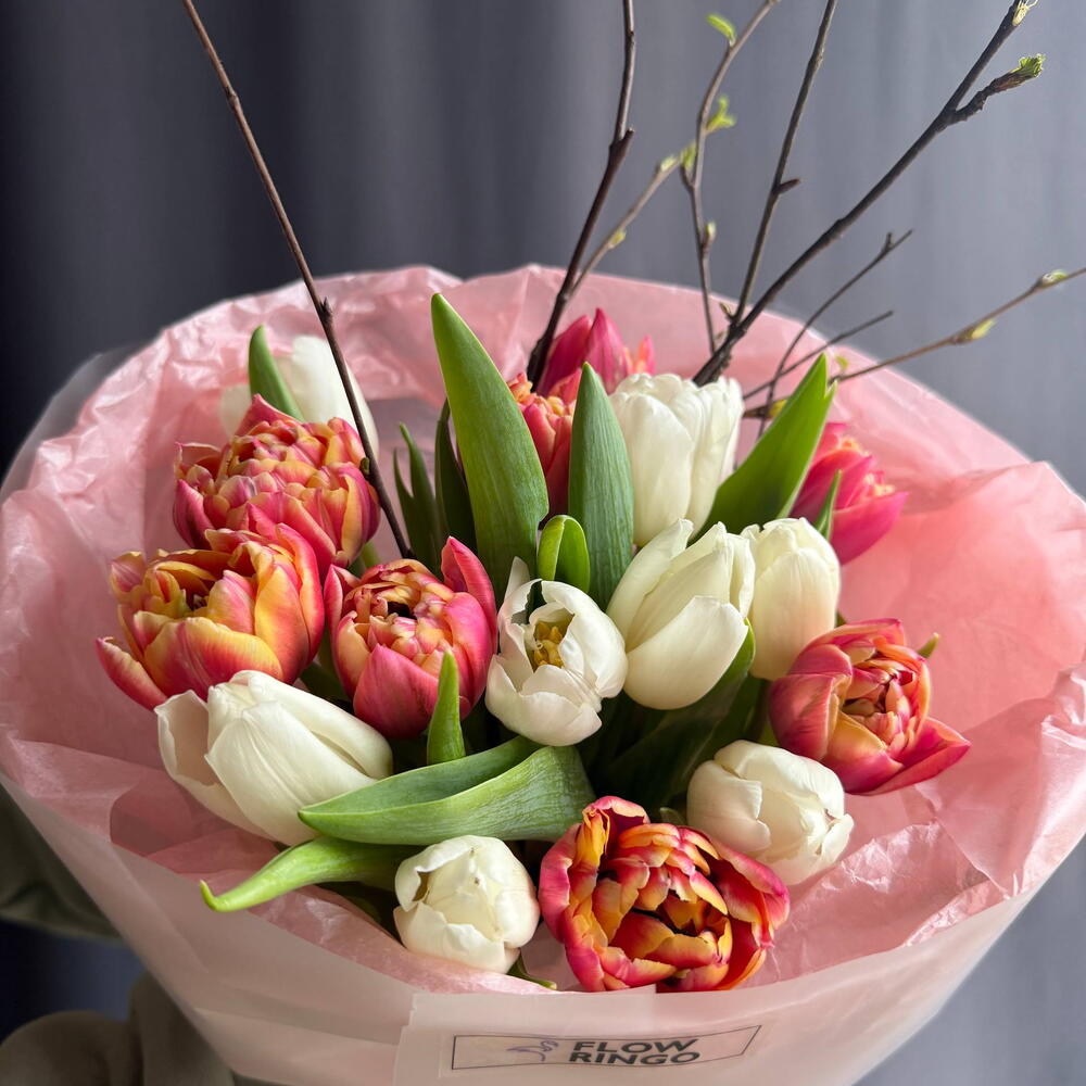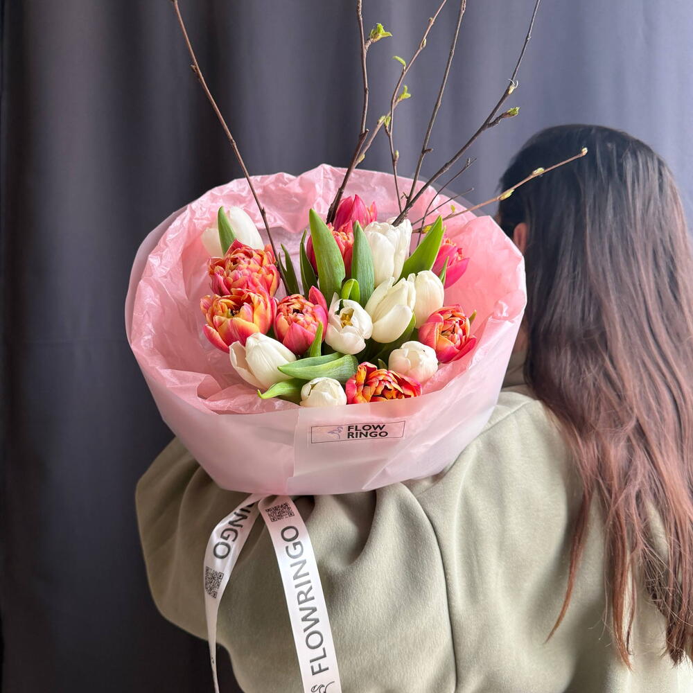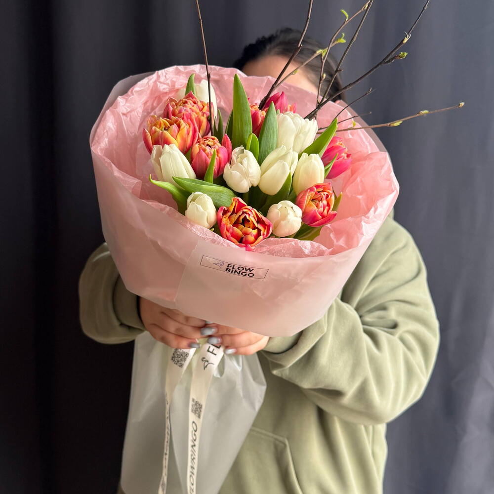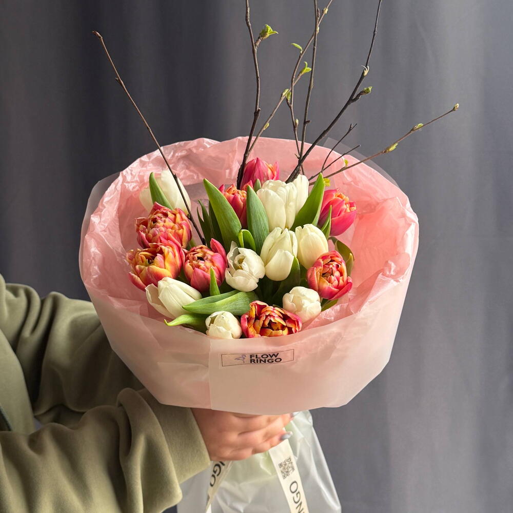 Нежный микс из 17 тюльпанов и веточки березы 8204