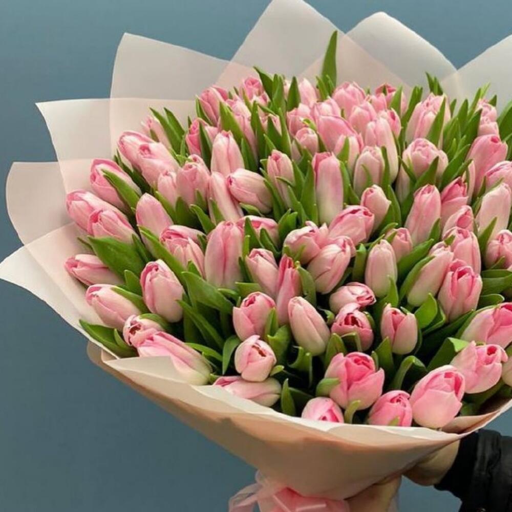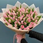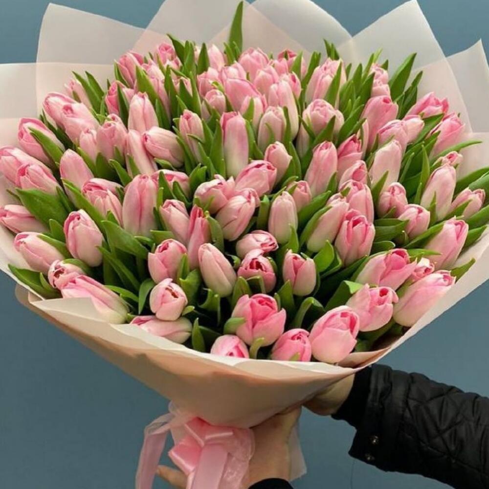 Лента атласная - 1 шт. Тюльпан розовый - 101 шт. Упаковка дизайнерская - 1 шт. Открыточка с вашими пожеланиями - 1 шт.