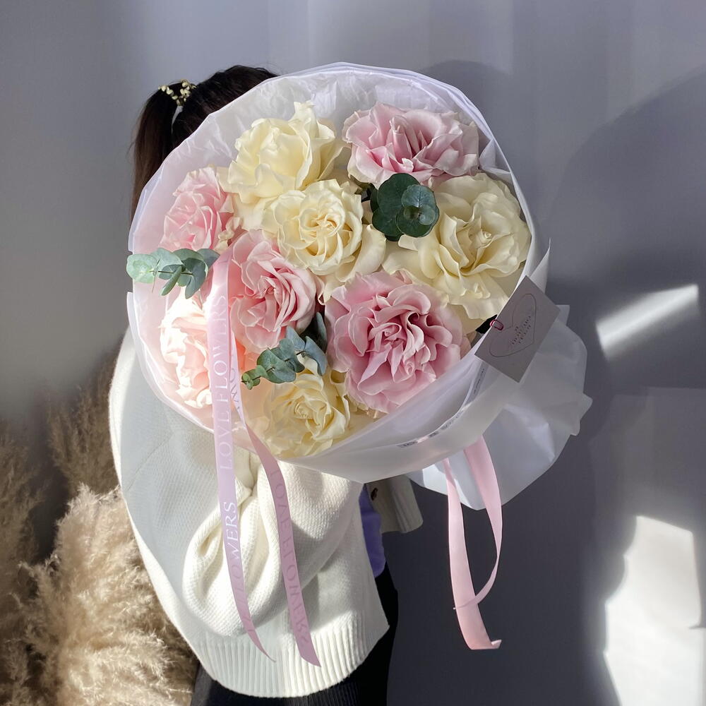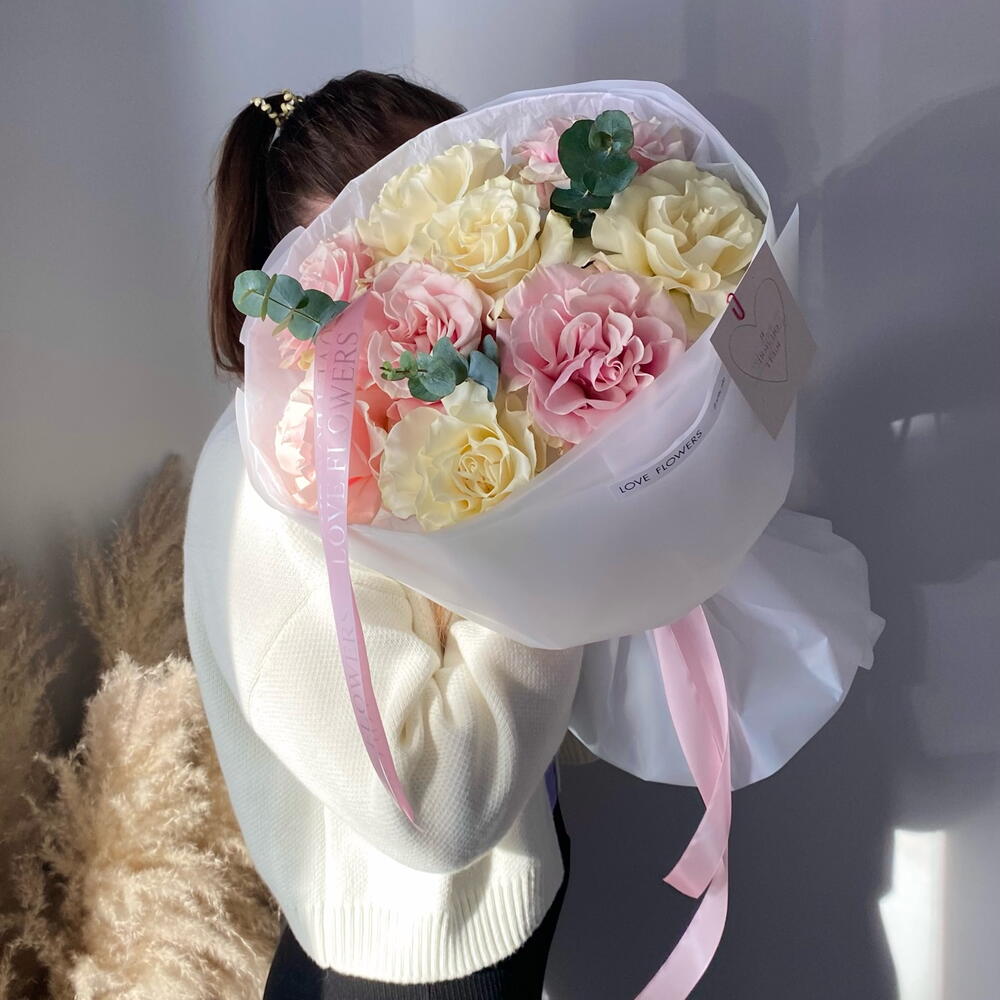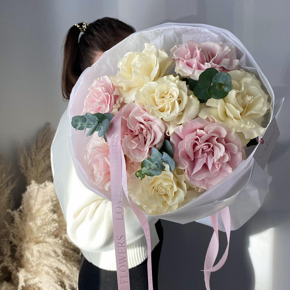 Нежное моно из роз 9 шт с эвкалиптом на 8 марта
