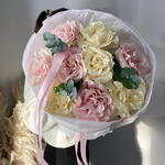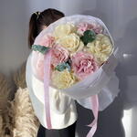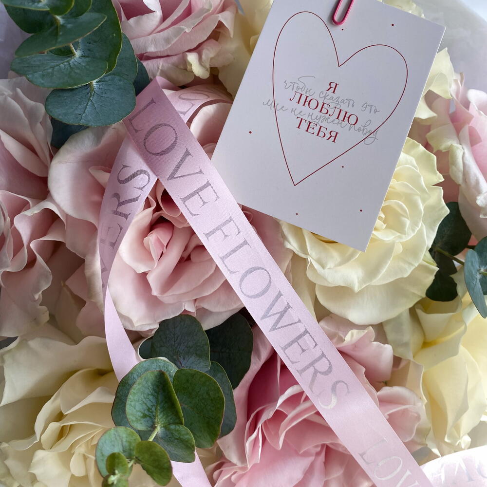 Эвкалипт - 3 шт. Роза Эквадор - 9 шт. Лента атласная - 1 шт. Тишью - 3 шт. Пленка матовая - 3 шт.