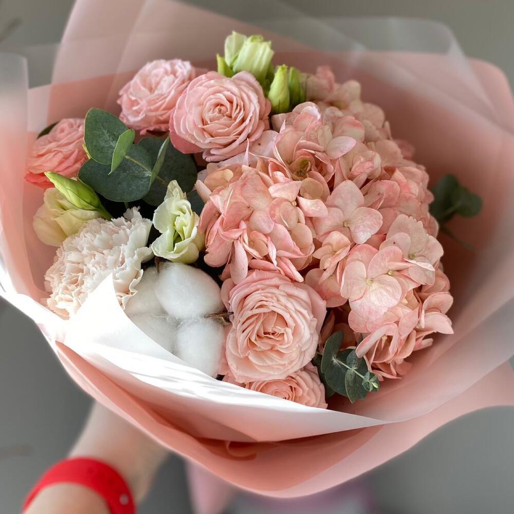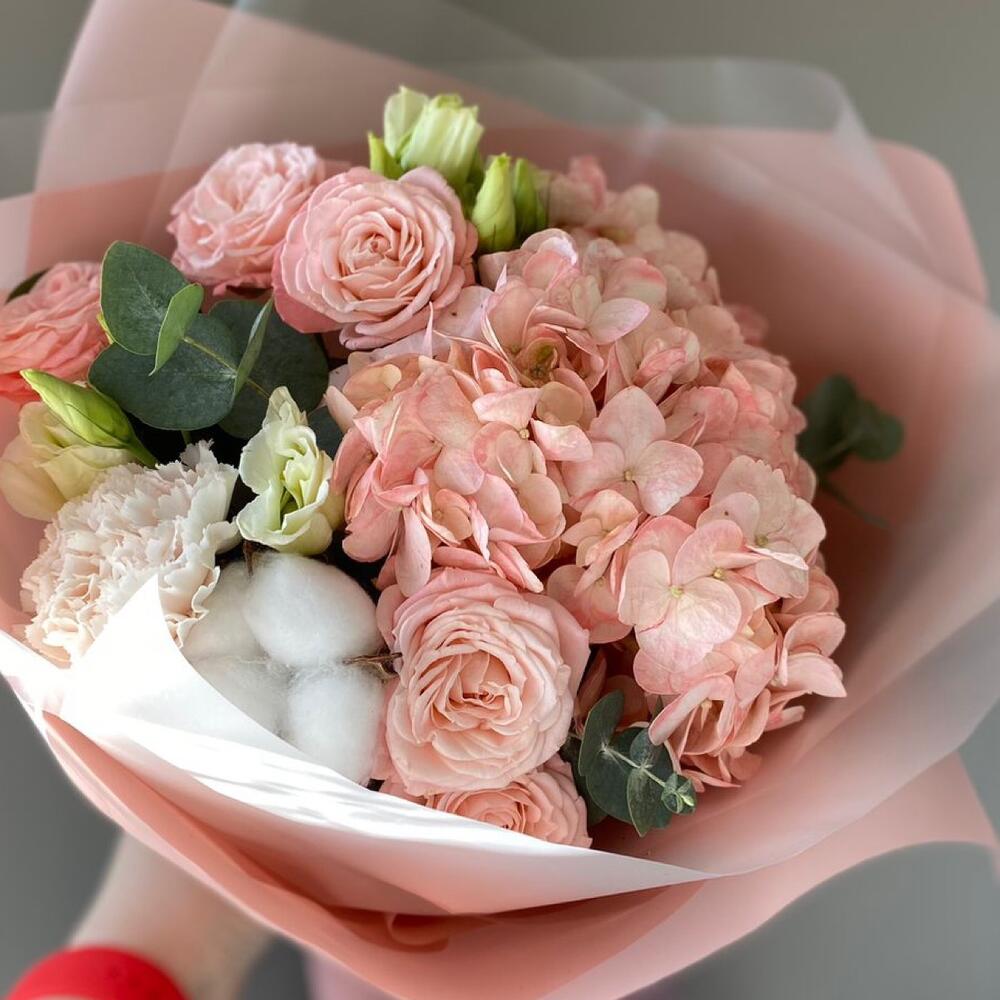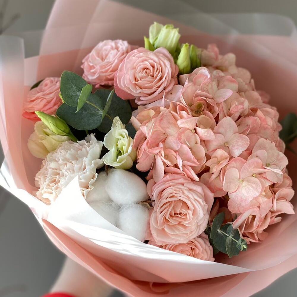 Гортензия - 1 шт. Роза кустовая - 2 шт. Хлопок - 1 шт. Эвкалипт - 1 шт. Эустома - 1 шт. Диантус - 1 шт. Упаковка дизайнерская - 1 шт.