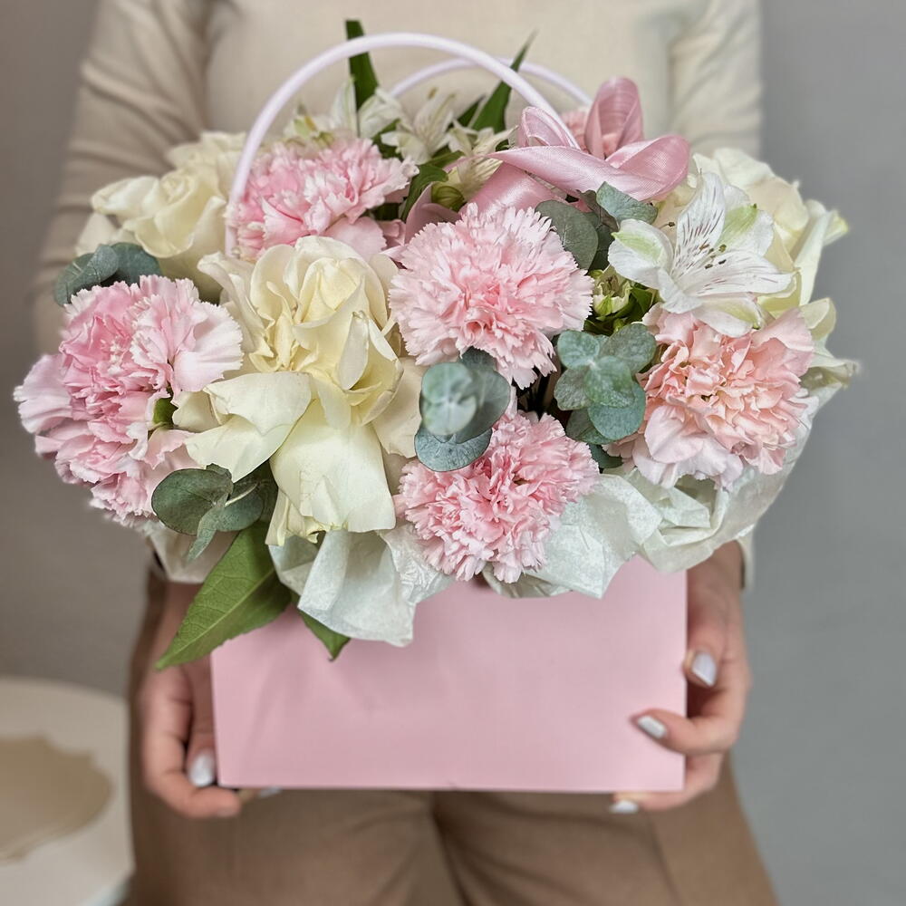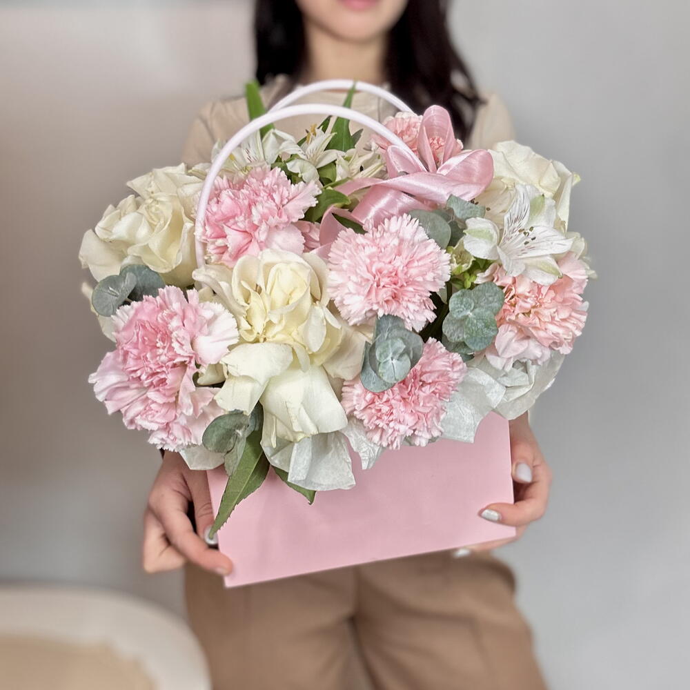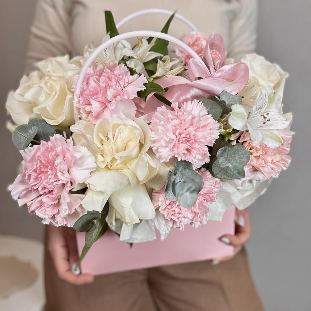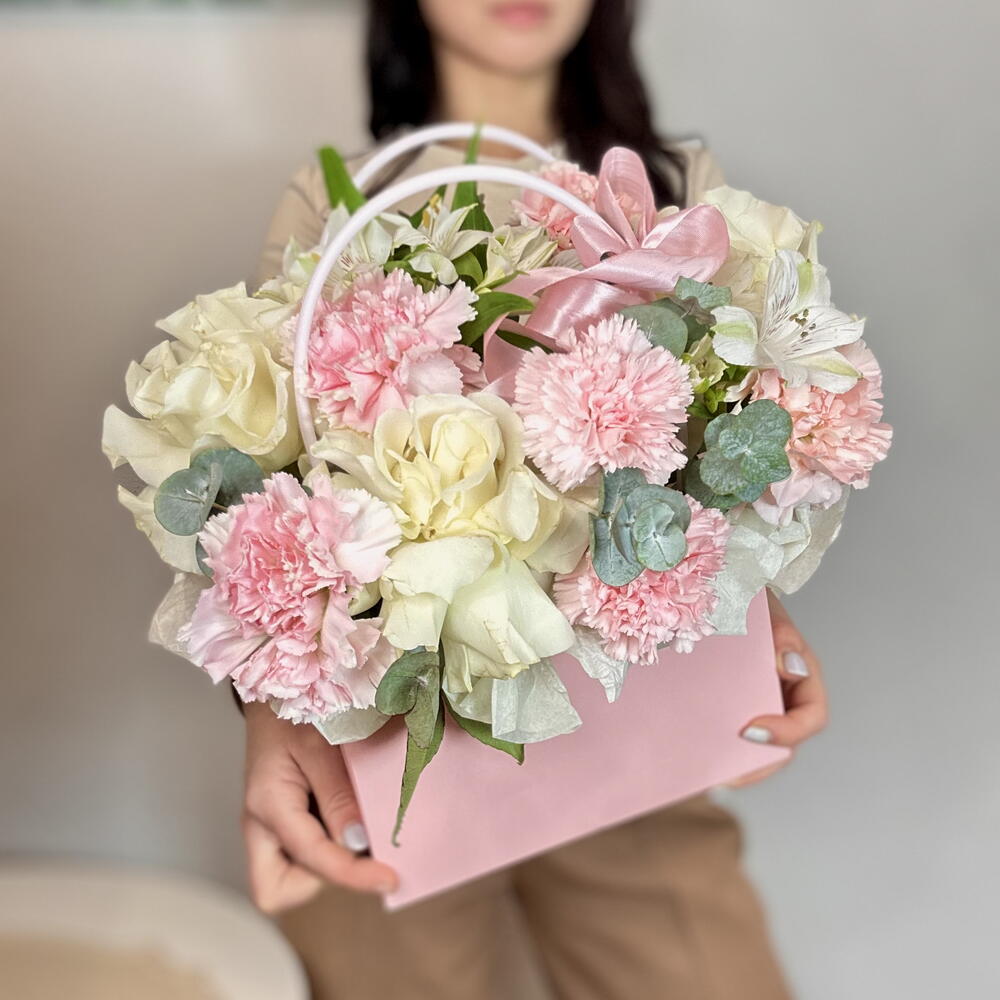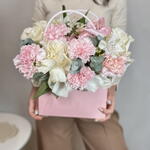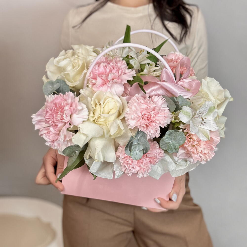 Нежные, французские розы и диантусы в сумочке