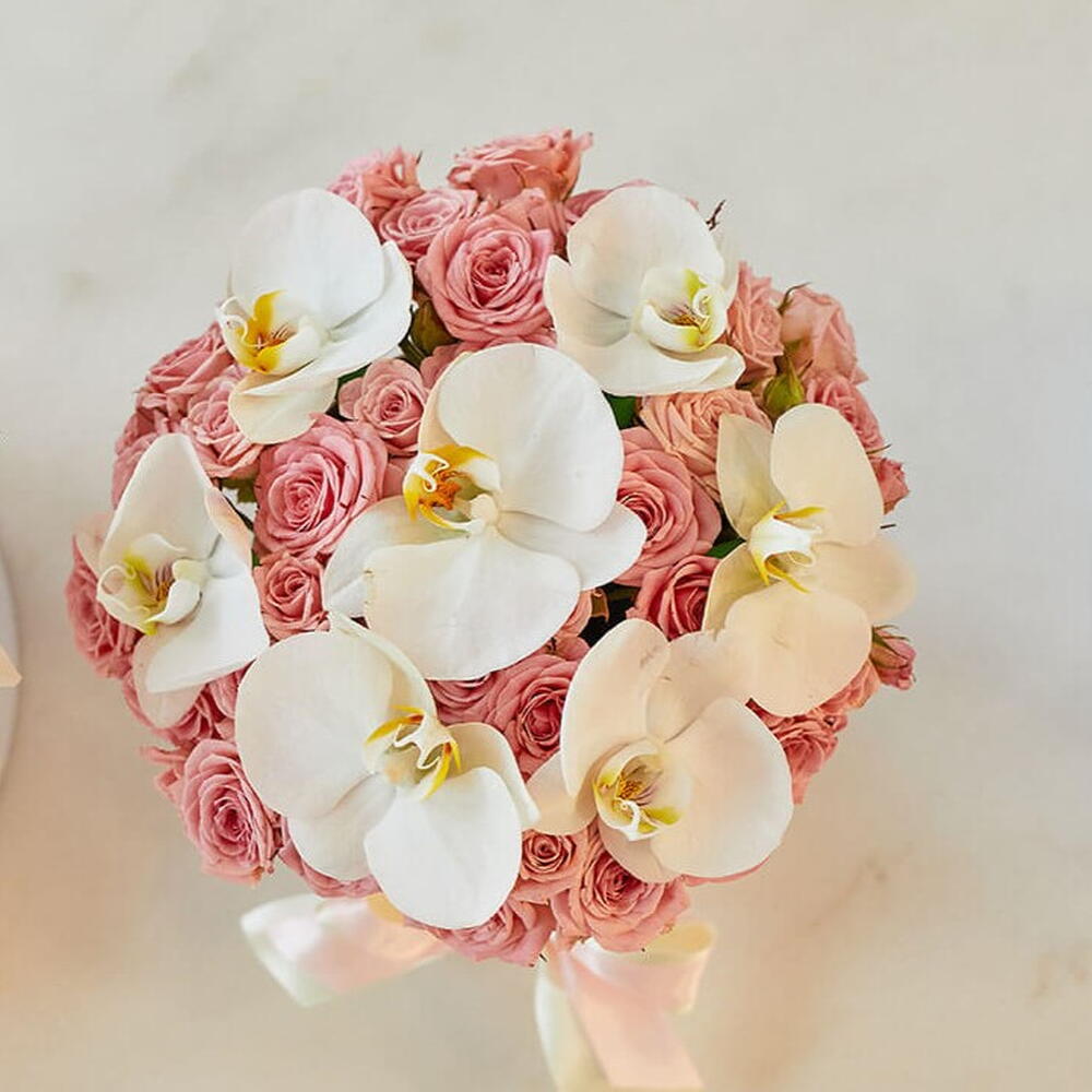 Орхидея Фаленопсис - 7 шт. Кустовая роза - 12 шт. Атласная лента - 1 шт. Коробка ручной работы - 1 шт.