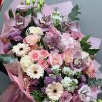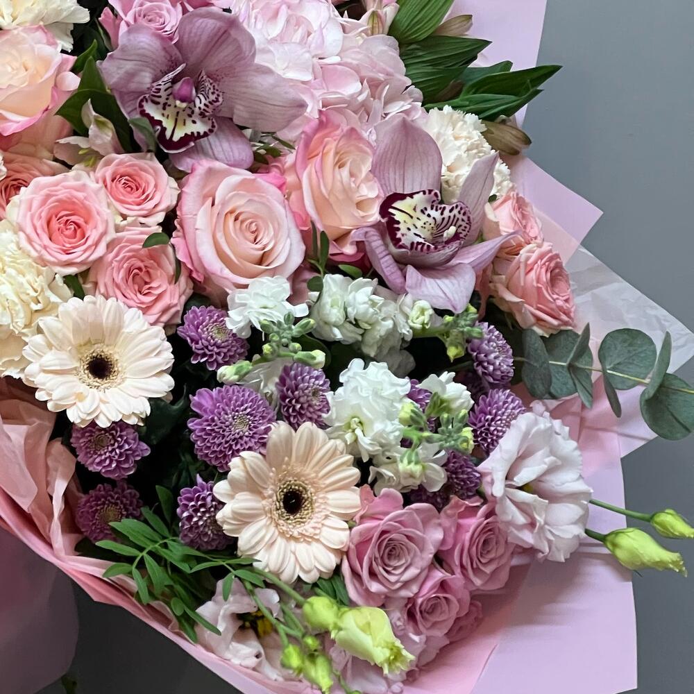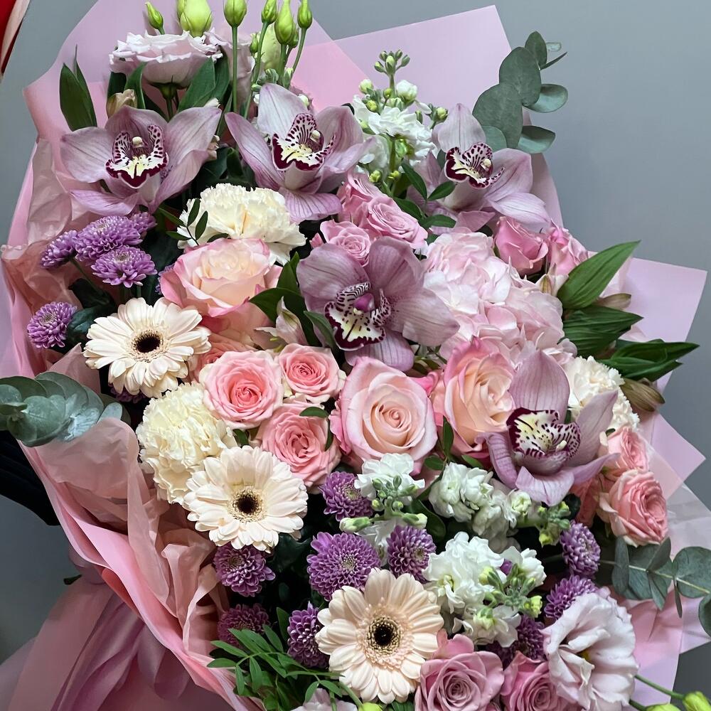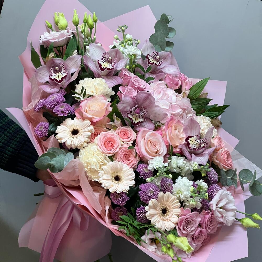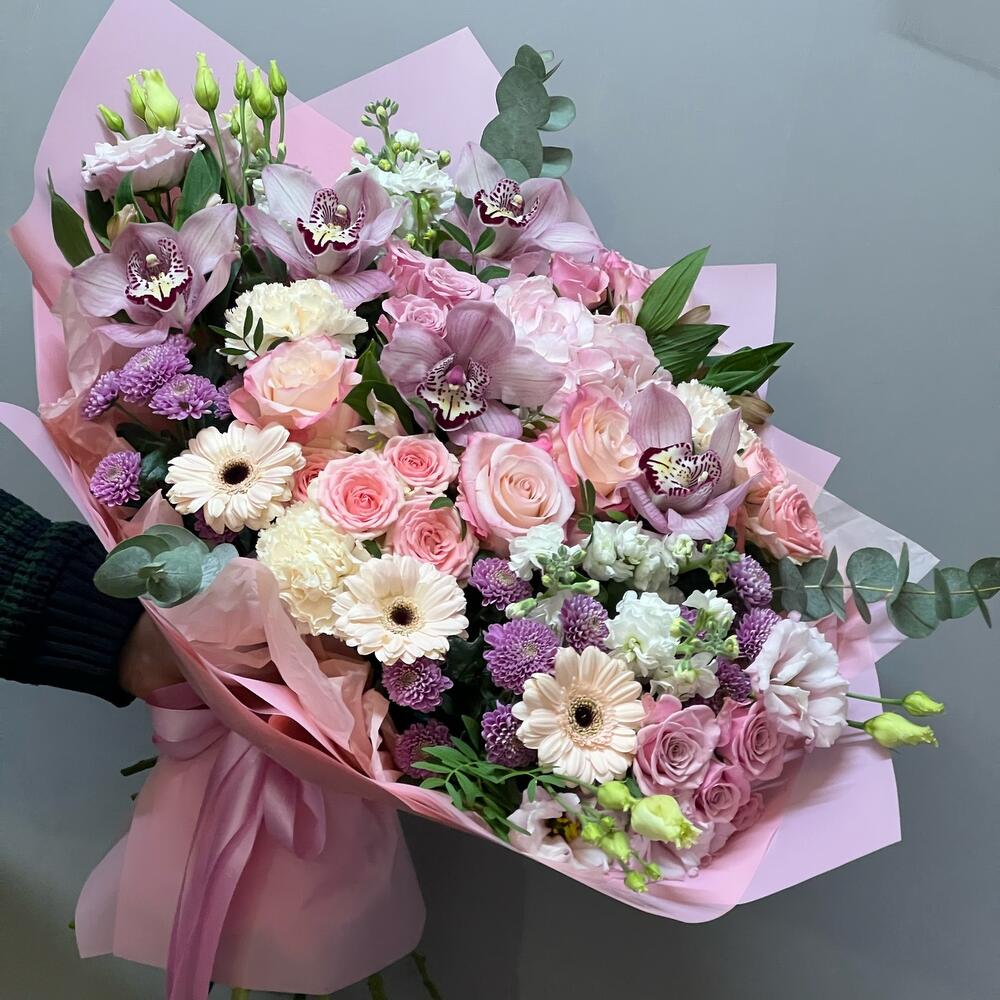 Орхидея Цимбидиум - 5 шт. Роза кустовая - 5 шт. Роза Эквадор - 3 шт. Эустома - 3 шт. Лента атласная - 2 шт. Гербера мини - 3 шт. Упаковка дизайнерская - 6 шт. Гортензия розовая - 1 шт. Сантини микс - 3 шт. Эвкалипт Baby Blue - 3 шт. маттиола кустовая - 2 шт. фисташка зелень - 5 шт. альстромерия микс европа - 3 шт.