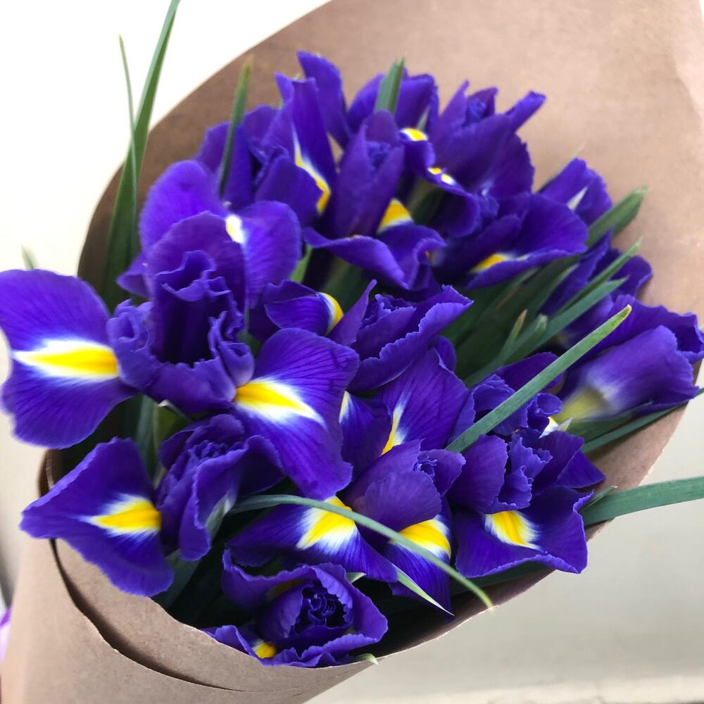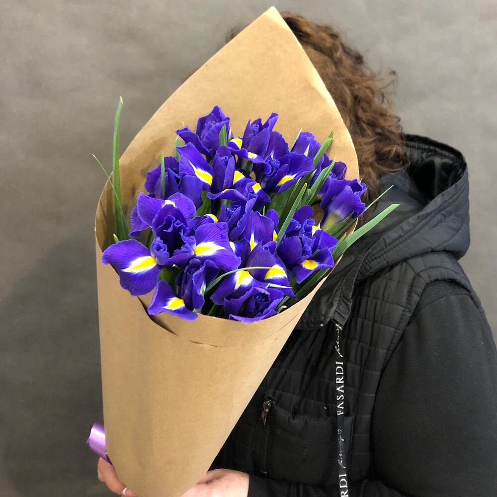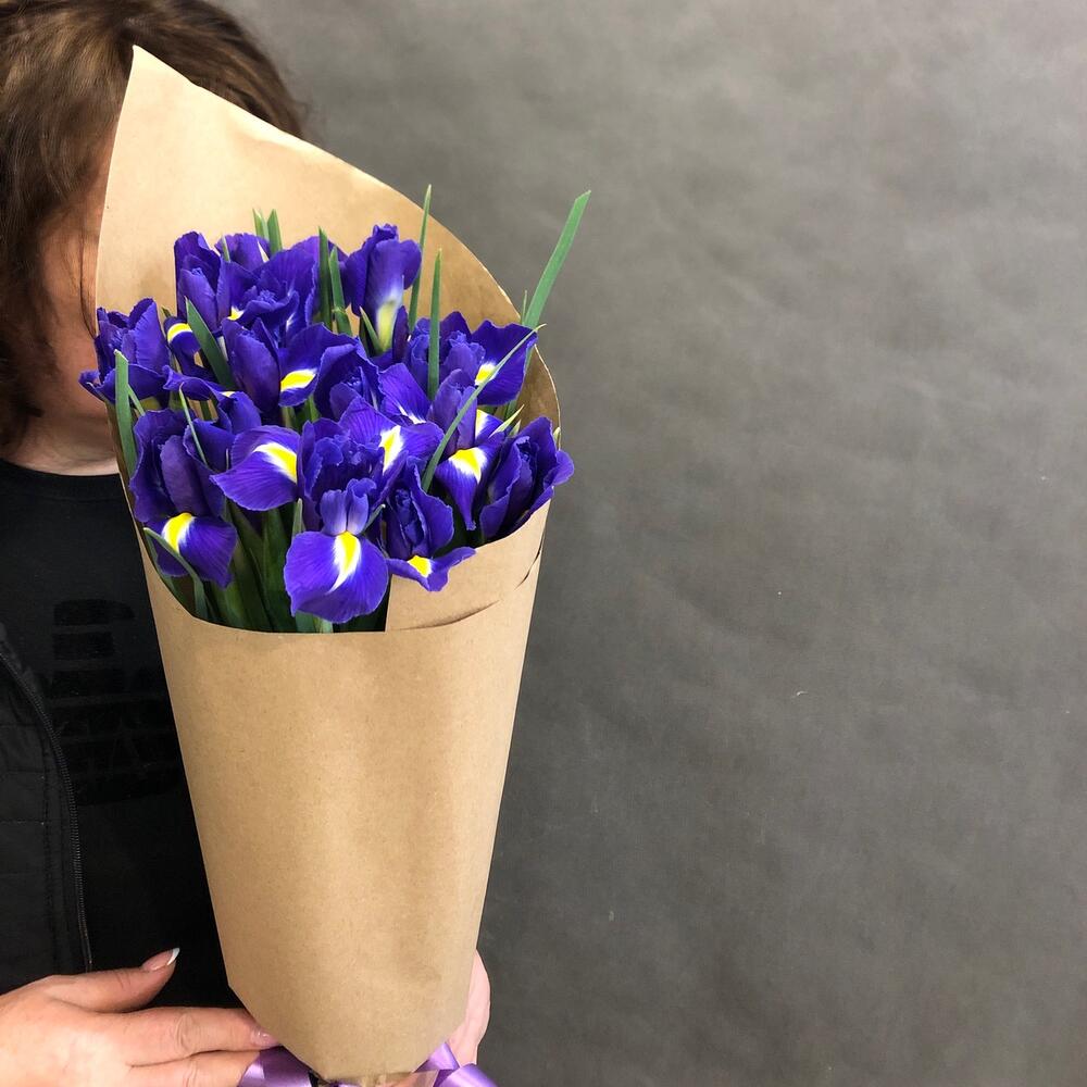 Лента атласная - 1 шт. Крафт упаковка - 1 шт. ирисы - 15 шт.