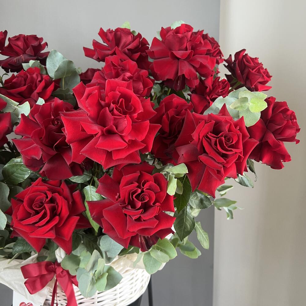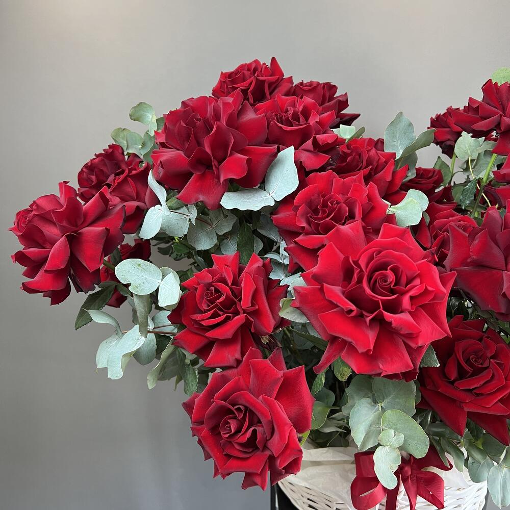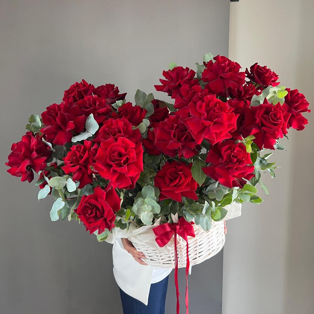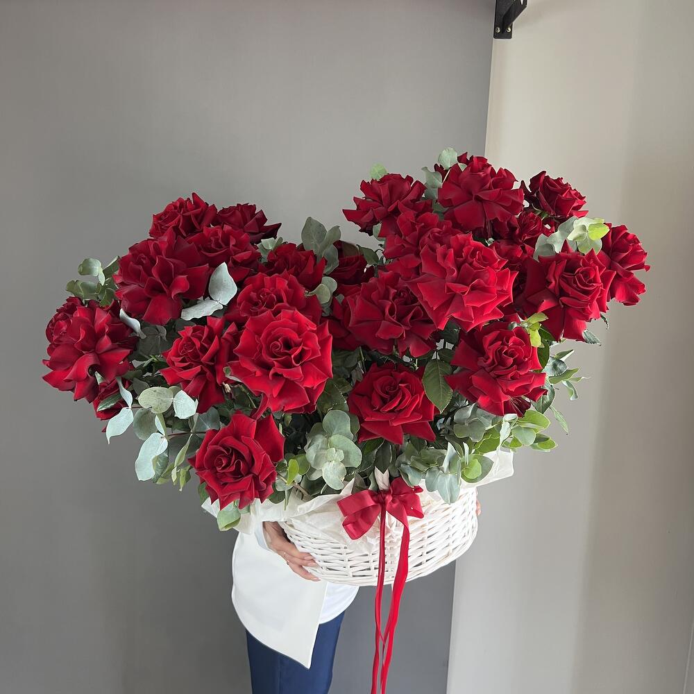 Пиафлор (оазис) - 4 шт. Эвкалипт - 10 шт. Атласная лента - 2 шт. Корзина плетеная - 1 шт. Французская роза - 35 шт.
