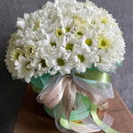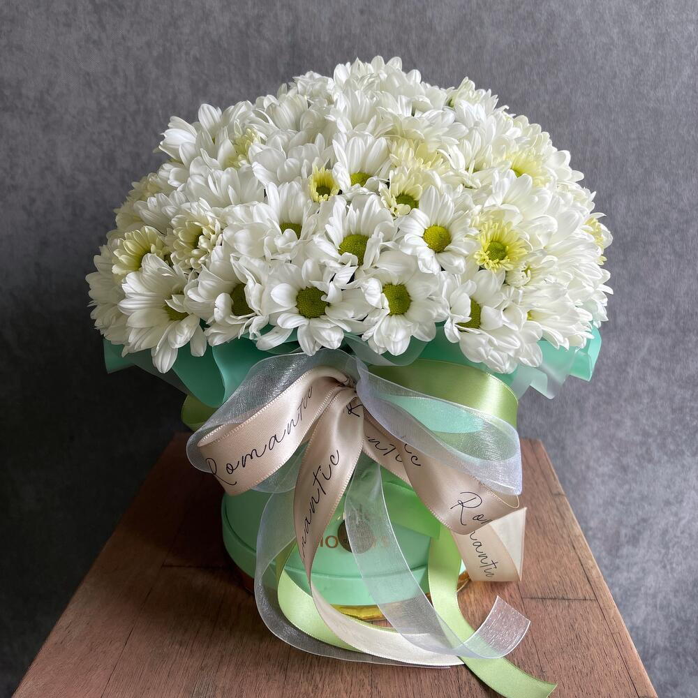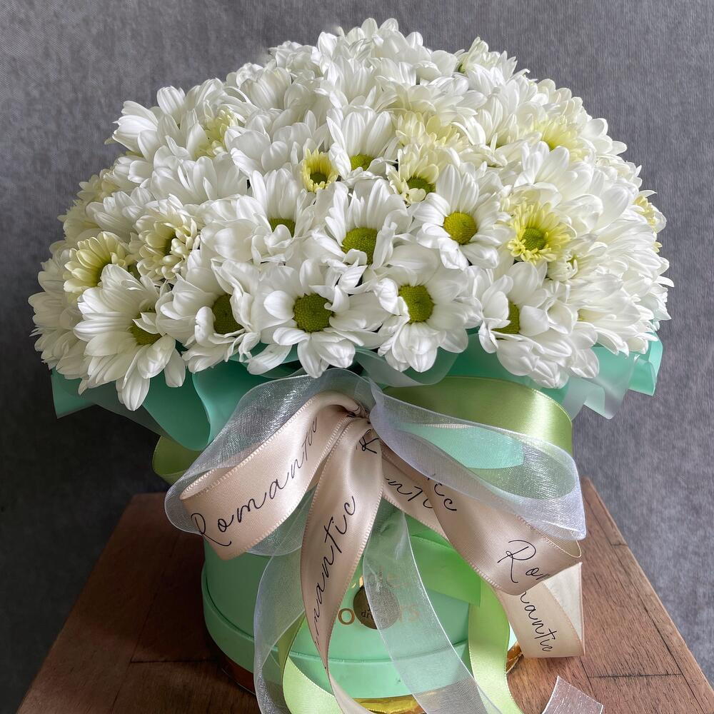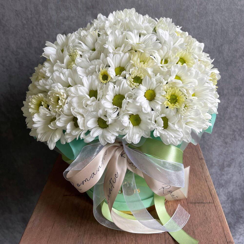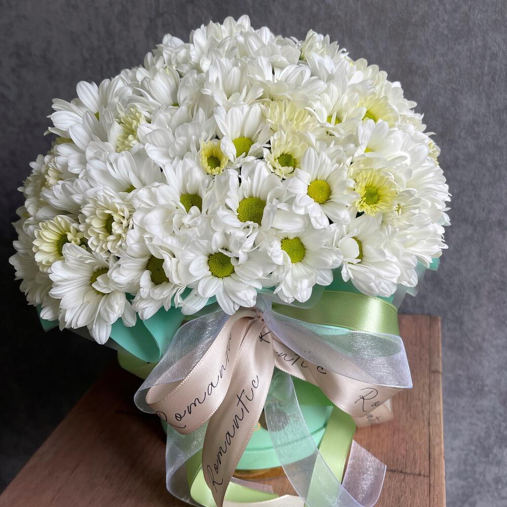 Лента атласная - 2 шт. Шляпная коробка - 1 шт. Упаковка дизайнерская - 1 шт. Флористическая губка - 1 шт. хризантема кустовая белая ромашковая - 11 шт.