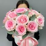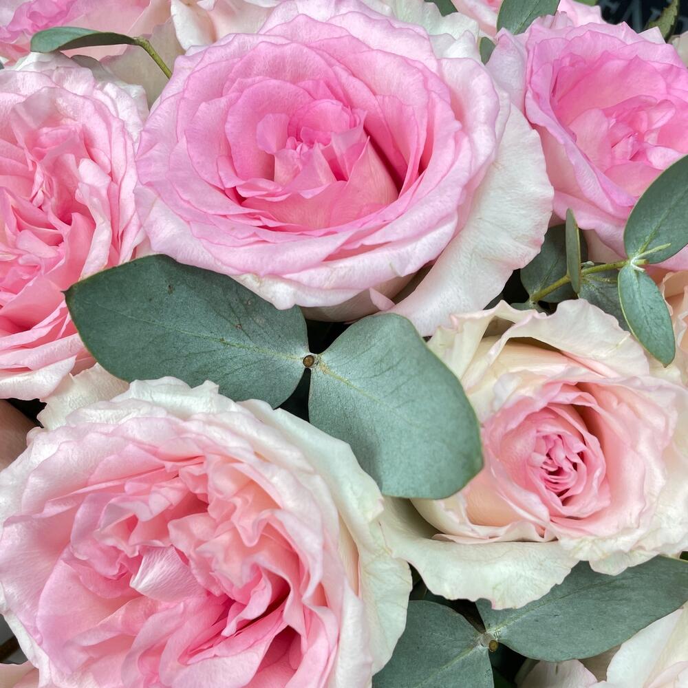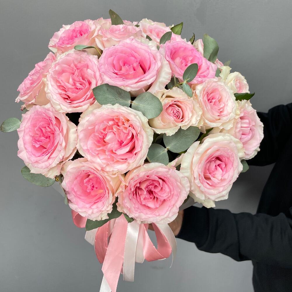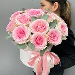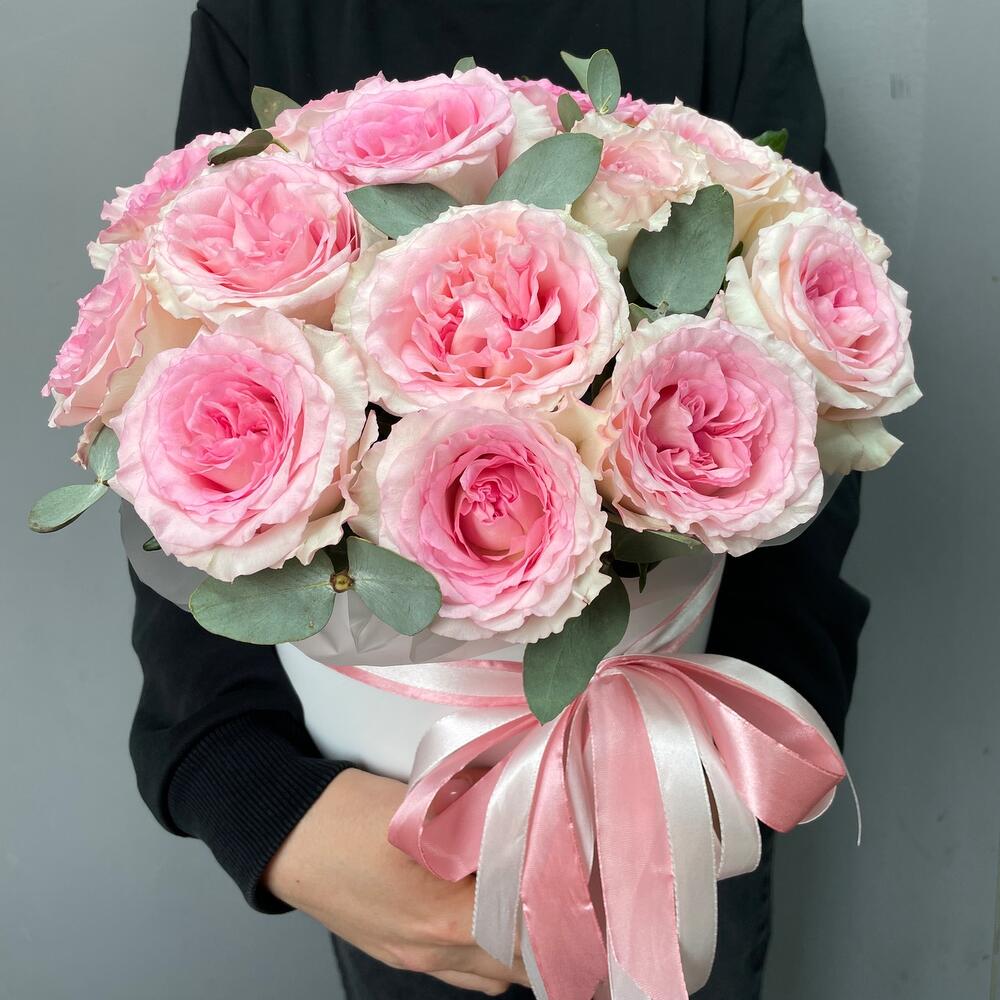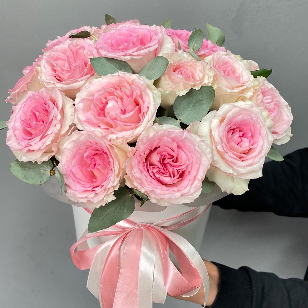 Эвкалипт - 7 шт. Роза одноголовая - 15 шт. Коробка шляпная - 1 шт. Оазис флористический - 2 шт. бант атласный - 2 шт.