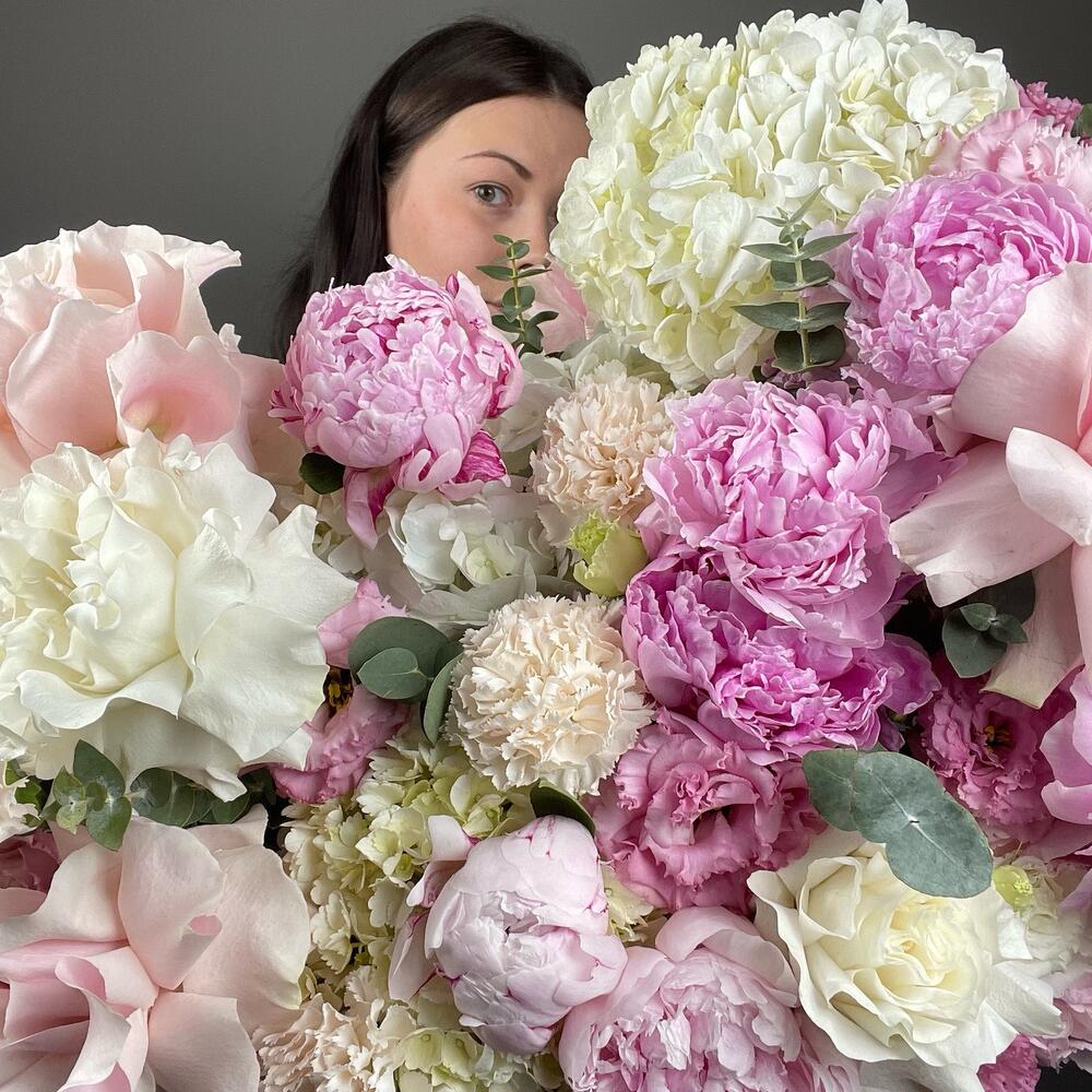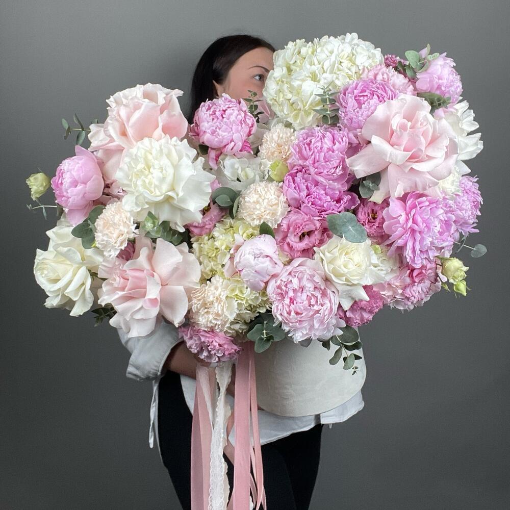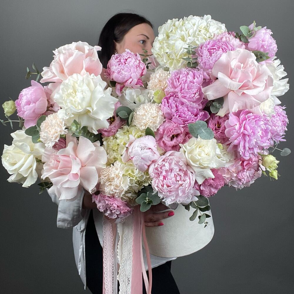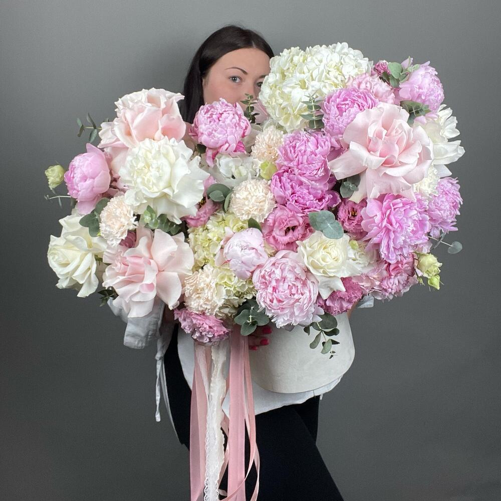 Огромная шикарная коробка с ароматными пионами, розами WOW, воздушной гортензией и кружевными лизиантусами😍 Такой подарок станет одним из самых желанных и запоминающихся на долгое время☺️ П.с. Всё подружки обзавидуются)) проверено!