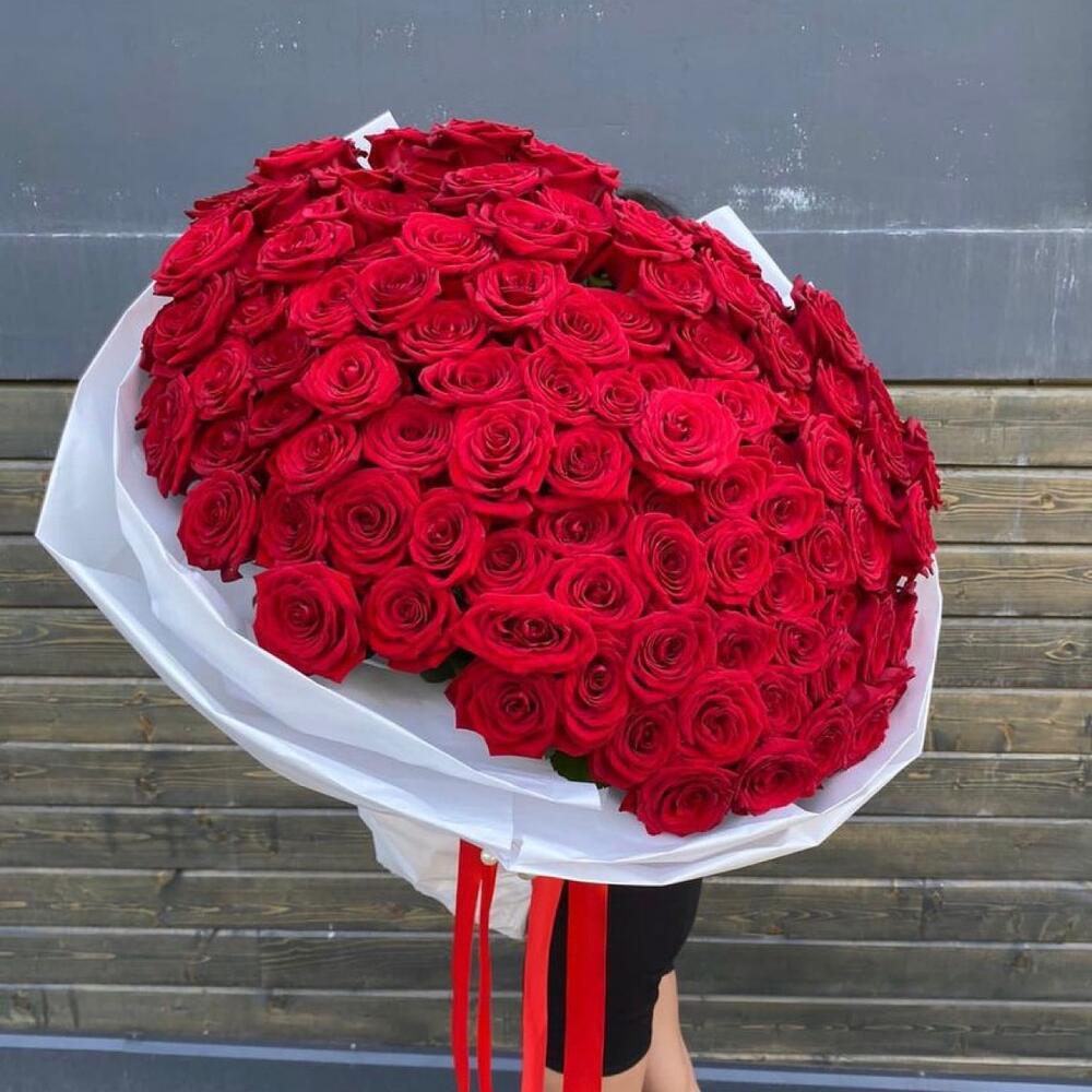 Лента - 1 шт. Роза - 151 шт. Упаковка дизайнерская - 2 шт. Бусина - 1 шт. аквапак с водой - 1 шт. памятка по уходу и подкормка для цветов - 5 шт. премиум доставка курьером в деловом костюме и белых перчатках - 1 шт.