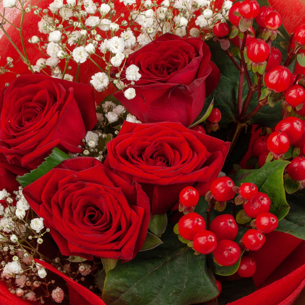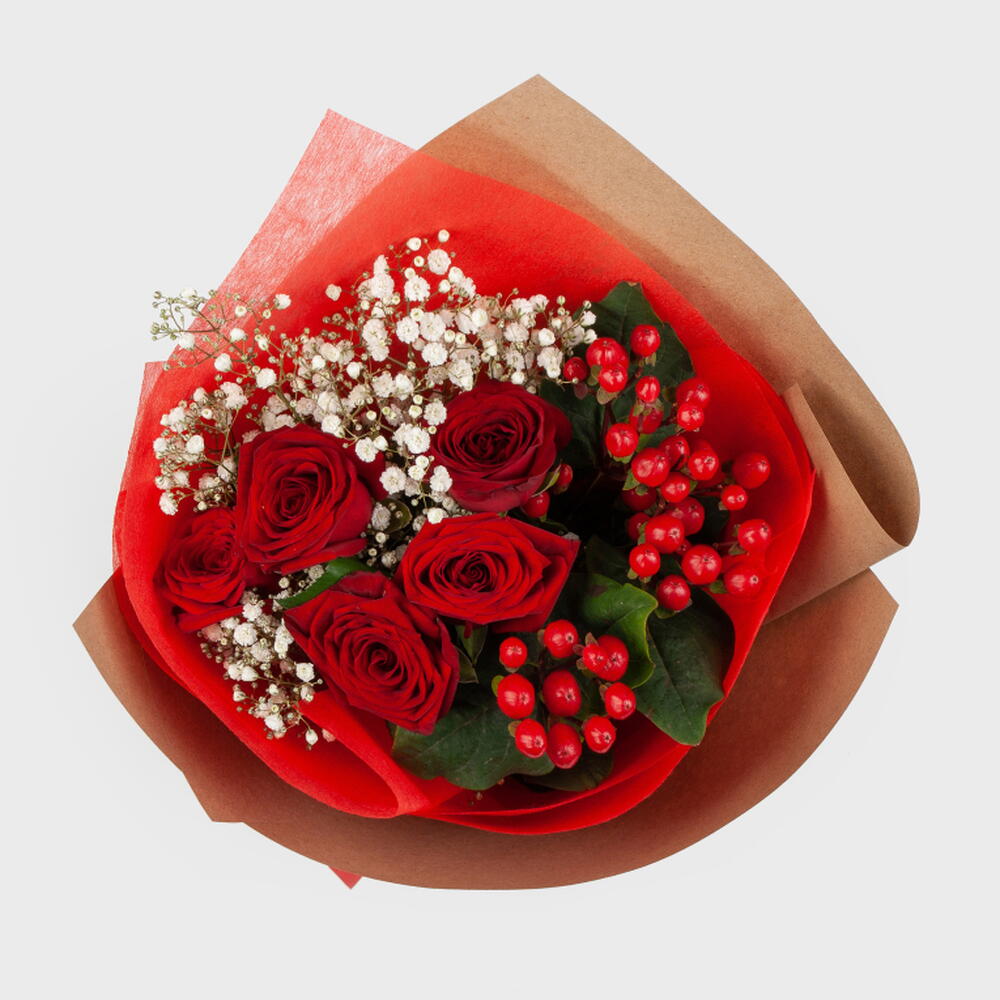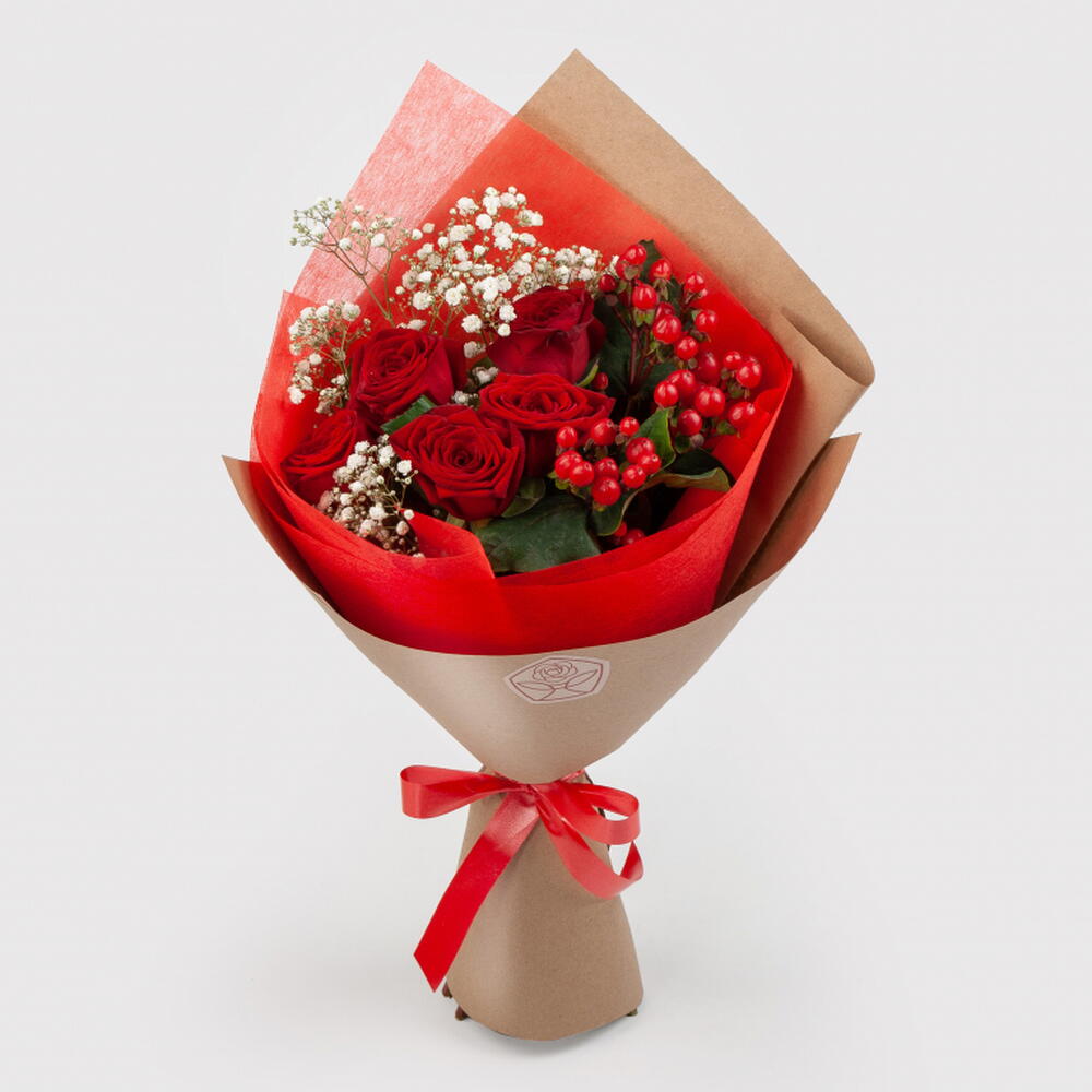 Гиперикум - 3 шт. Гипсофила - 1 шт. Лента атласная - 1 шт. Дизайнерская упаковка - 1 шт. роза кения - 5 шт.