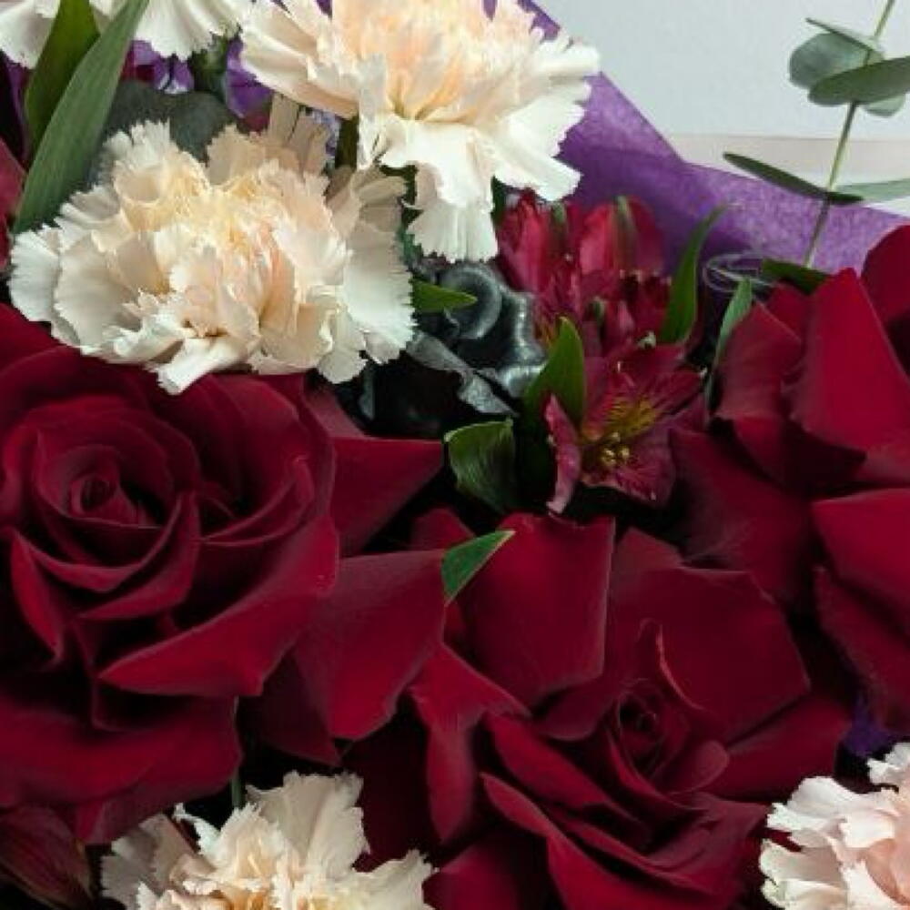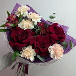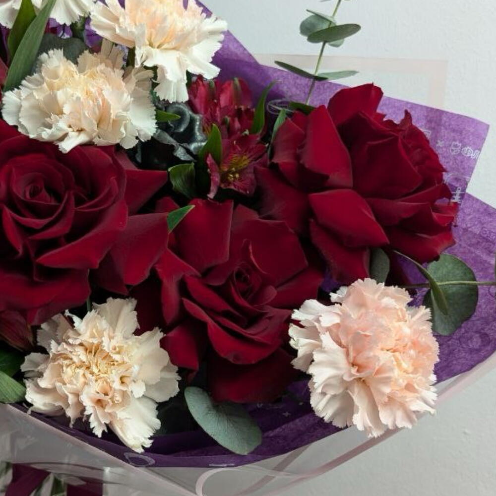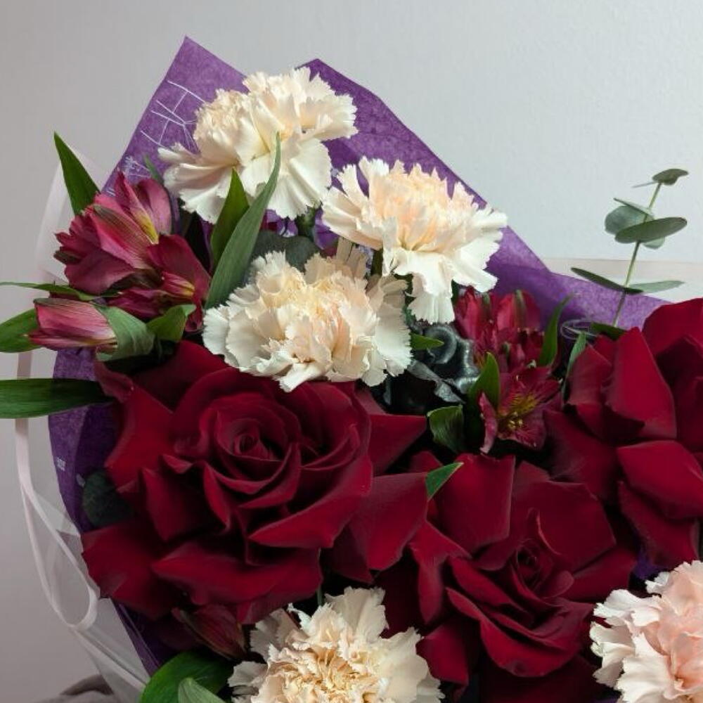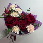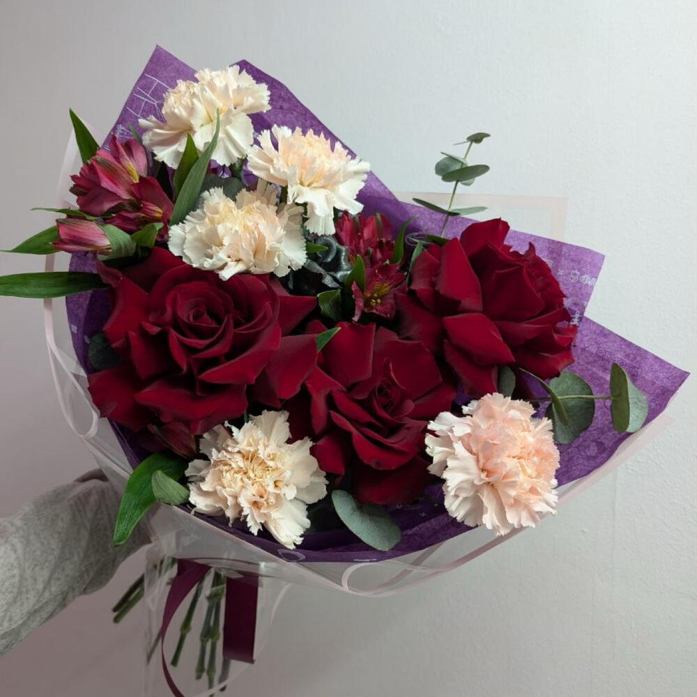 Альстромерия - 2 шт. Диантус - 5 шт. Роза французская - 3 шт. Эвкалипт Микс - 4 шт. Брендированная открытка - 1 шт. брендированная лента - 1 шт. брендированная упаковка - 1 шт. металлическая роза - 1 шт.