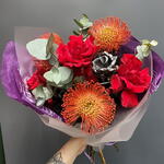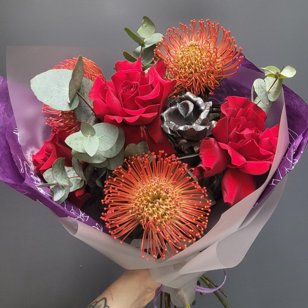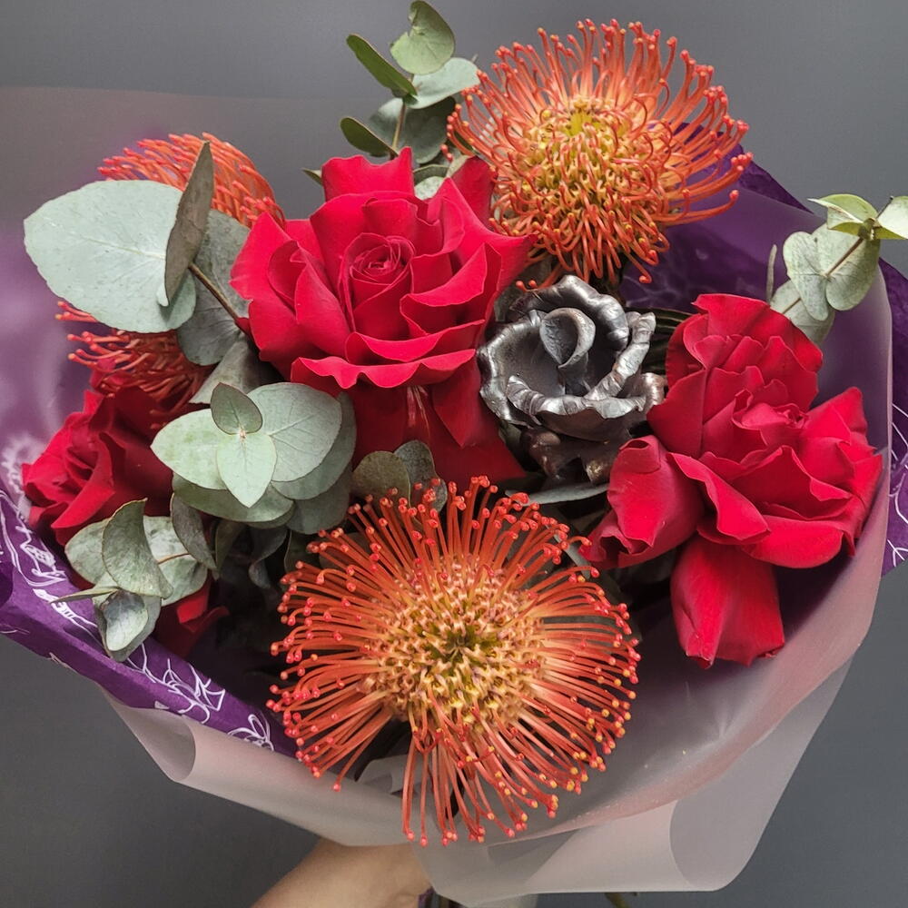 Упаковка дизайнерская - 3 шт. Роза французская - 3 шт. Эвкалипт пучок - 1 шт. Леукоспермум - 3 шт. роза кованая - 1 шт.