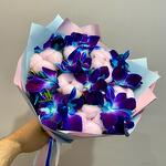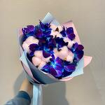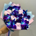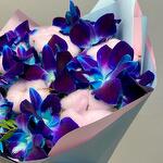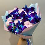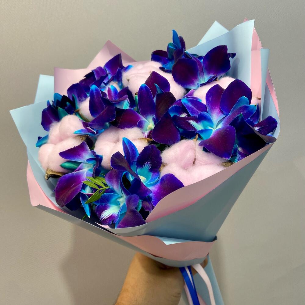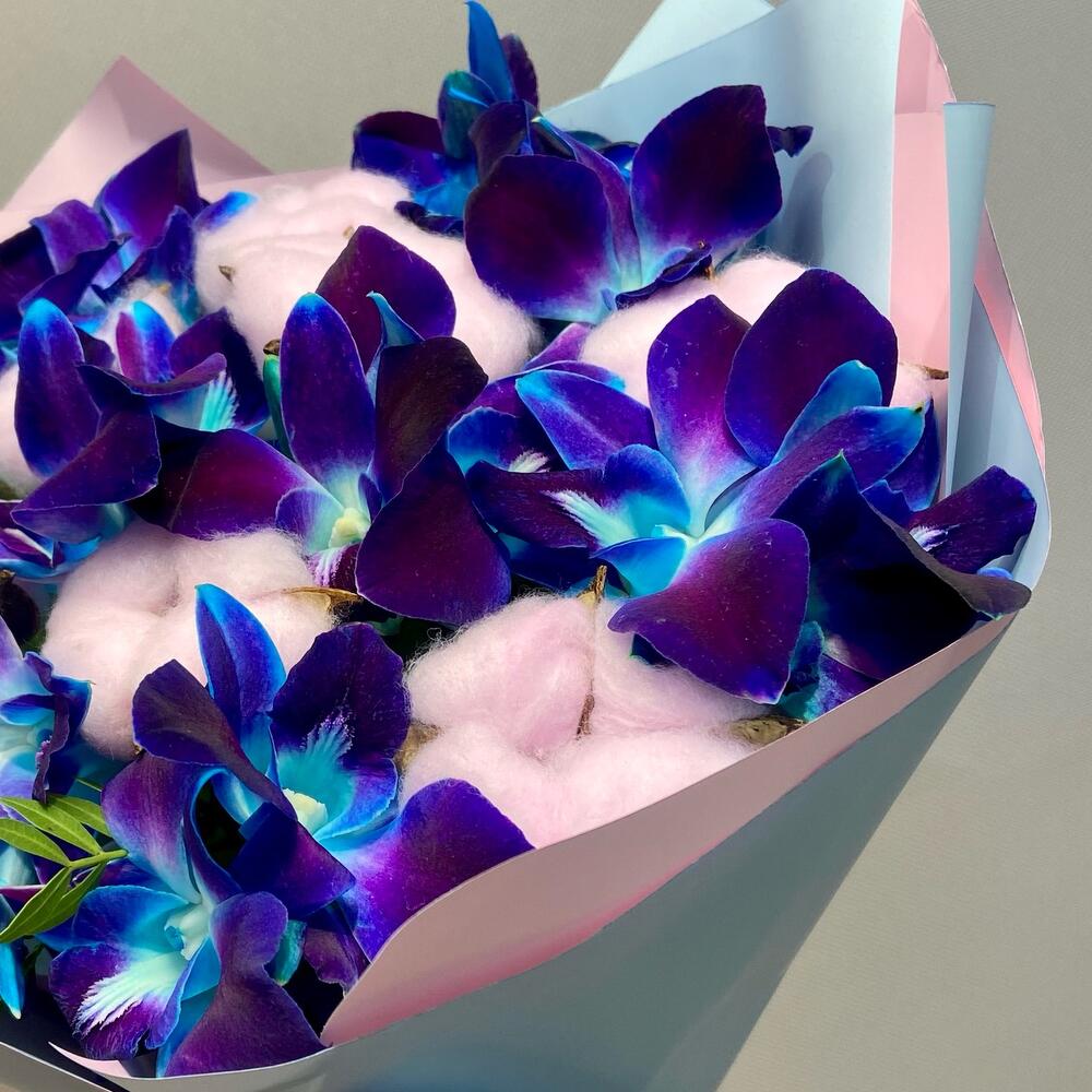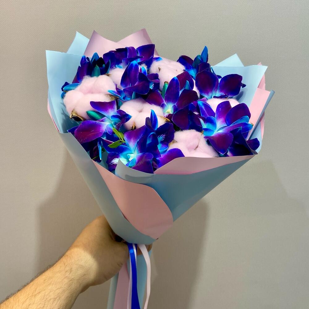 Писташ - 4 шт. Хлопок - 7 шт. Атласная лента - 2 шт. Орхидея дендробиум синяя - 9 шт. Дизайнерское оформление - 1 шт. открыточка с вашими пожеланиями (в подарок) - 1 шт.
