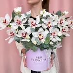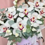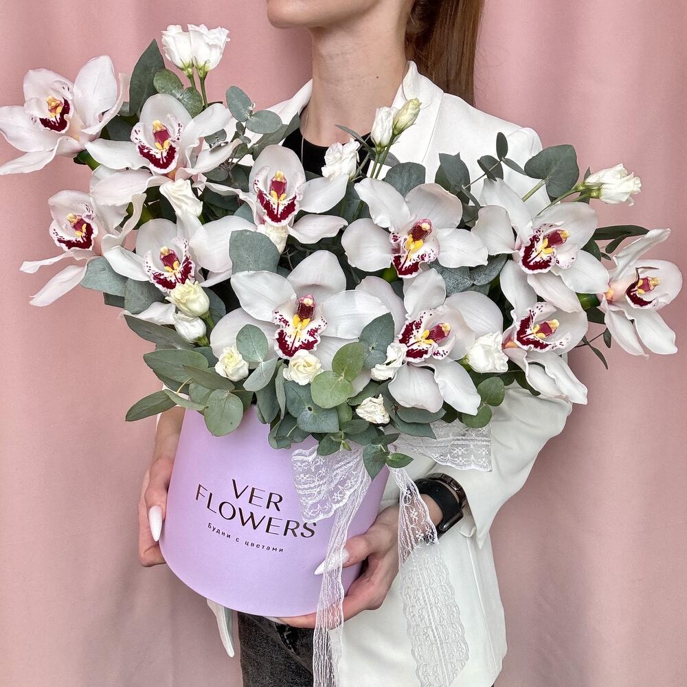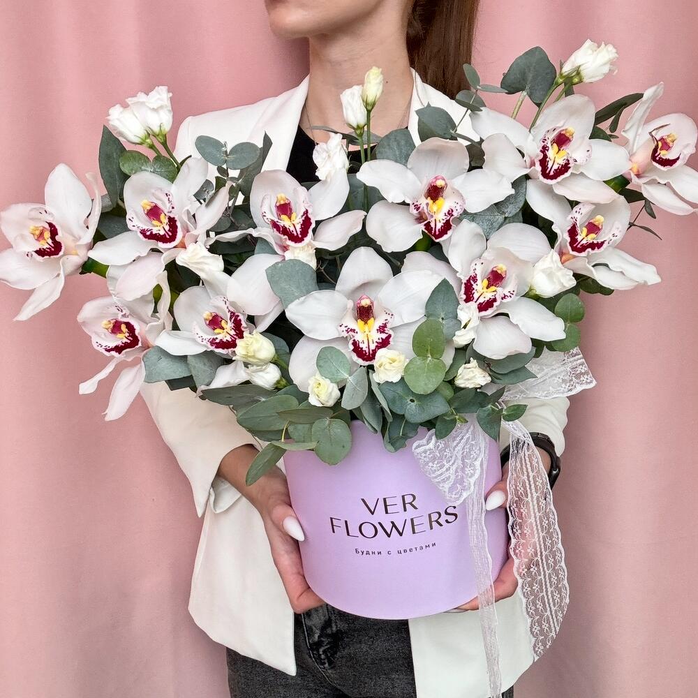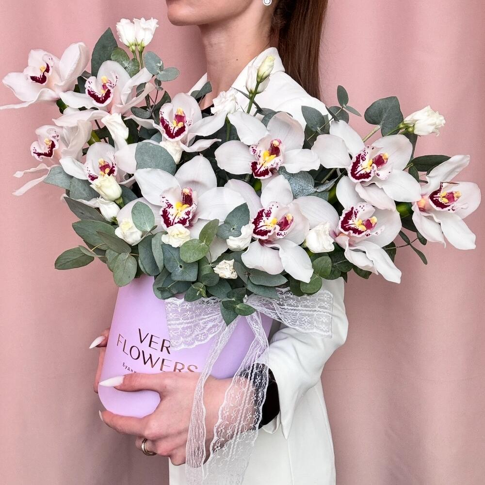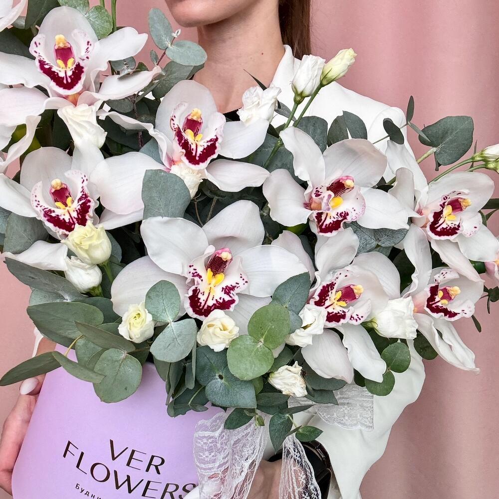 Орхидея Цимбидиум - 11 шт. Эвкалипт - 1 шт. Коробка - 1 шт. Оазис флористический - 1 шт. эустома белая - 2 шт.