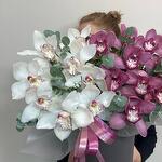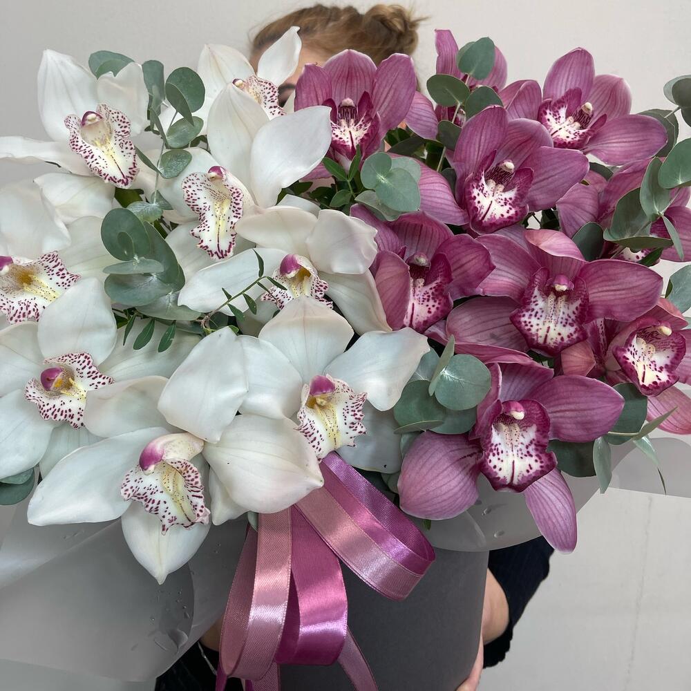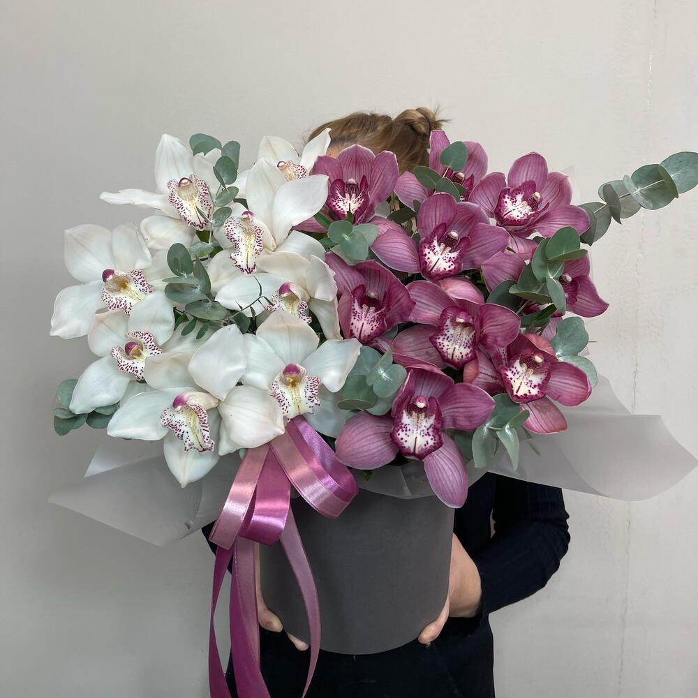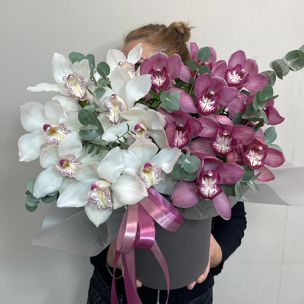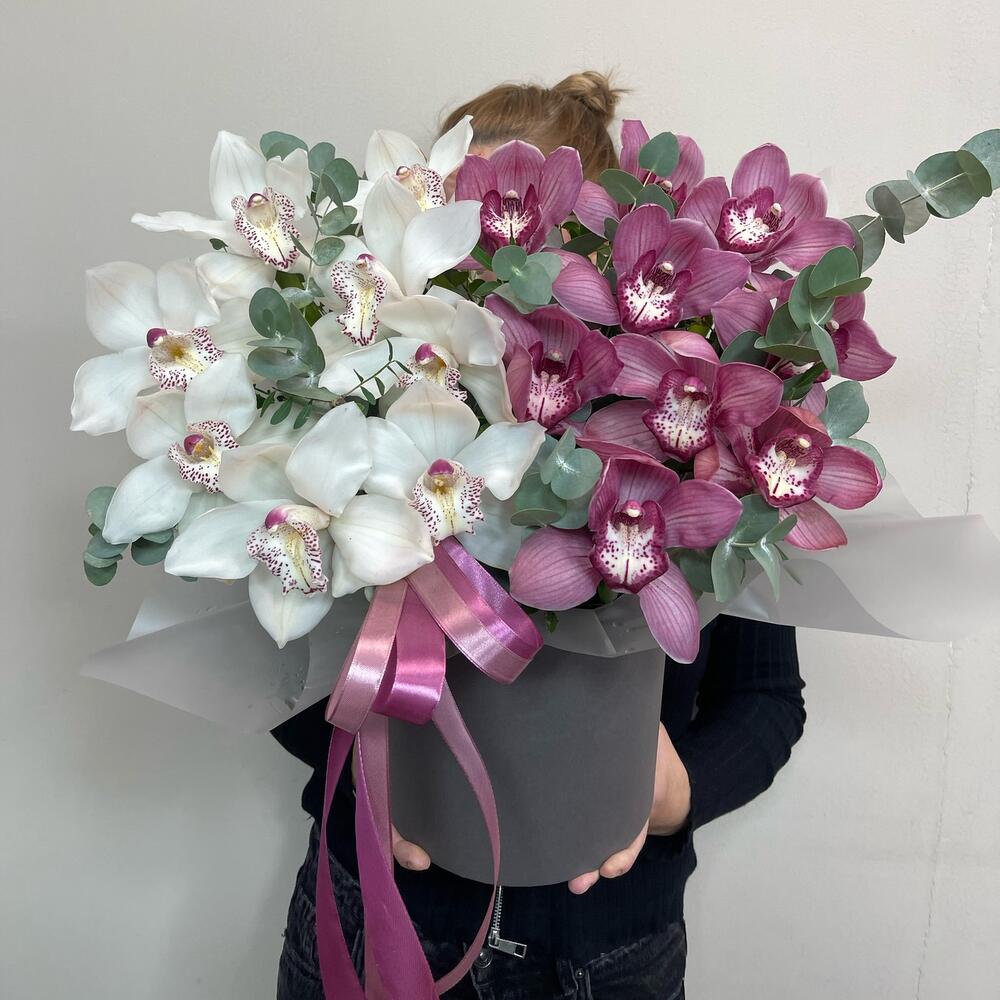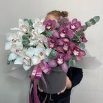 Коробка шляпная - 1 шт. Орхидея Цимбидиум розовая - 8 шт. Орхидея Цимбидиум белая - 9 шт. Эвкалипт Baby Blue - 10 шт. бант атласный - 1 шт. удлинители для цветов - 17 шт.
