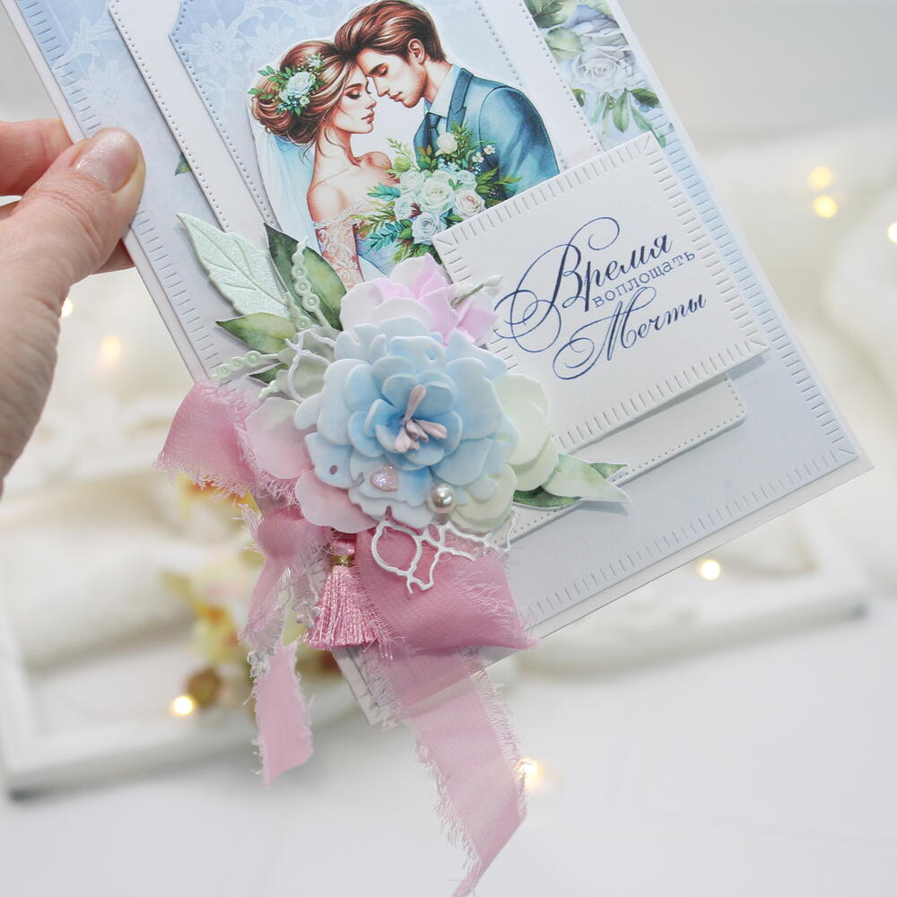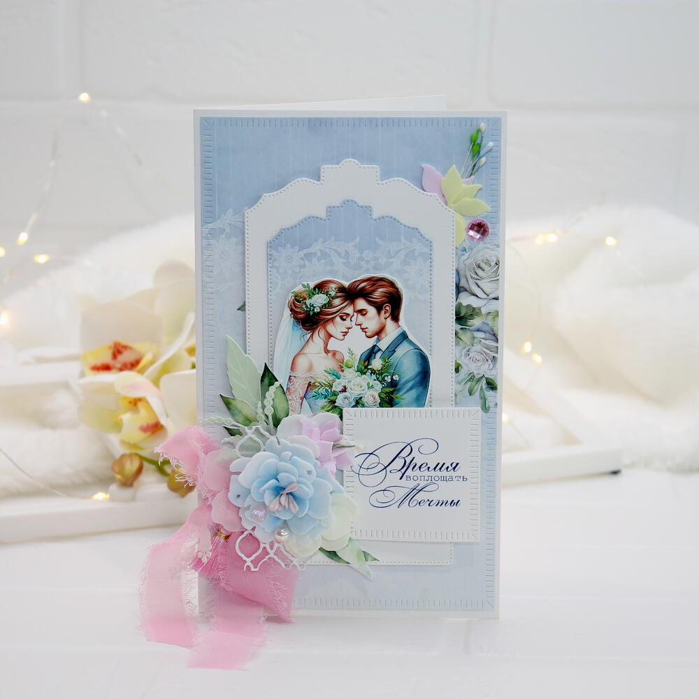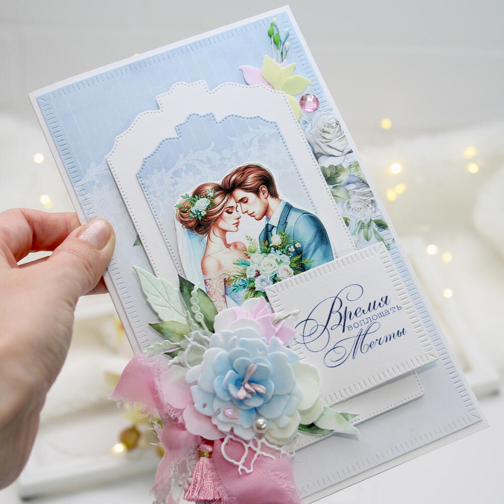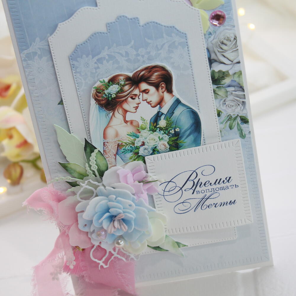 Эта свадебная открытка — само воплощение нежности и романтики. Сочетание небесно-голубого цвета с розовыми акцентами выглядит очень свежо и благородно, а надпись «Время воплощать мечты» делает её идеальным напутствием для молодоженов. Пусть главная мечта станет реальностью... ✨💍 Свадьба — это день, когда рождается новая Вселенная. И поздравление для такого события должно быть особенным, хранящим тепло ваших слов и изысканность момента. В этой открытке от Angel-Scrap я соединила всё самое нежное: 🤍 Сюжет: влюбленная пара в окружении цветов — символ начала долгого и счастливого пути. 🌸 Детали: пышный многослойный цветок ручной работы, словно сошедший с платья невесты, и воздушная лента из шифона, добавляющая работе легкости. ✨ Акценты: сияющий кристалл и изящные вырубные рамки создают ощущение многогранности и глубины. Надпись «Время воплощать мечты» — это не просто фраза, а девиз для новой семьи. Подарите молодоженам не просто открытку, а первый экспонат в их семейном архиве ценностей. 🕊️