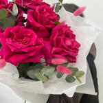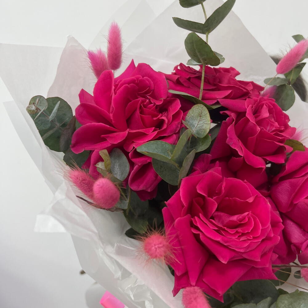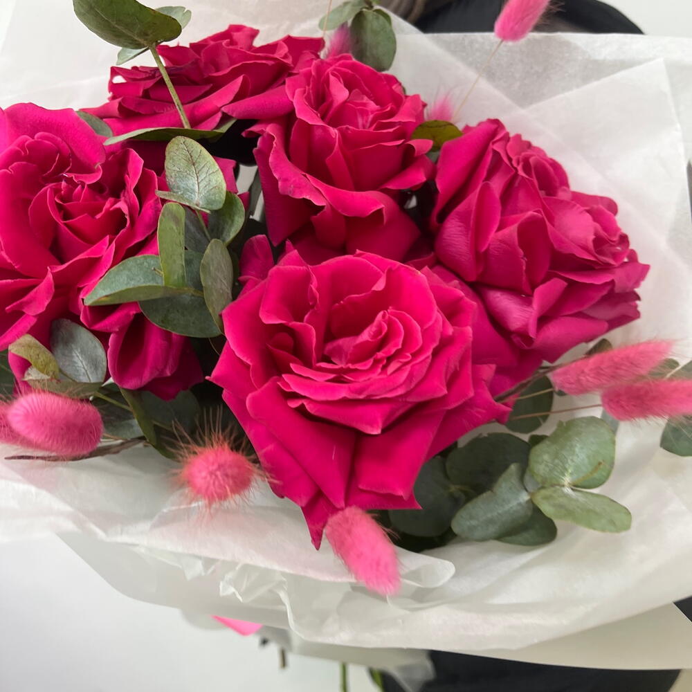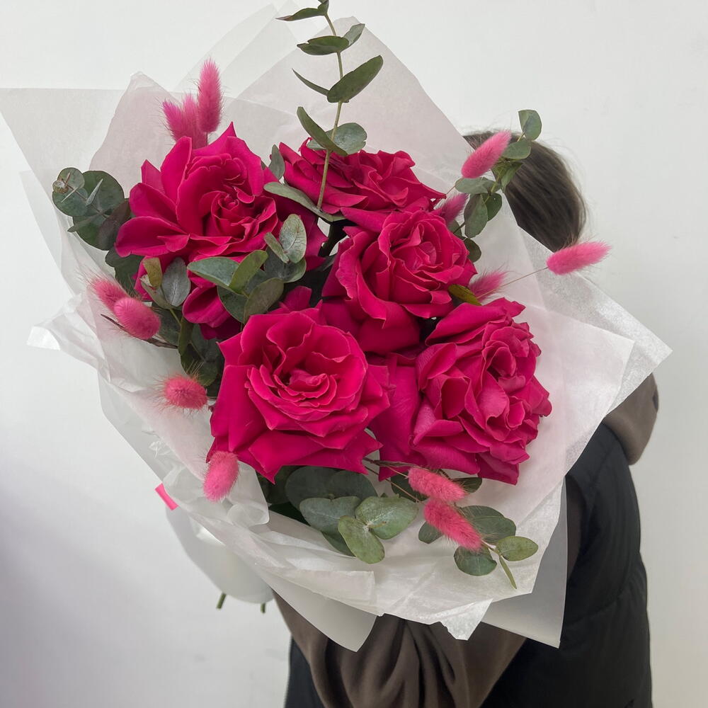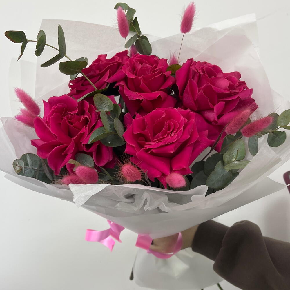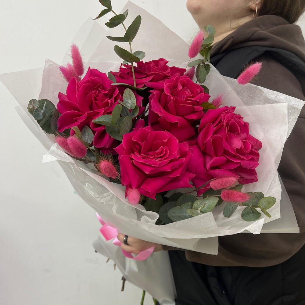 Лента атласная - 1 шт. Тишью - 5 шт. Упаковка дизайнерская - 5 шт. Роза французская - 5 шт. Лагурус - 15 шт. Эвкалипт Цинерея - 2 шт.