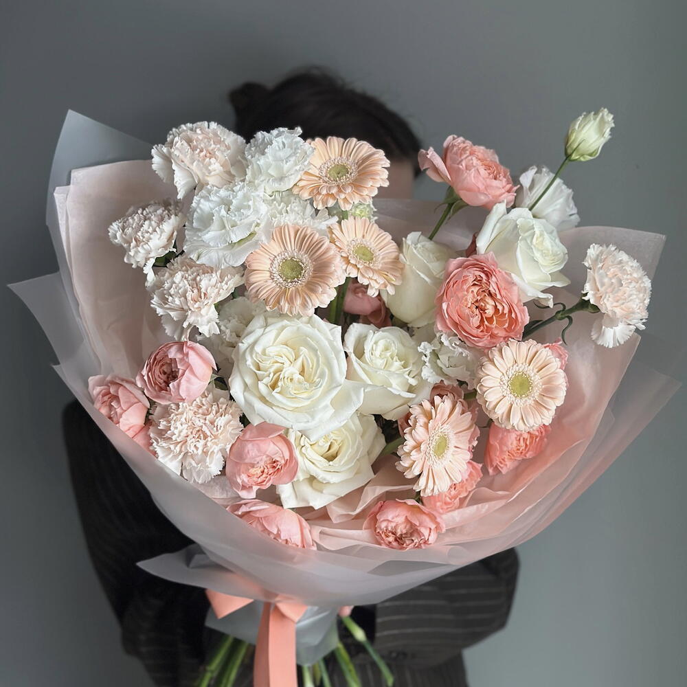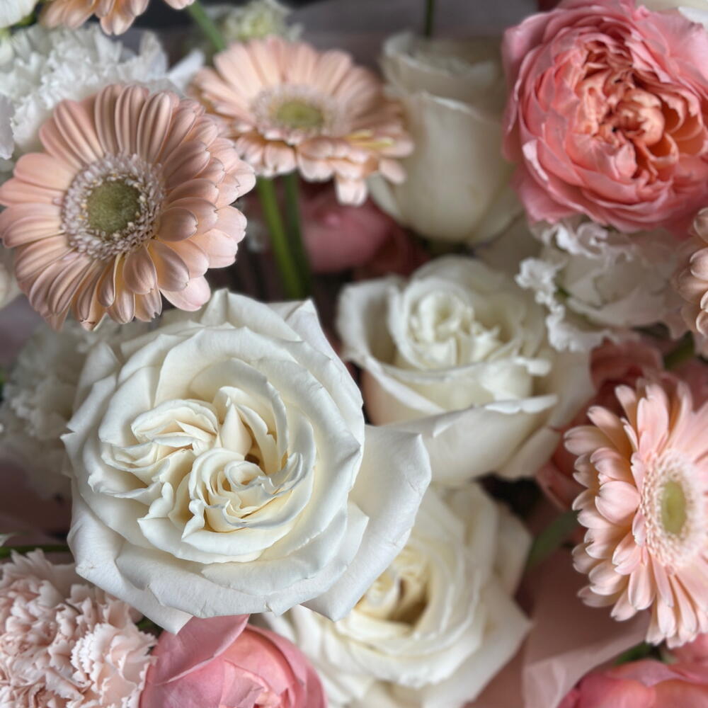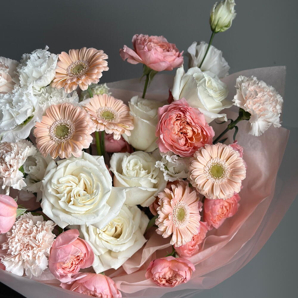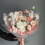 Нежный букет из розовых кустовых роз Джульетта, белых роз Плайя и белоснежной эустомы. Очень уютный и женственный букет, который можно подарить по любому поводу коллеге, маме, подруге или любимой. Цветы - это живые и хрупкие создания. Чтобы они радовали Вас дольше не забывайте ежедневно ухаживать за композицией 💚 Оформляя заказ у нас Вы выбираете уникальность, качество, заботу и быструю бережную доставку цветов до адреса Вашего близкого человека по любому случаю, будь то день рождения, профессиональный праздник, торжество или комплимент без повода. В нашей цветочной мастерской Вы найдёте богатый выбор букетов, композиций, корзин и шляпных коробок с такими цветами как французская роза, ранункулюс, гортензия, хризантема, гвоздика (диантус), гербера, кустовая и пионовидная роза, которым аккомпанирует эвкалипт, молюцелла, вибурнум, писташ. В состав наших букетов и композиций входят самые интересные сорта из Голландии, Италии, Эквадора, Колумбии и других плантаций разных стран, а также локальные фермерские цветы премиального качества, которые смогут выразить Ваши самые глубокие, тëплые или смелые чувства.
