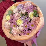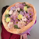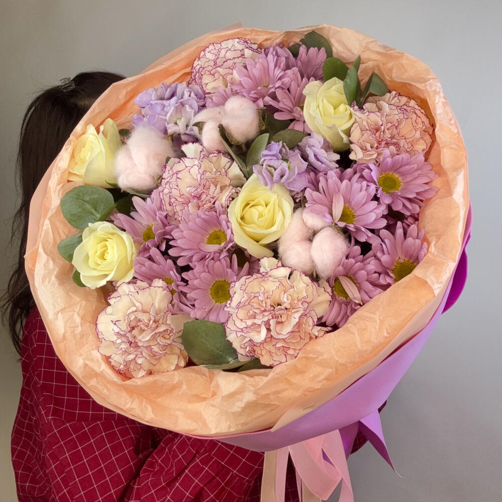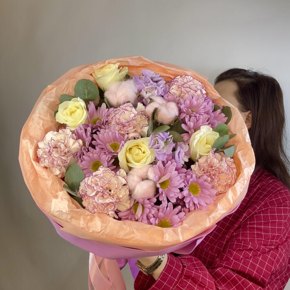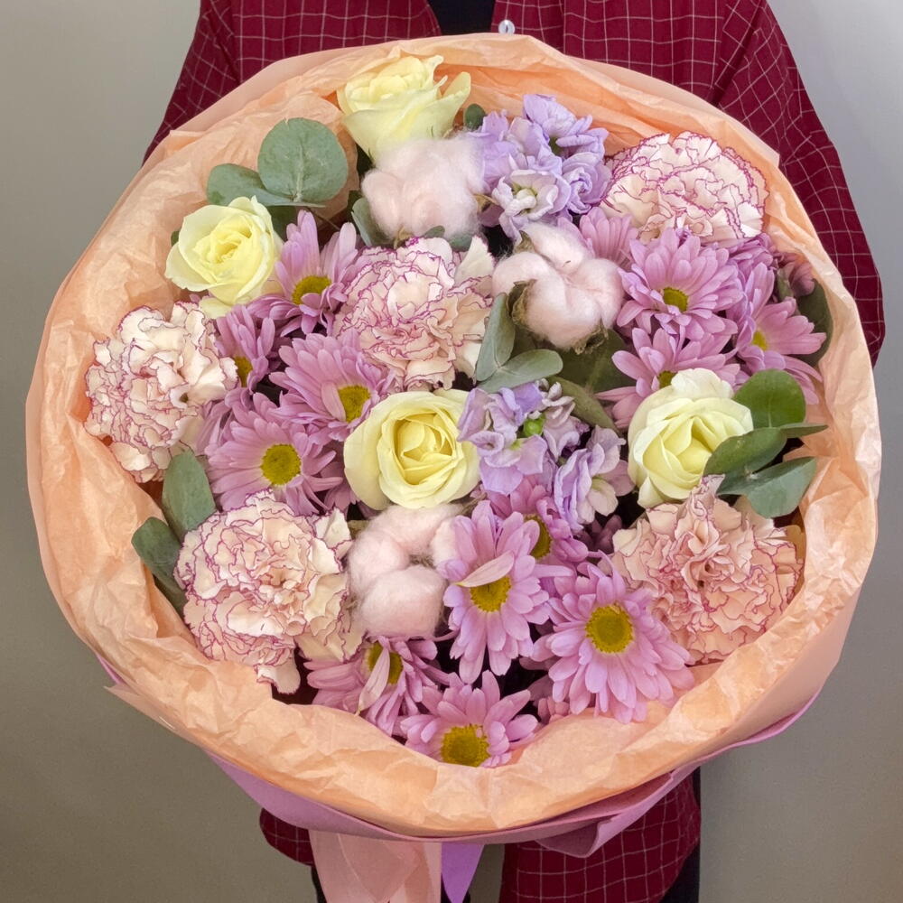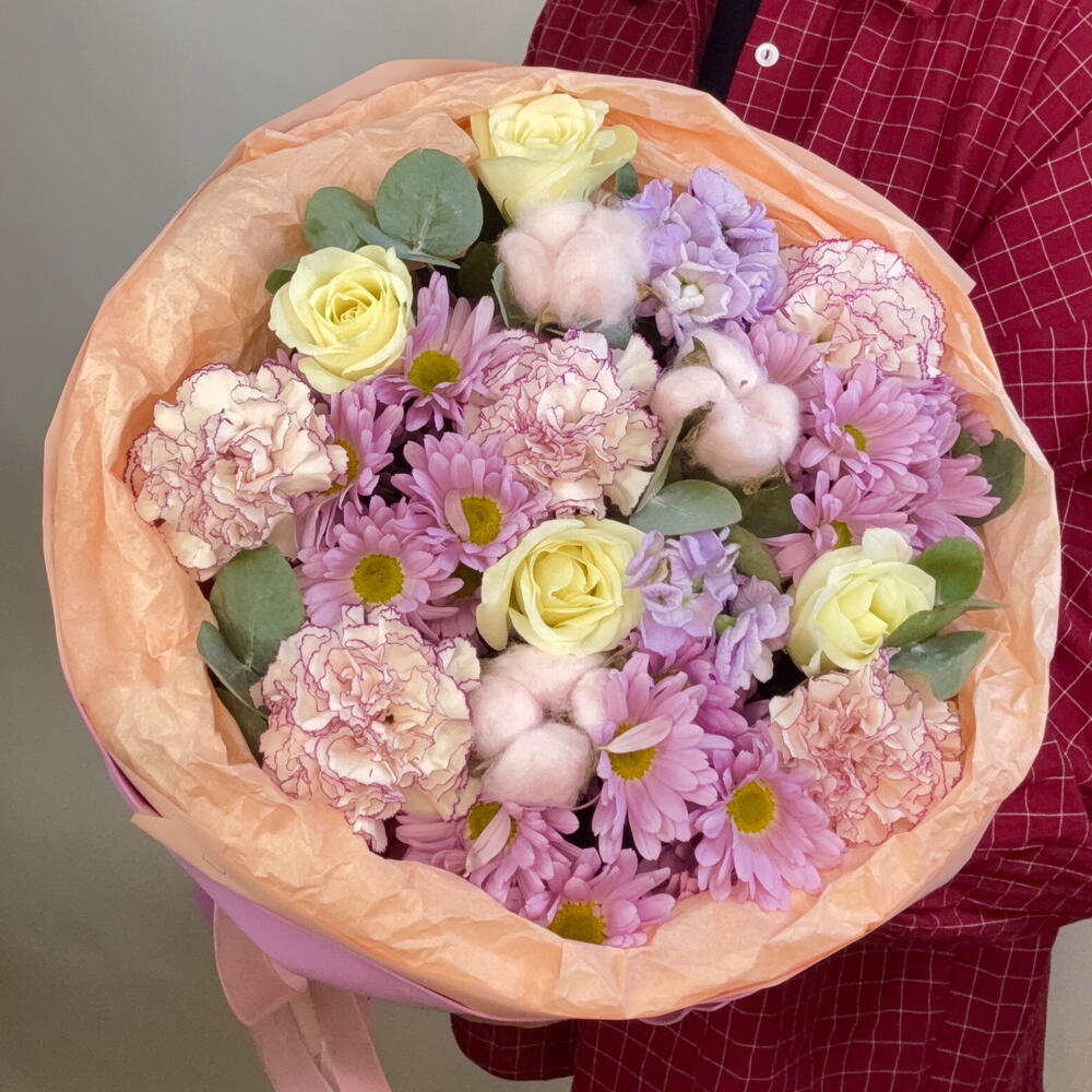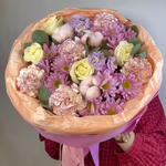 Маттиола - 2 шт. Хлопок - 3 шт. Хризантема кустовая - 3 шт. Роза - 5 шт. Лента атласная - 3 шт. Тишью - 3 шт. Диантус - 5 шт. Пленка матовая - 2 шт. Эвкалипт Микс - 3 шт. Фоамиран - 5 шт.