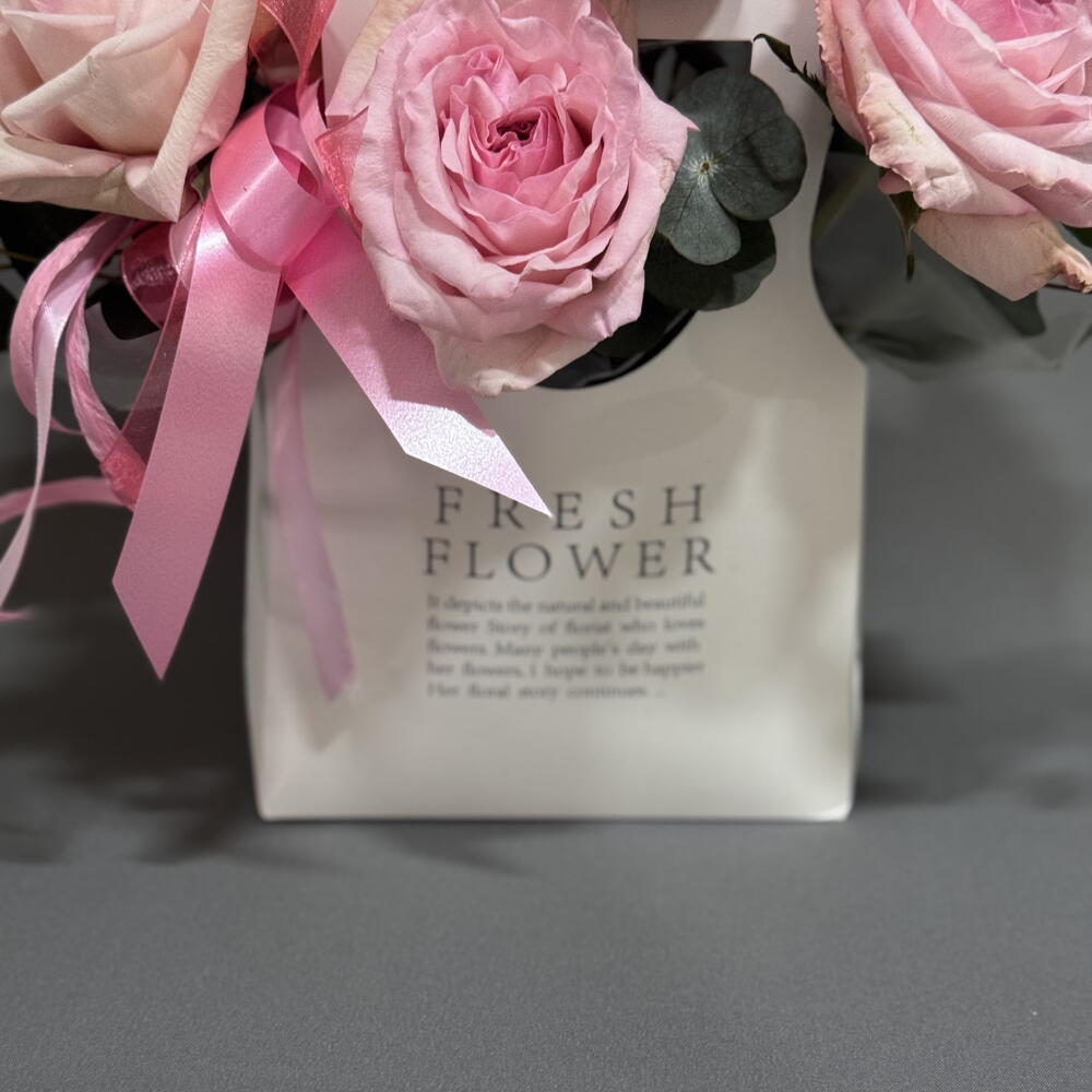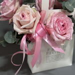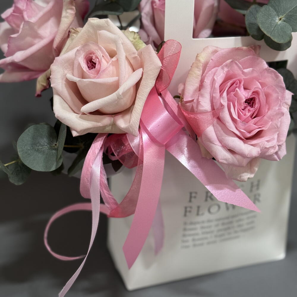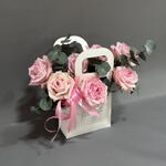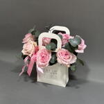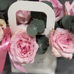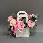 Лента атласная - 2 шт. Сумочка - 1 шт. Эвкалипт Микс - 1 шт. Сумочка картонная - 1 шт. роза pink o'hara(ароматная) - 7 шт.