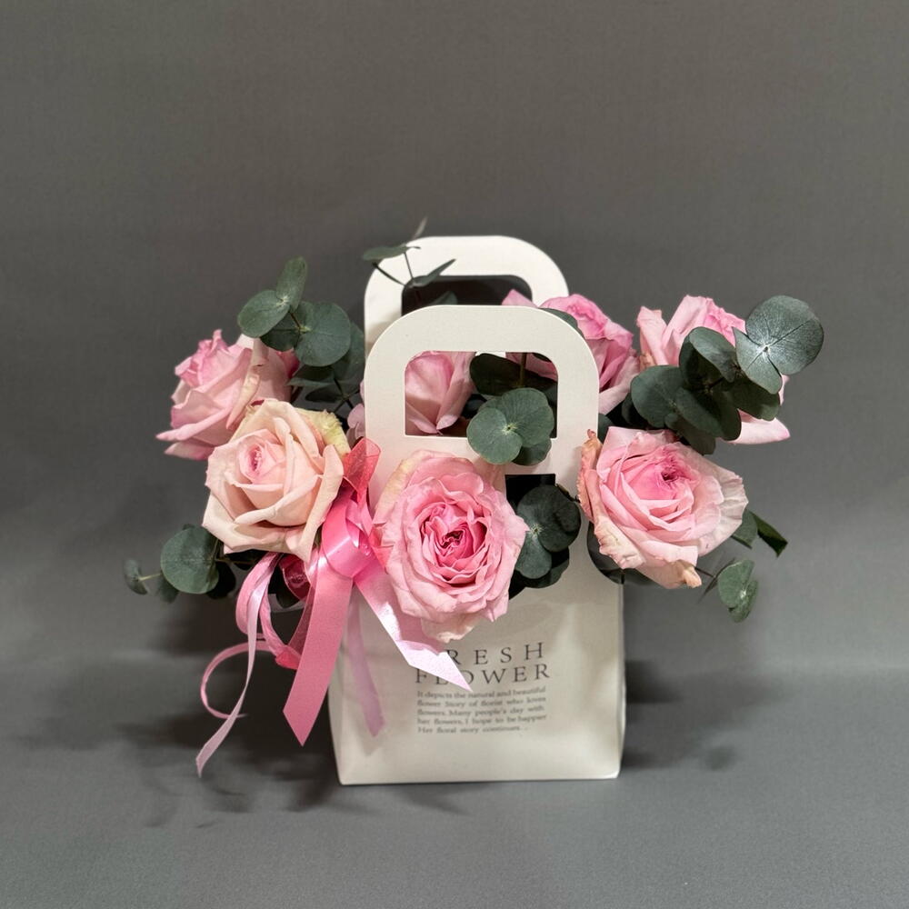 Нежная цветочная сумочка в романтичном стиле, выполненная в светлом минималистичном боксе с удобными ручками. Композиция собрана из изящных роз мягких розовых оттенков, дополнена свежей эвкалиптовой зеленью, что придаёт ей лёгкость и утончённость. Завершает образ аккуратный атласный бант в тон, добавляющий подарку особую нежность и шарм. Идеально подойдёт как комплимент, знак внимания, подарок на день рождения, свидание или просто чтобы порадовать близкого человека 🌸