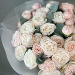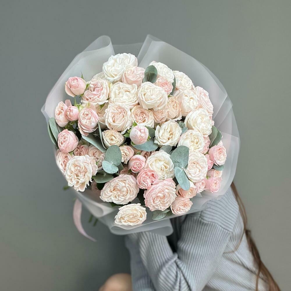 Пышный авторский букет из кустовых пионовидных роз. роскошных кустовых роз с множеством шелковистых лепестков, дополненные ажурным эвкалиптом, создают образ нежной и объемной композиции. Букет излучает тепло и уют, даря ощущение мягкой романтики и искренней заботы. Каждая изготавливаемая флористом цветочная композиция является уникальной и внешним видом, размером и оттенками цвета. Наши композиции составляются из свежих цветов, а флористы предпринимают все усилия для того, чтобы цвет и форма цветочной работы как можно полнее соответствовали иллюстрации на фото. Инструкция по уходу за букетом: Живые цветы требуют ежедневного ухода и смены воды. Стебли цветов подрезаются ножом или секатором. Вазу с цветами держат подальше от прямых солнечных лучей и отопительных приборов. Подкормка для растений продлит жизнь романтичному подарку. Идеальный подарок для мамы, жены, девушки, коллеги, учителя. Подойдет на праздники: 8 марта, 1 сентября, день учителя, 14 февраля, день матери, юбилей, свадьба, день рождения, именины.
